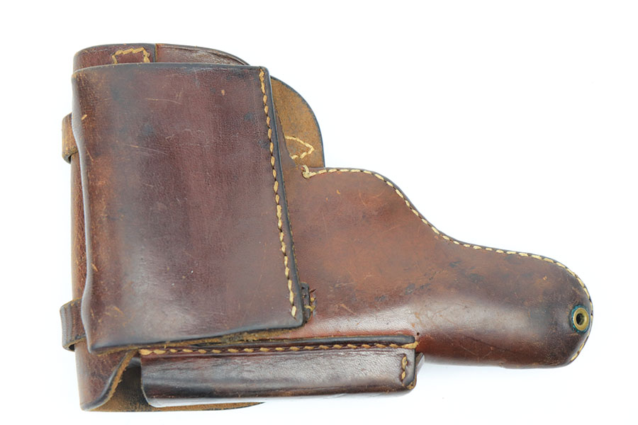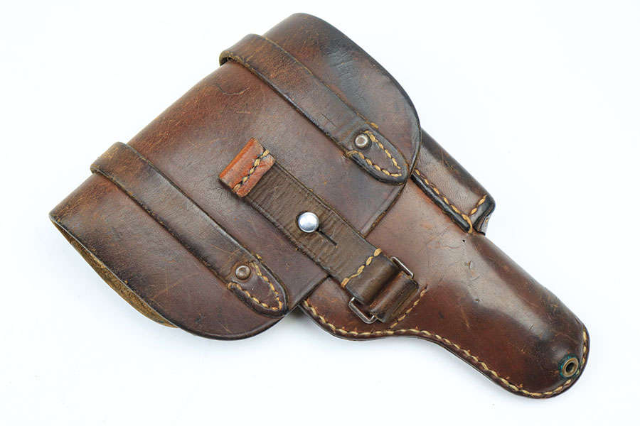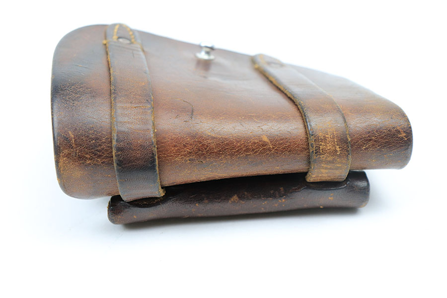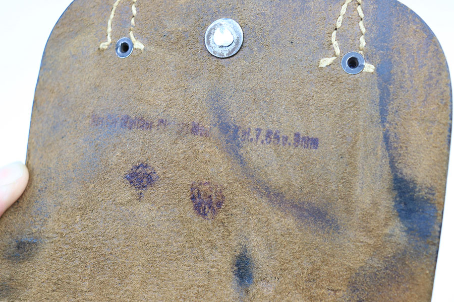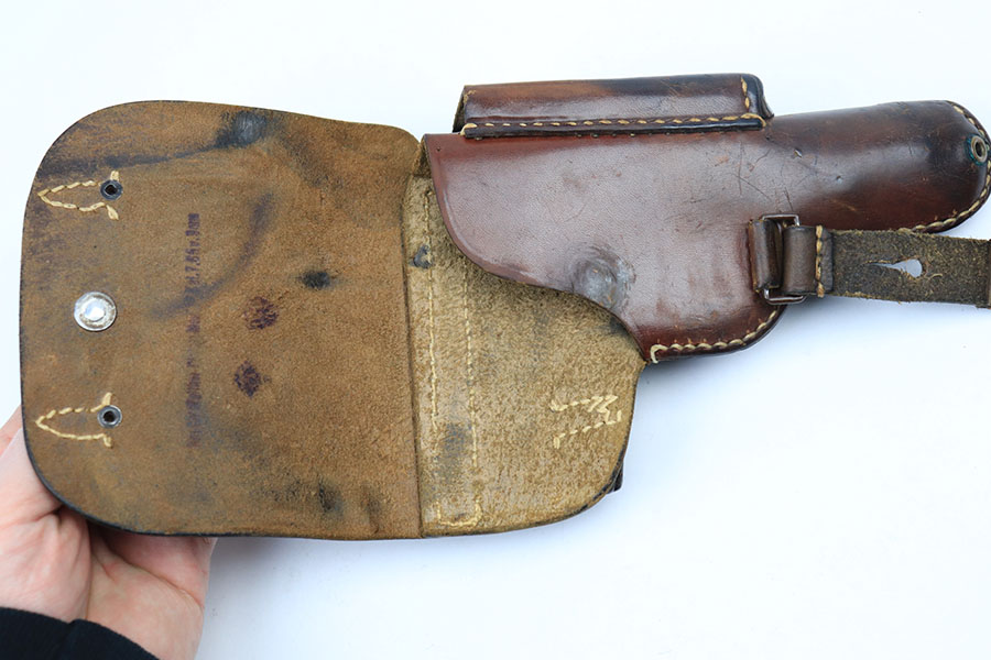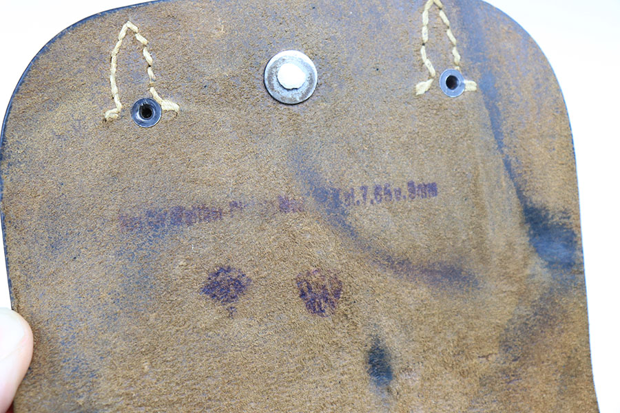 3/11/21 – This is an original Luftwaffe Walther PP holster. The holster is in great overall condition with nice leather and all original stitching. The leather shows some signs of honest wear and mild use but there’s no significant damage on the leather. The interior leather has an ink stamp that designates the holster is for a PP. This is hard to read, but one can easily see at the end of the stamp says “7.65mm” as well as “9mm”, and a Walther PP is the only luftwaffe pistol that came in two calibers. Therefore this must be a Luftwaffe PP holster.