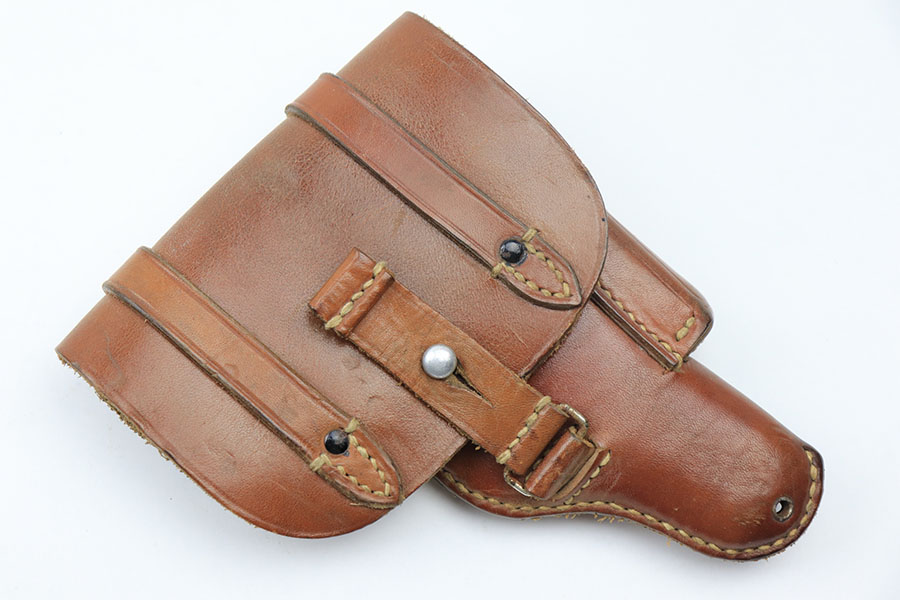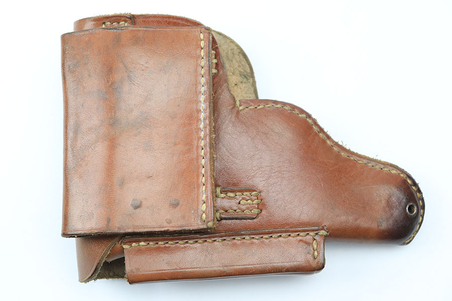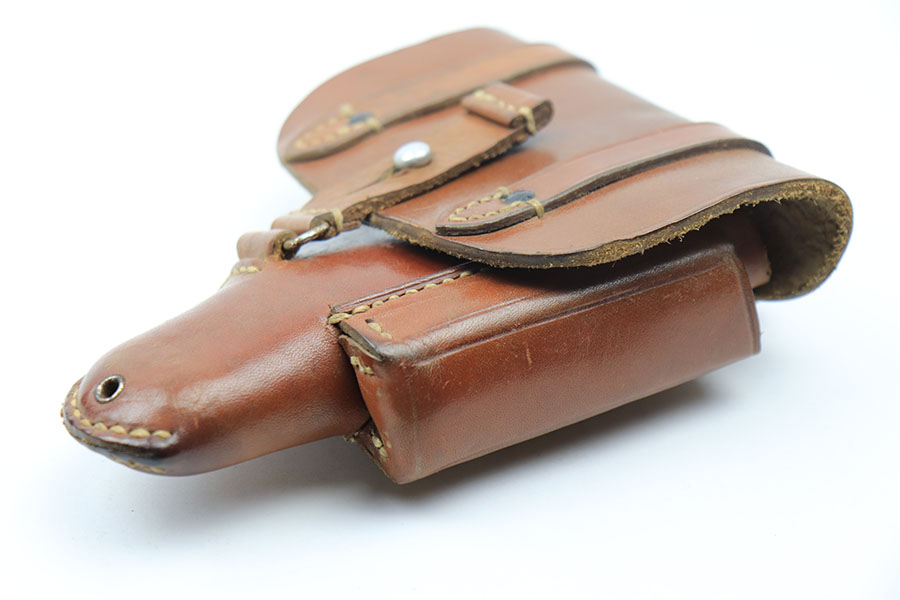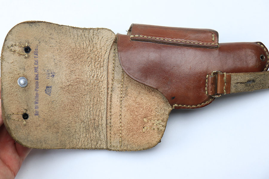 5/6/21 – This is a very rare & desirable Luftwaffe issued Walther PPK holster. The holster is dropping style with excellent, clean brown leather. The interior leather has a crisp ink stamp that indicates this holster is for a Walther PPK. Under that is a luftwaffe proof eagle stamp, hck maker stamp, and 41 date stamp. Typically these markings are very faint but they’re crisp on this example. Stitching is all original and intact.