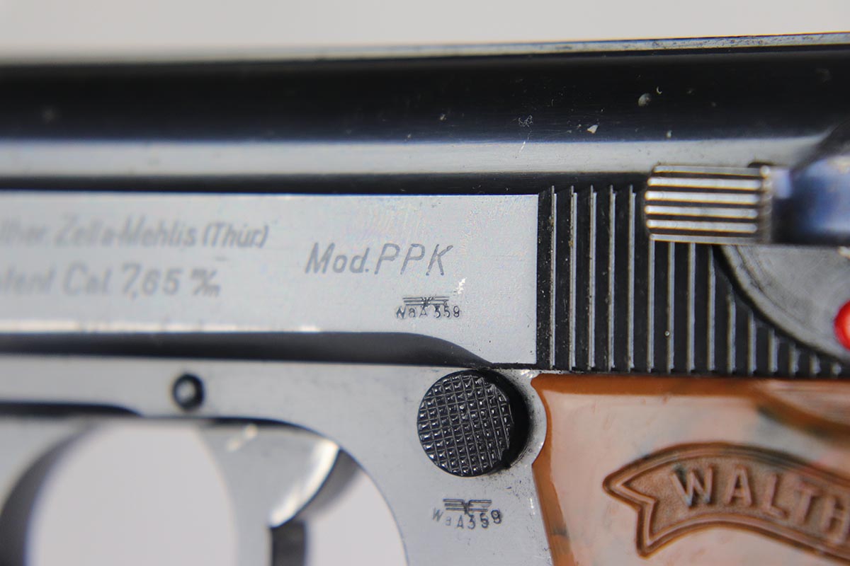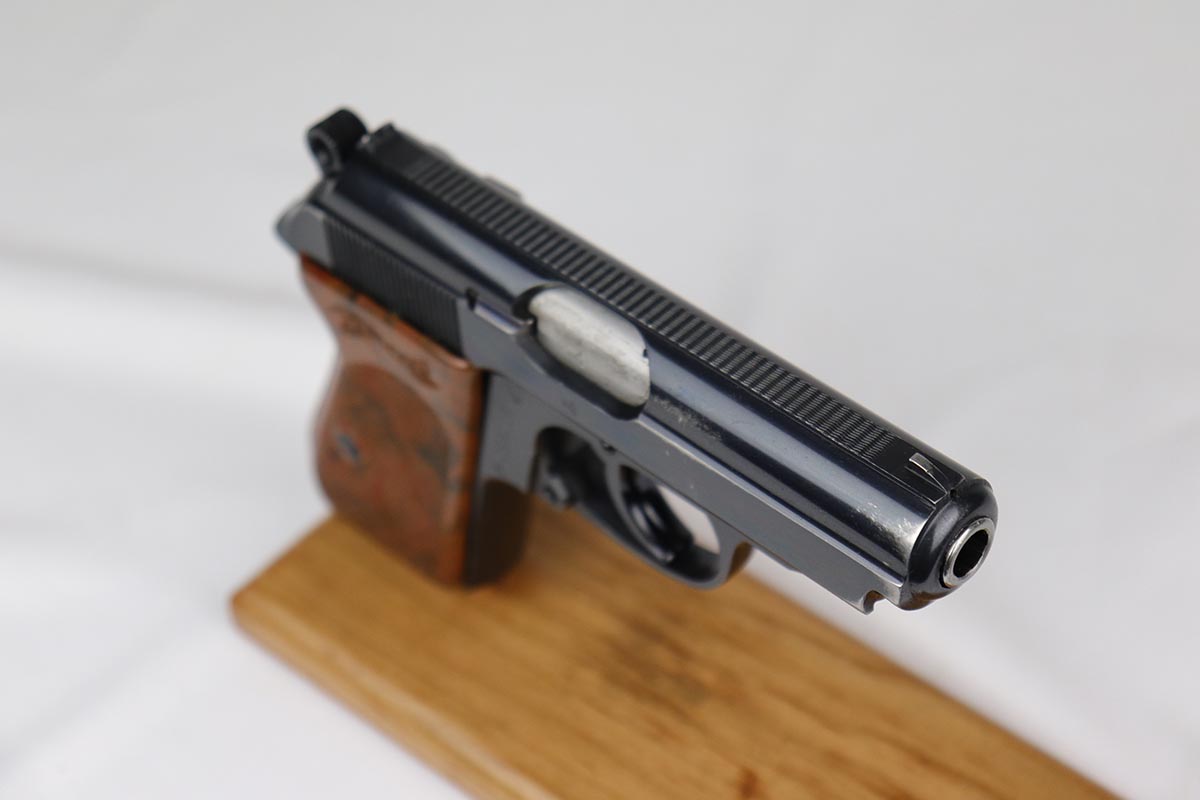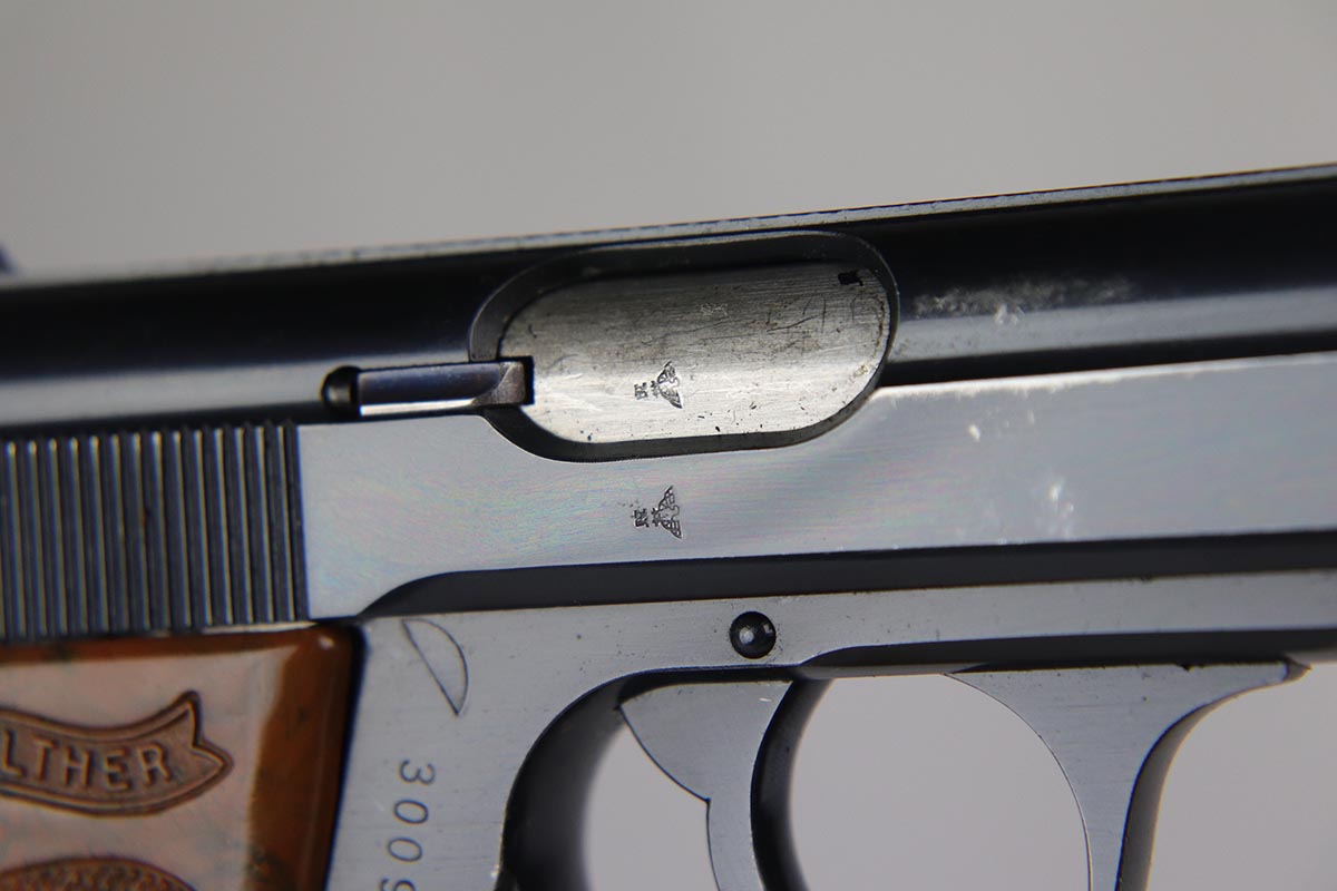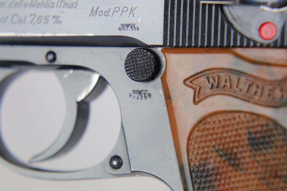 2/28/18 – This is an unbelievable find: a complete matching Walther PPK Luftwaffe procurement rig, waffenamted with two matching magazines and a Theuermann drop holster. This is an all original, all matching rig that retains about 95% of the bluing. The gun was part of the Luftwaffe procurement, most likely for the officer pilots. Both mags’ serials are absolutely original and are a textbook example of the Walther military magazine numbering. Excellent bore and grips. A scarce Theuermann drop holster is in excellent condition as well and without defects. A potential centerpiece of any WWII military handgun collection.