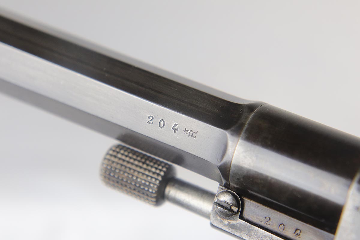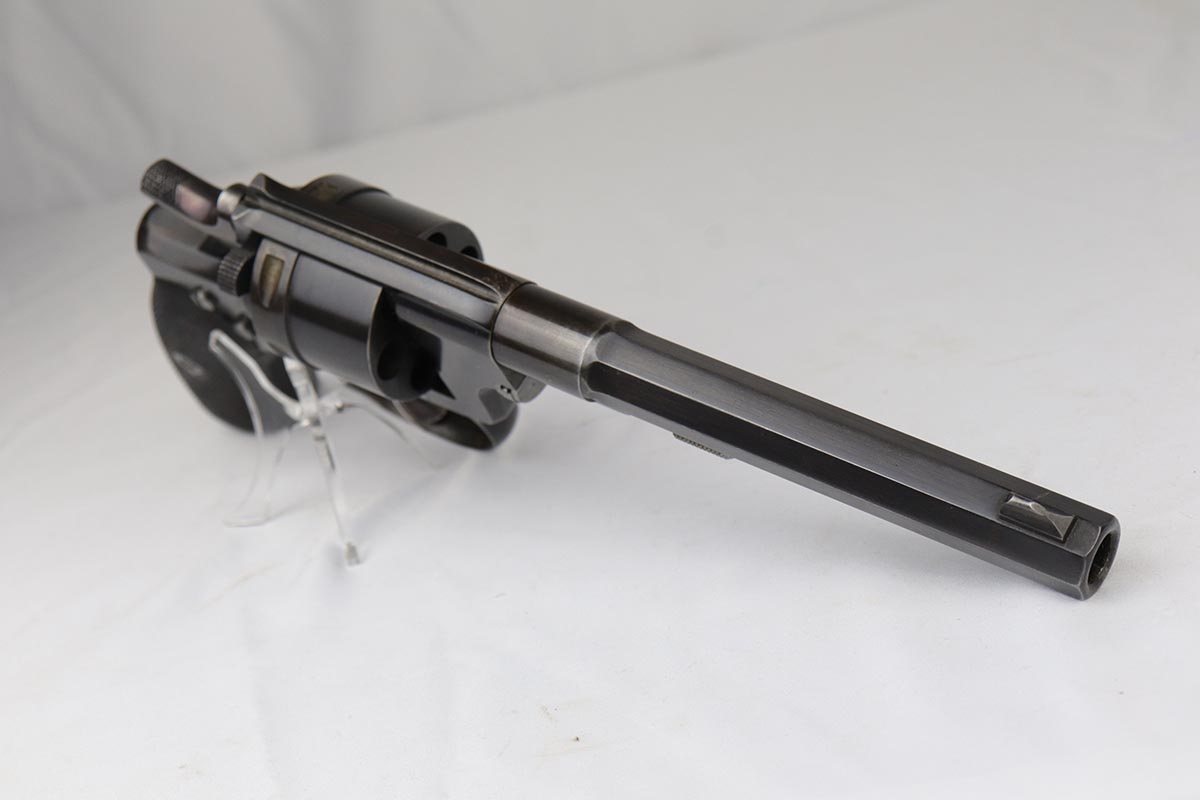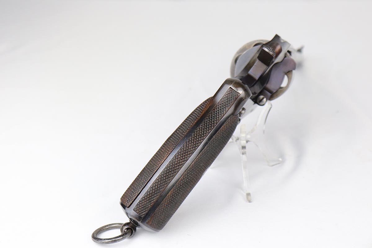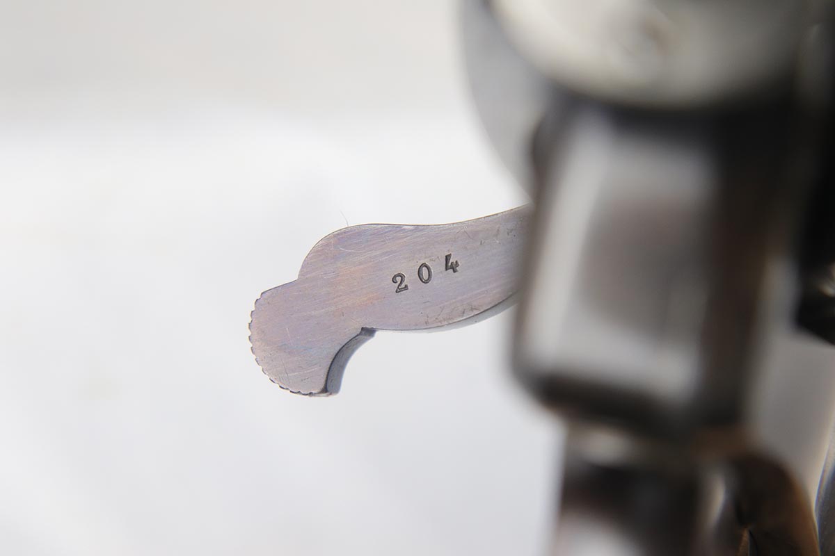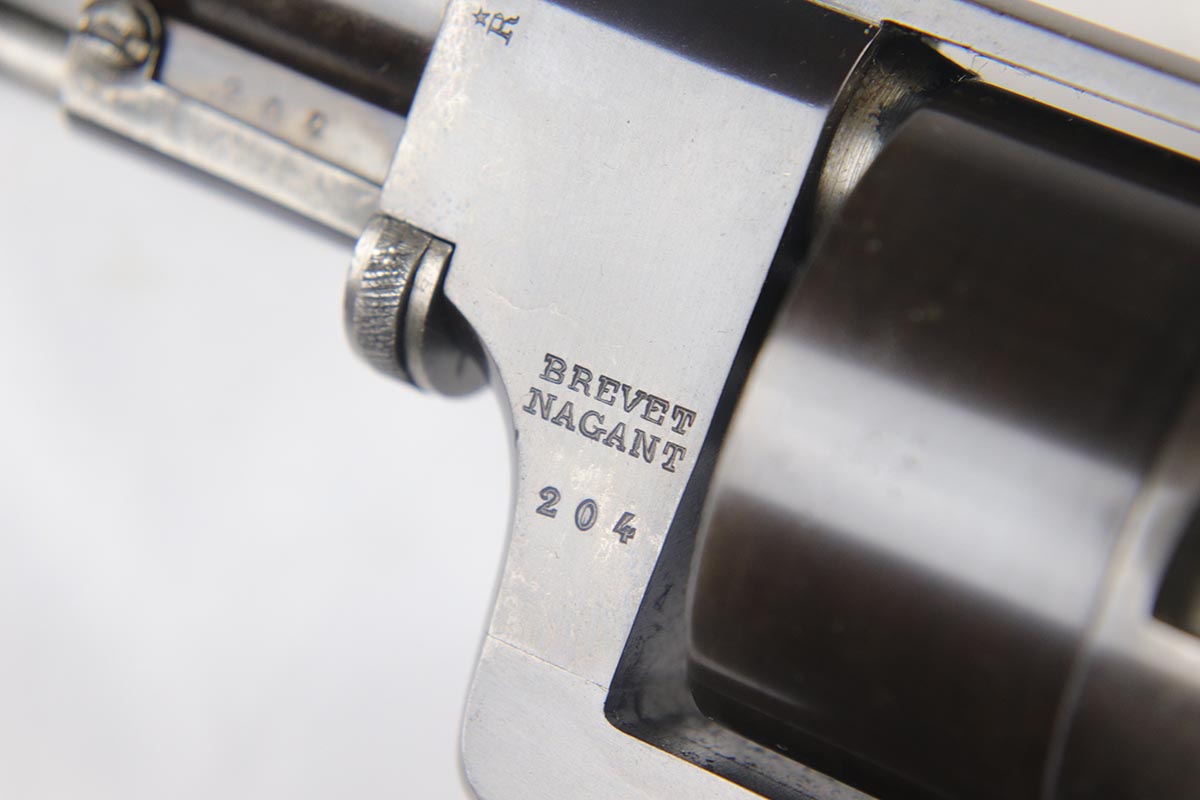9/13/18 – This is probably the rarest of the Nagant revolvers – a Luxembourg contract large frame revolver that was made in limited numbers. Some estimates put the total production at under 300 units. This one is an all matching gun, numbered 204. It retains over 90% of its original blue finish with some patination and holster wear present. These were the only revolvers that originally came with a small bayonet that was sleeved over the barrel right behind the front sight. Because of that, the front sight contour is very distinctive on Luxembourg contract revolvers – unlike that sights present on all the other Nagant. The gun is also marked with a large letter L in the frame under the right grip. Some straw is still present on the trigger, hammer and internal mechanism and springs. Excellent bore and grips. A very impressive and nearly impossible to find revolver, as only a few are known in existence.