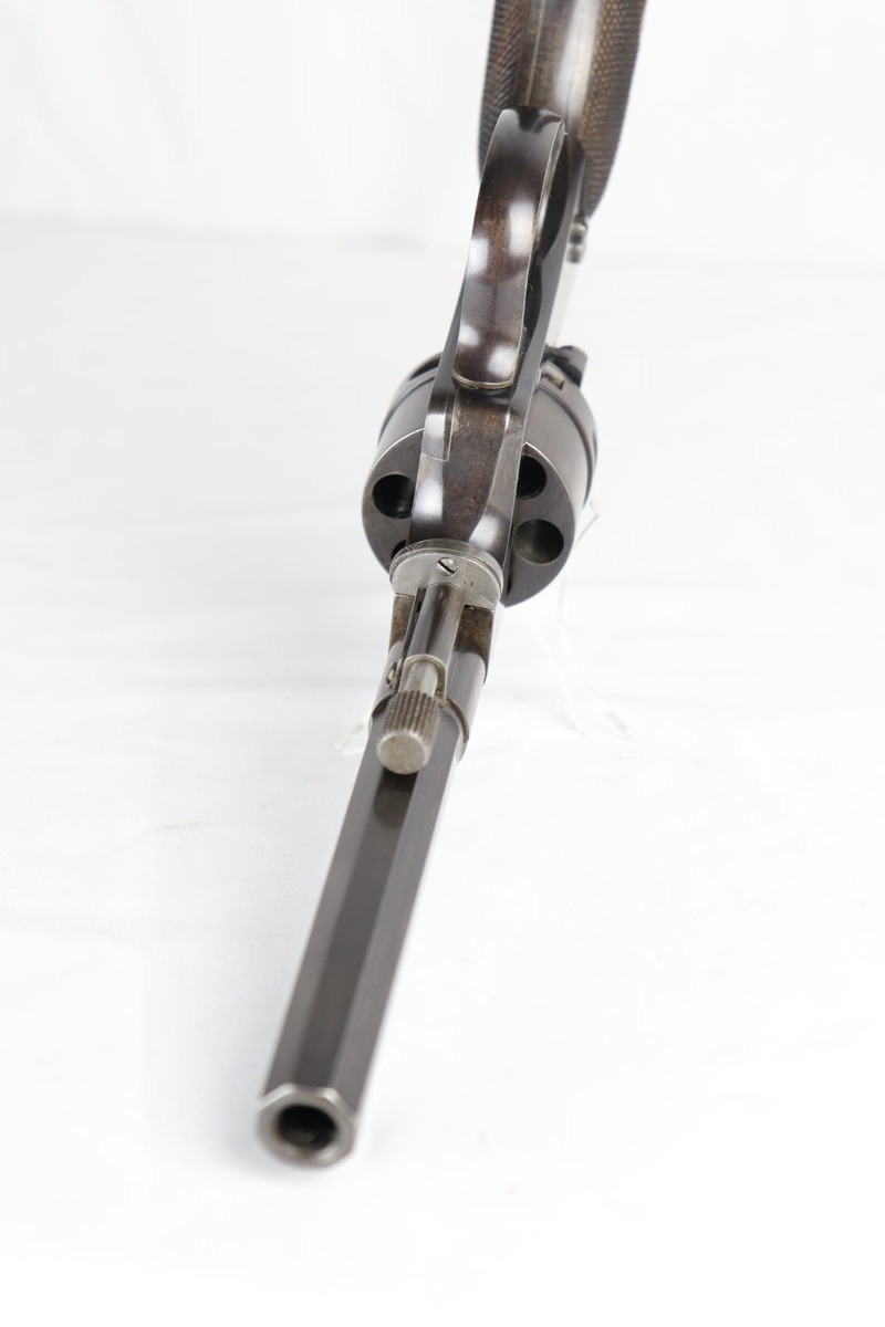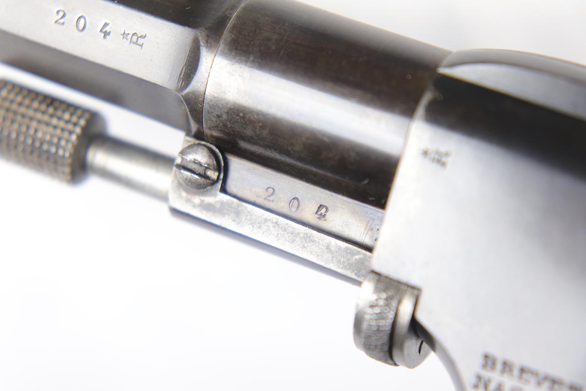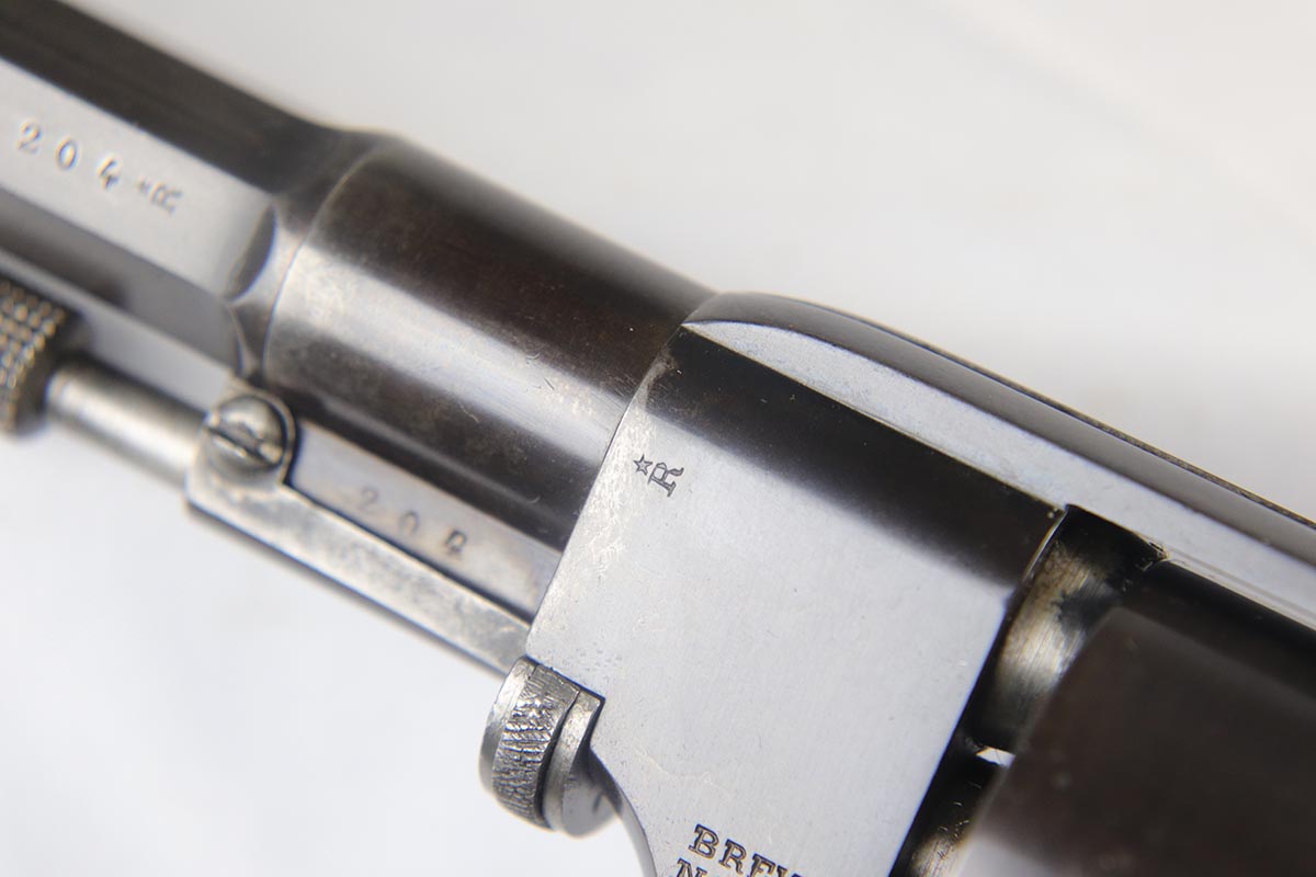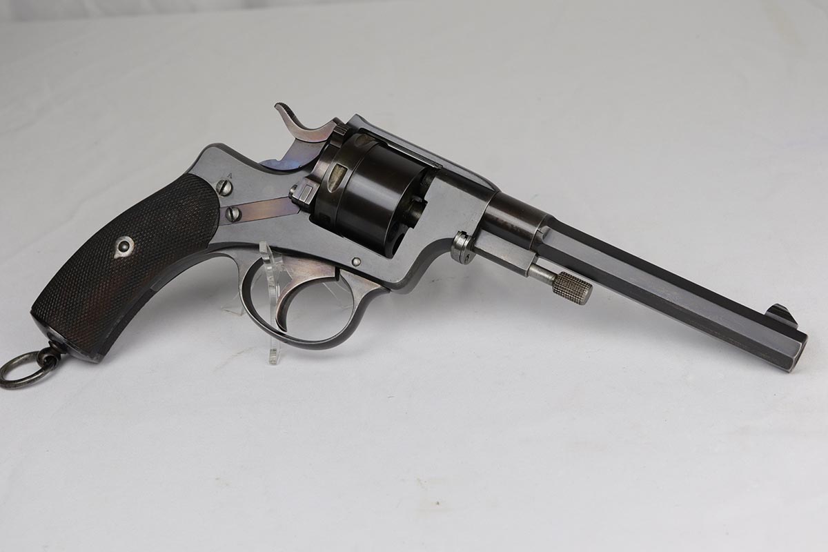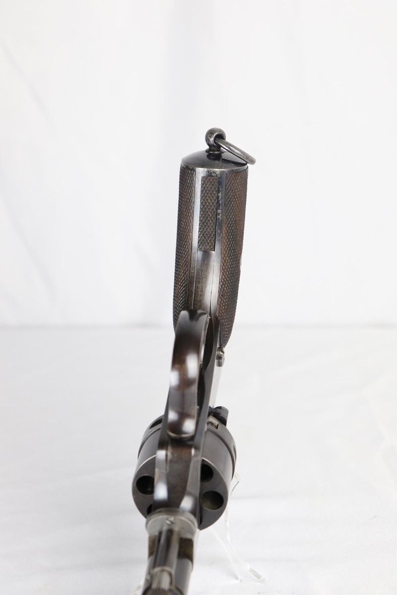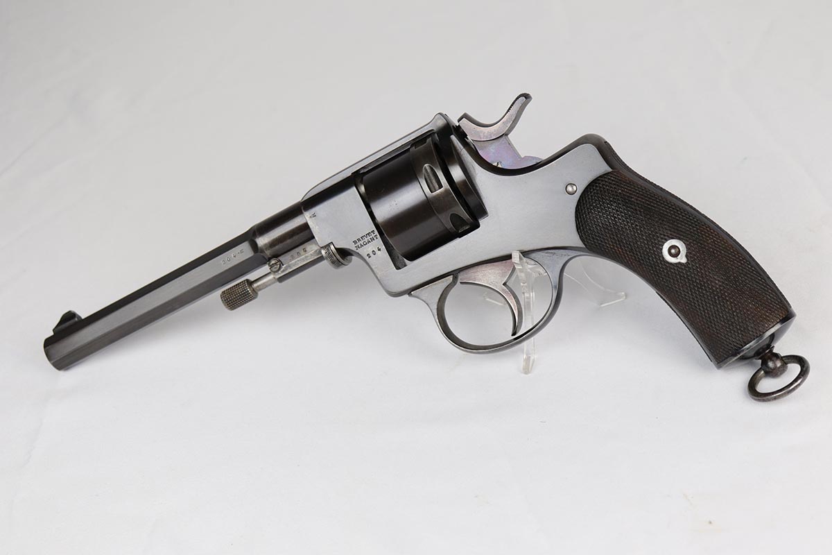 9/13/18 – This is probably the rarest of the Nagant revolvers – a Luxembourg contract large frame revolver that was made in limited numbers. Some estimates put the total production at under 300 units. This one is an all matching gun, numbered 204. It retains over 90% of its original blue finish with some patination and holster wear present. These were the only revolvers that originally came with a small bayonet that was sleeved over the barrel right behind the front sight. Because of that, the front sight contour is very distinctive on Luxembourg contract revolvers – unlike that sights present on all the other Nagant. The gun is also marked with a large letter L in the frame under the right grip. Some straw is still present on the trigger, hammer and internal mechanism and springs. Excellent bore and grips. A very impressive and nearly impossible to find revolver, as only a few are known in existence.