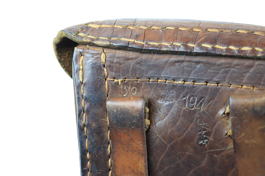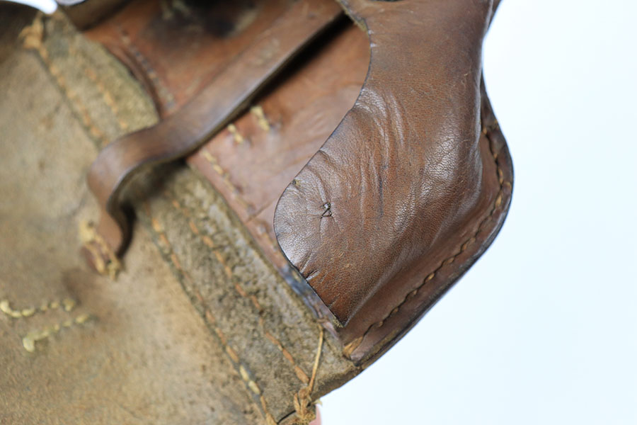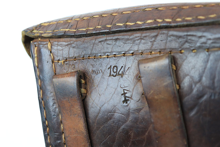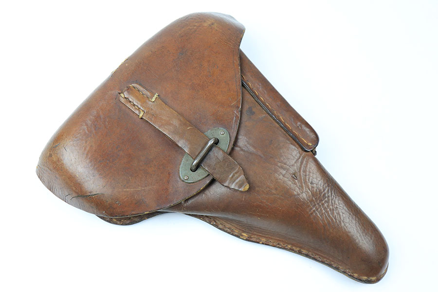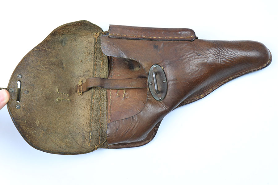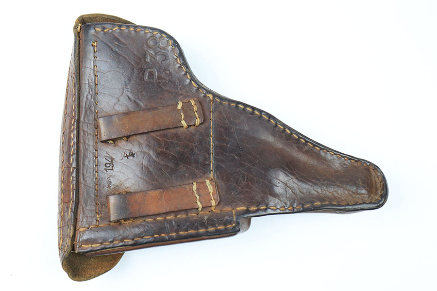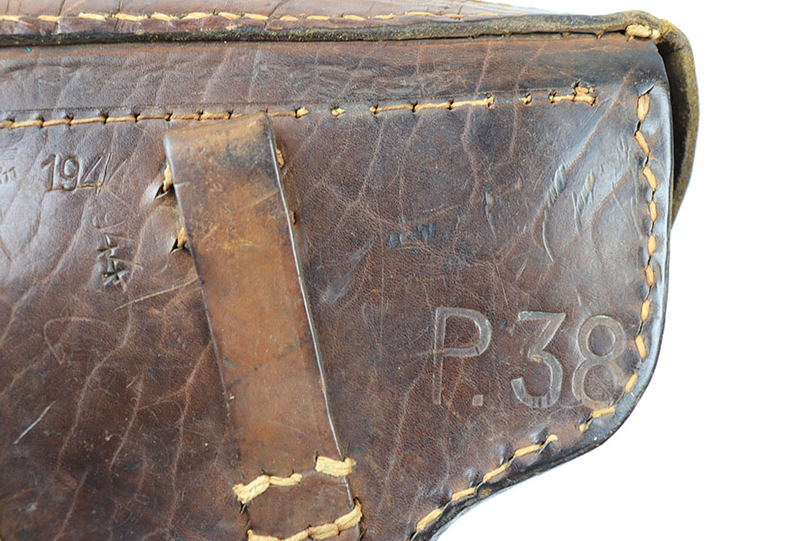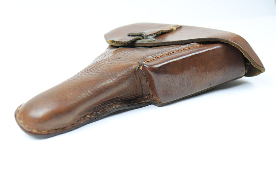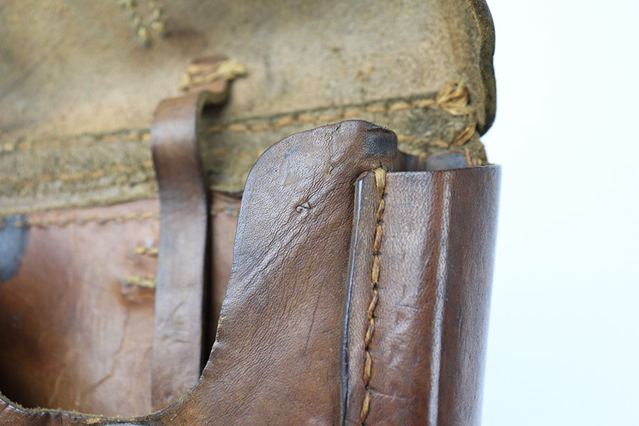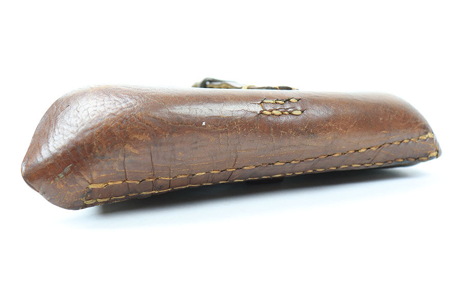 9/2/21 – This is an original, rare variation brown leather hard shell P.38 holster from the end of WW2. The holster is maker stamped on the back leather “lyo” which is a maker code from the Radom factory in Poland. These holsters were made with thinner leather which tends to leave them slightly dilapidated and pliable – this holster is no exception. Great overall condition however, with no major issues and some mild surface wrinkling. No stitching issues.