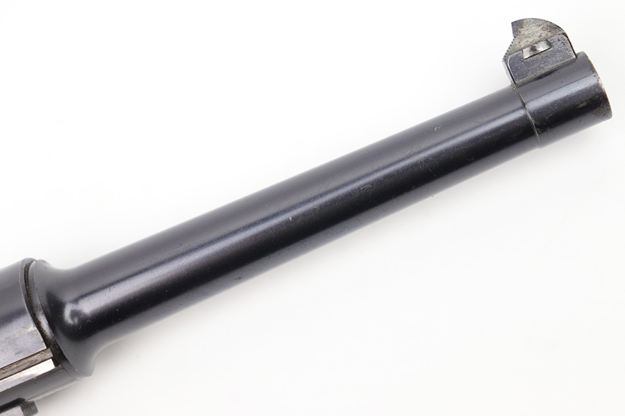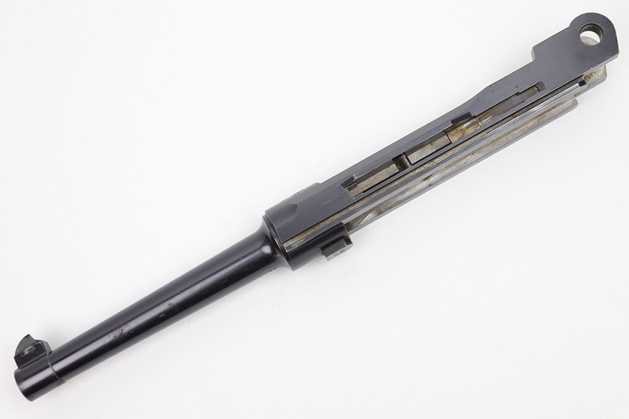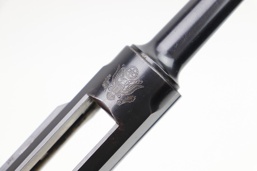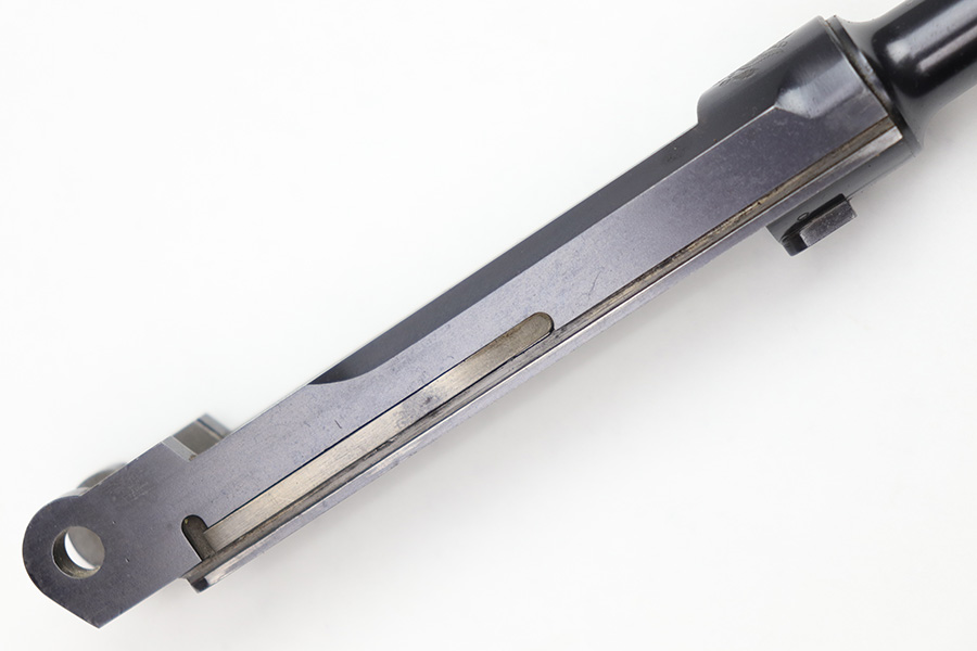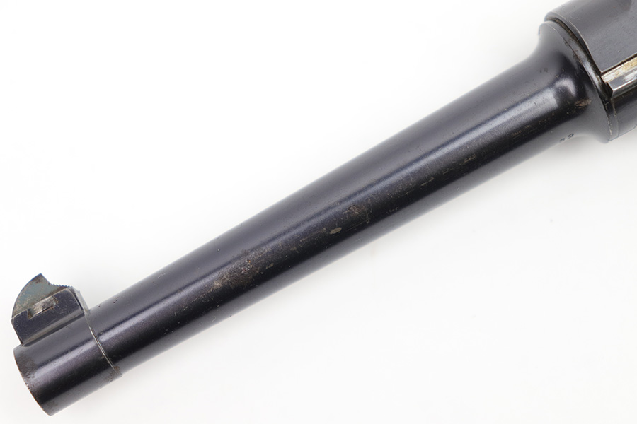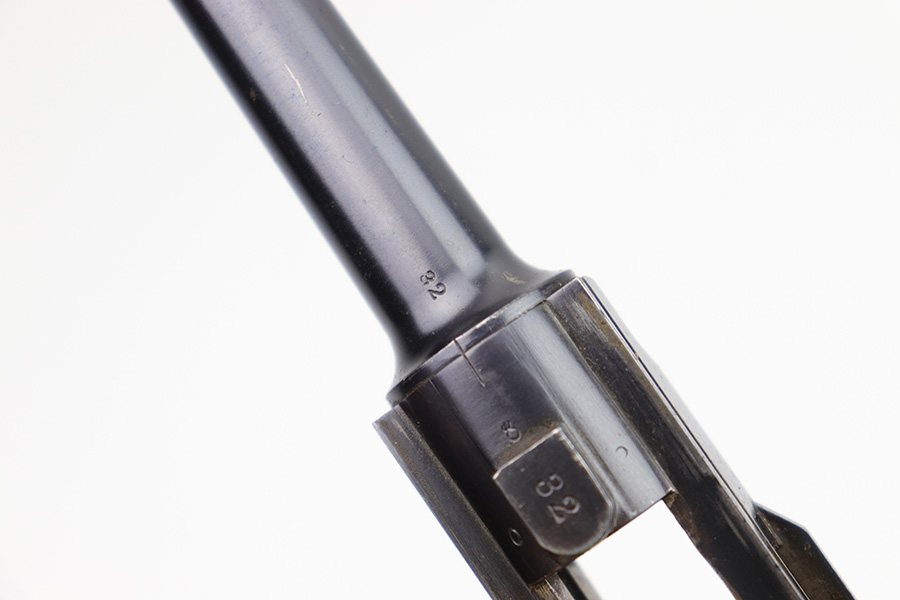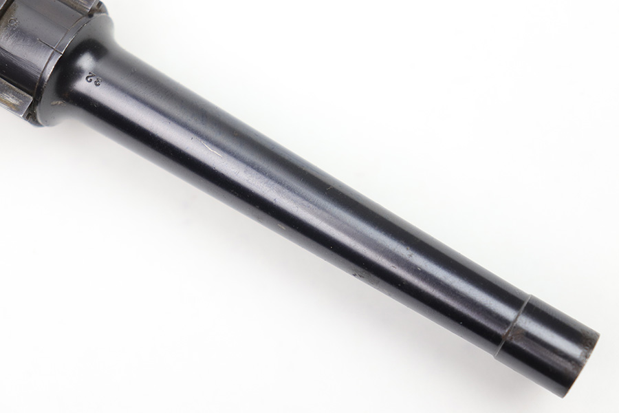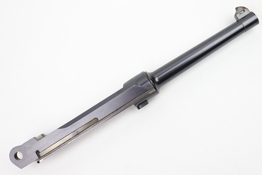 1/9/23 – This is an original and rare variation American Eagle Luger receiver and barrel. The underside of the luger receiver is stamped with a US Ordnance proof stamp, which makes this a very rare M1900 Test Eagle Luger receiver. One of the first lugers brought in to the US from Germany for military testing. The receiver and barrel are both in excellent condition with some very mild finish loss but about 96% overall condition. The bore is clean and shiny with strong rifling. There’s some mild patina within the grooves of the bore.