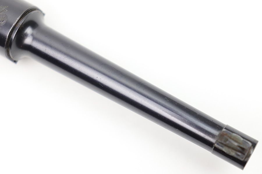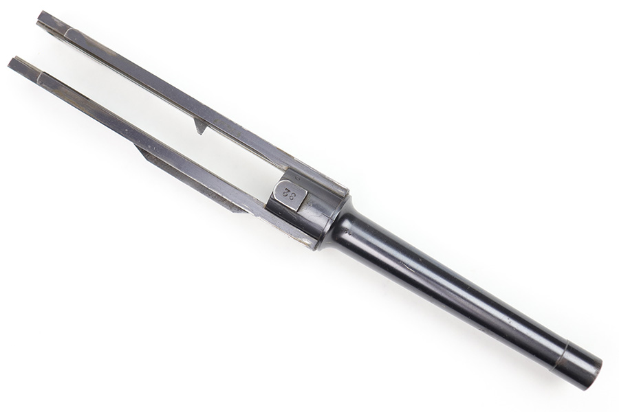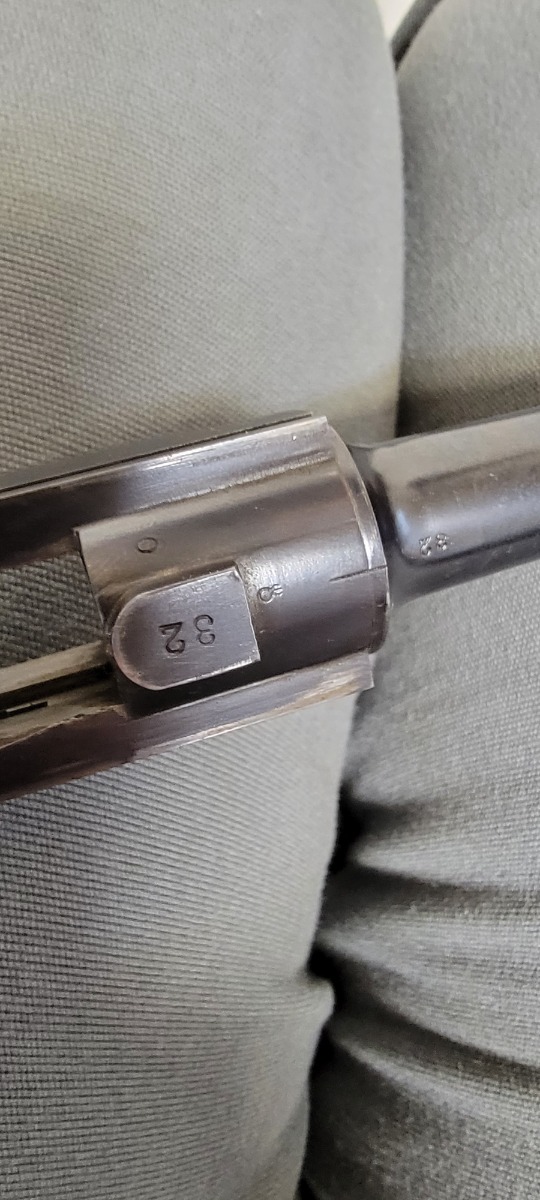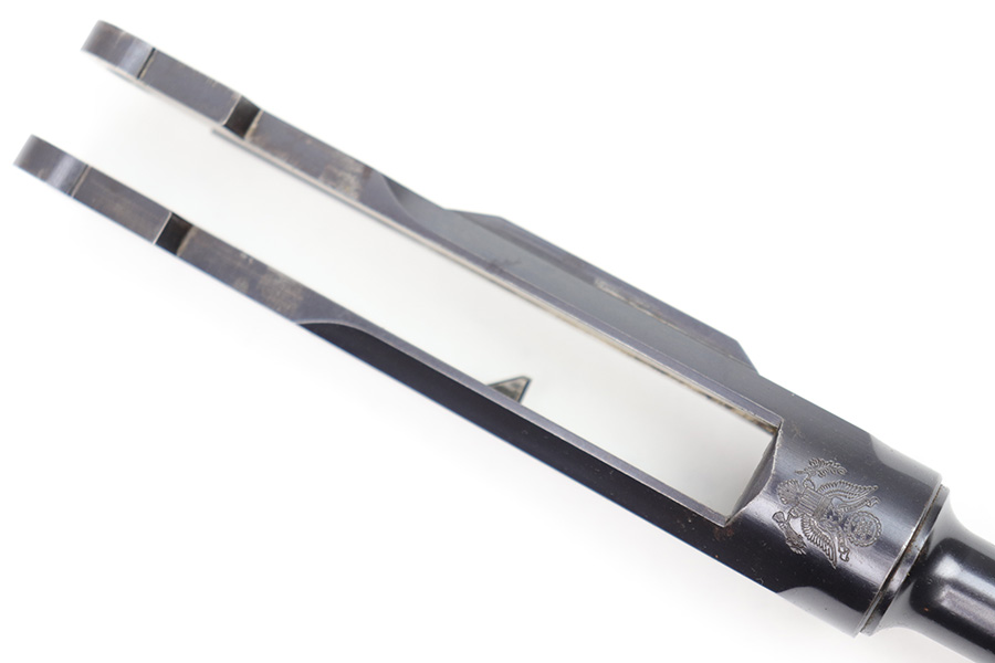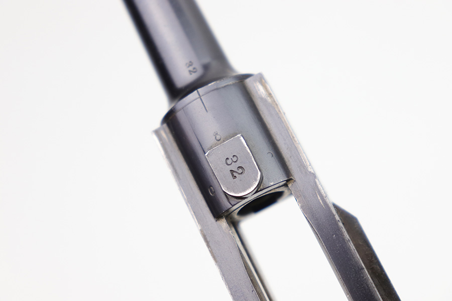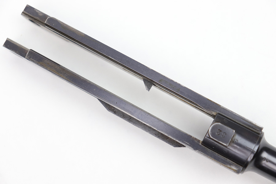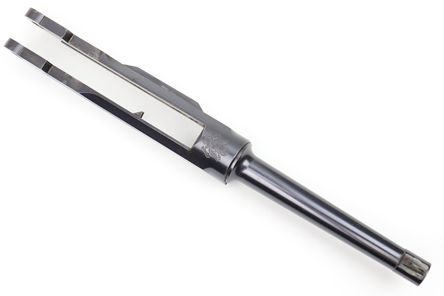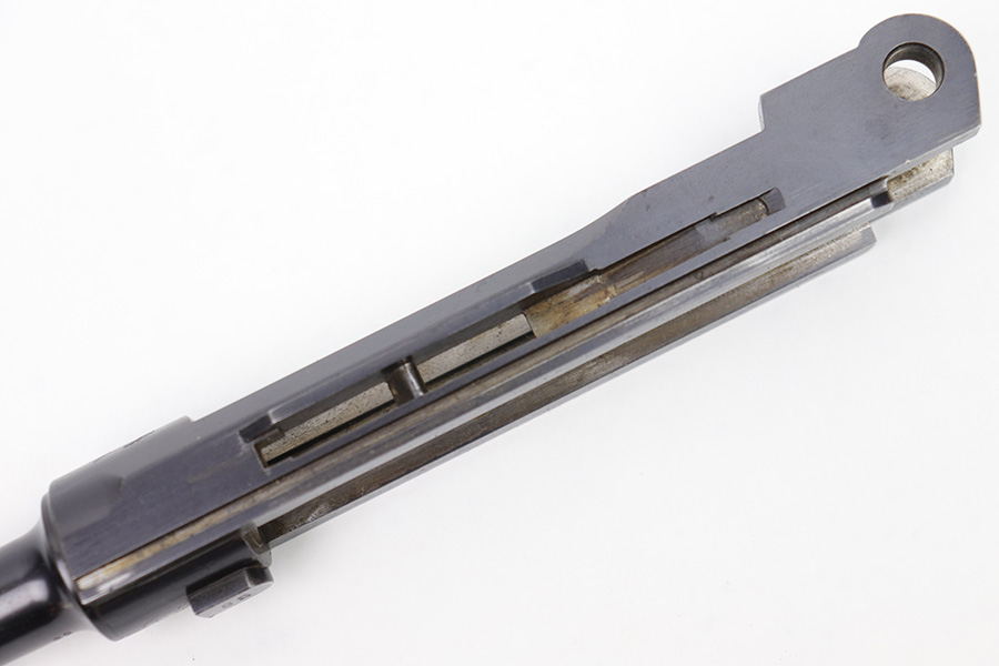 1/9/23 – This is an original and rare variation American Eagle Luger receiver and barrel. The underside of the luger receiver is stamped with a US Ordnance proof stamp, which makes this a very rare M1900 Test Eagle Luger receiver. One of the first lugers brought in to the US from Germany for military testing. The receiver and barrel are both in excellent condition with some very mild finish loss but about 96% overall condition. The bore is clean and shiny with strong rifling. There’s some mild patina within the grooves of the bore.