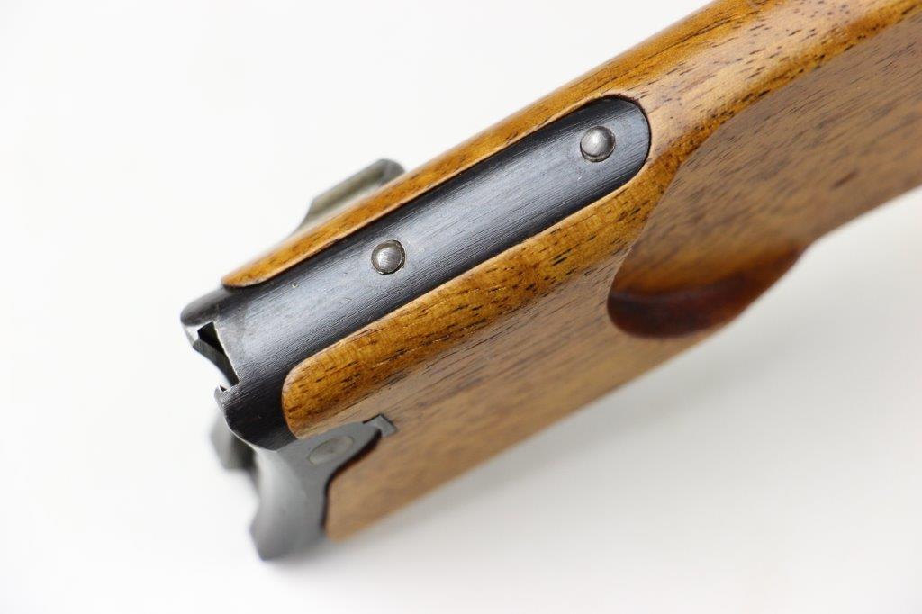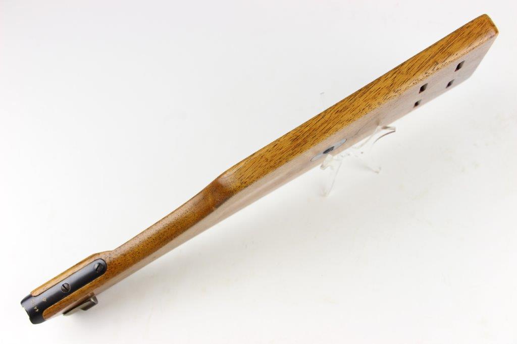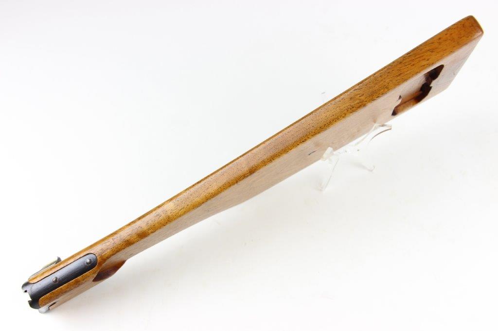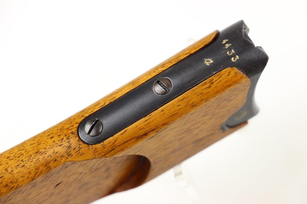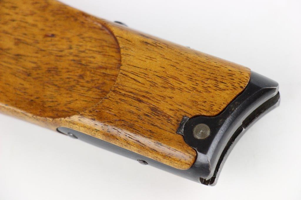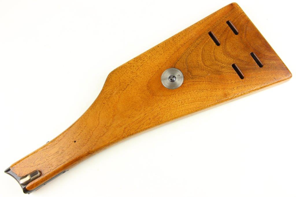 7/5/24 – This is a rare variation, WW1 German Imperial Navy M1904 Luger Stock / Shoulder Board. The stock comes as shown, with original central metal disc, and female attachment end with a fully functional locking mechanism. The stock is in excellent overall condition with clean, smooth wood that has no cracks or chips. The top of the board, along the top-spine or the shoulder-end of the board is a GERMANY export stamp with a few small dings / blemishes indicating this was used to hammer something previously. These are minor blemishes however and don’t affect the structural integrity overall. The metal disc is stamped with a small Crown/M Imperial Navy proof stamp. The stamp is crisp and verified as original. The female end is serial numbered 4433a. No other markings or stamps; price reduced due to the export stamp, but overall this is an excellent original example of a rare WW1 shoulder board.