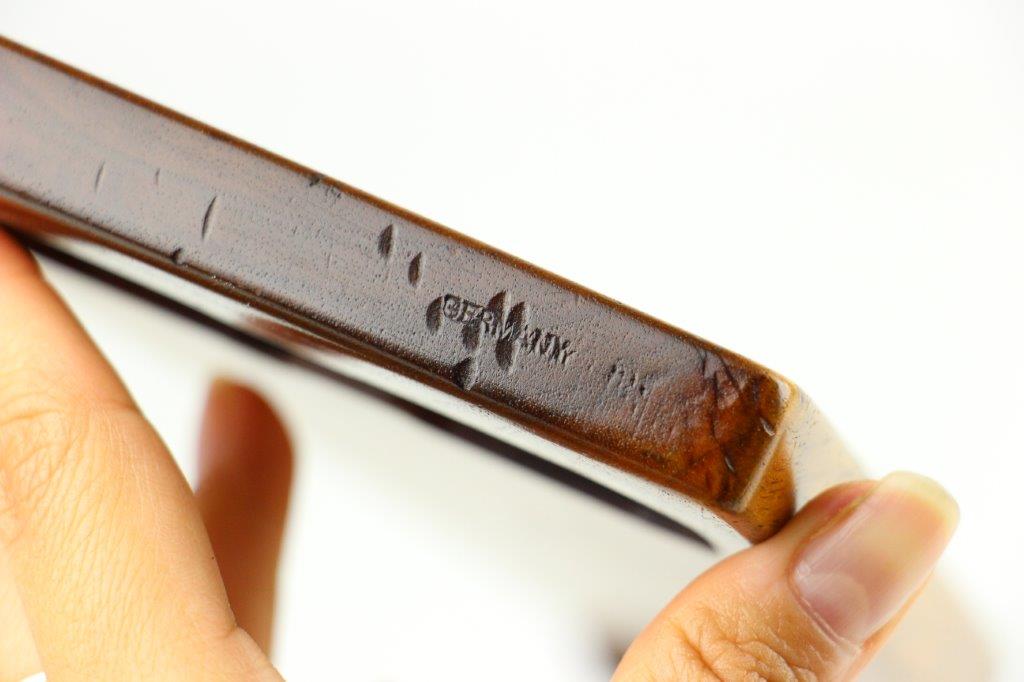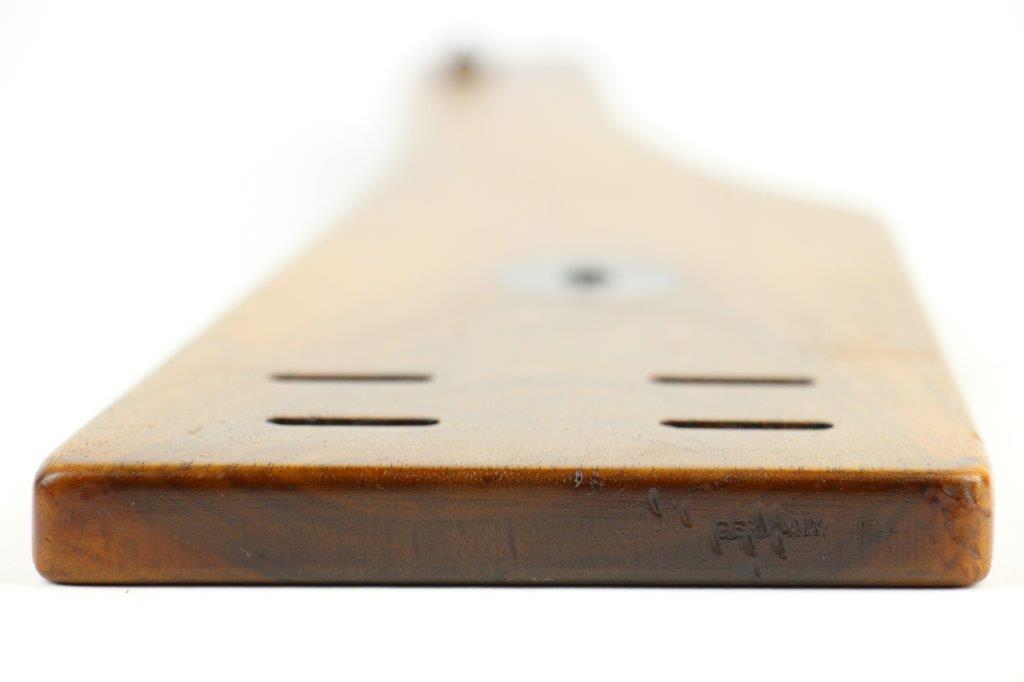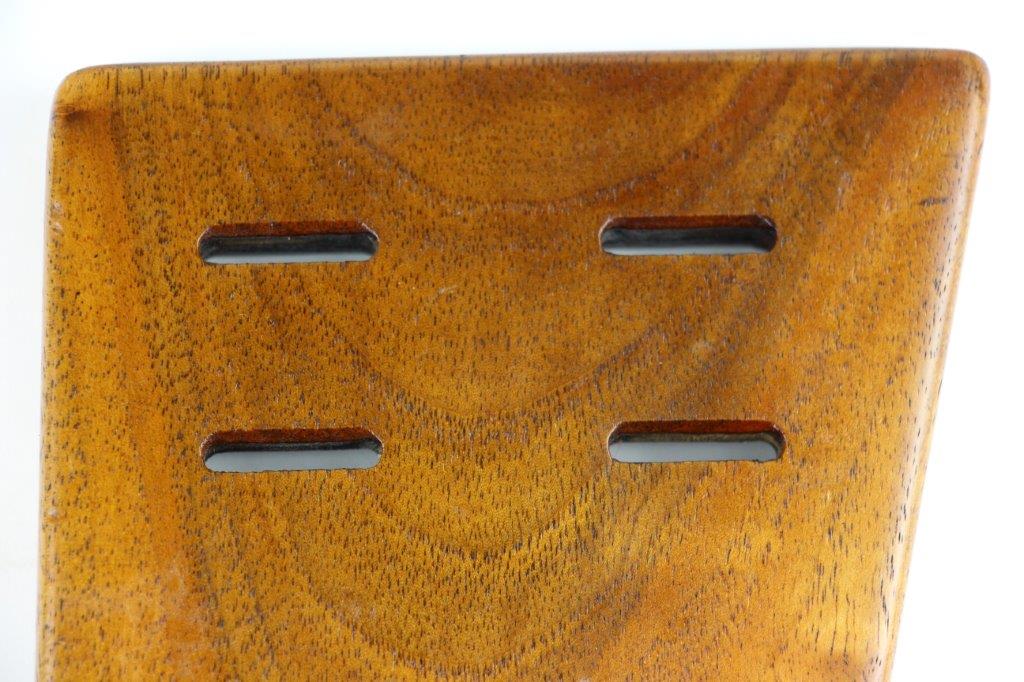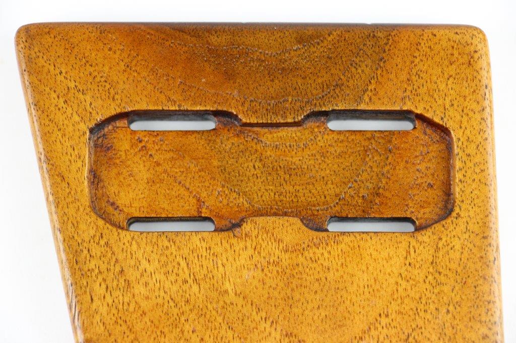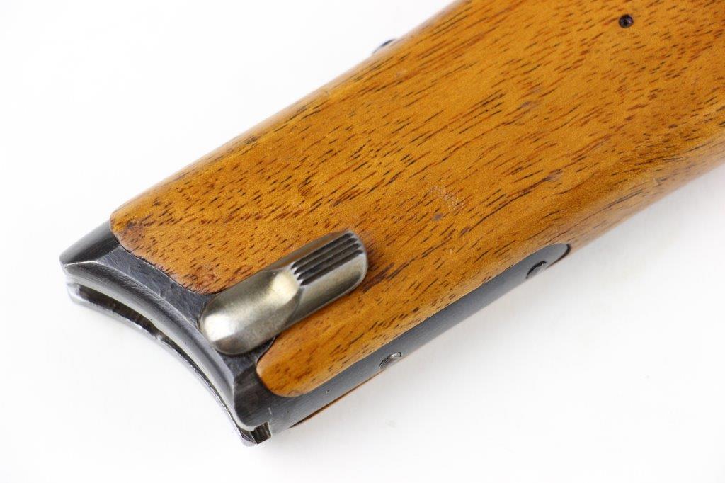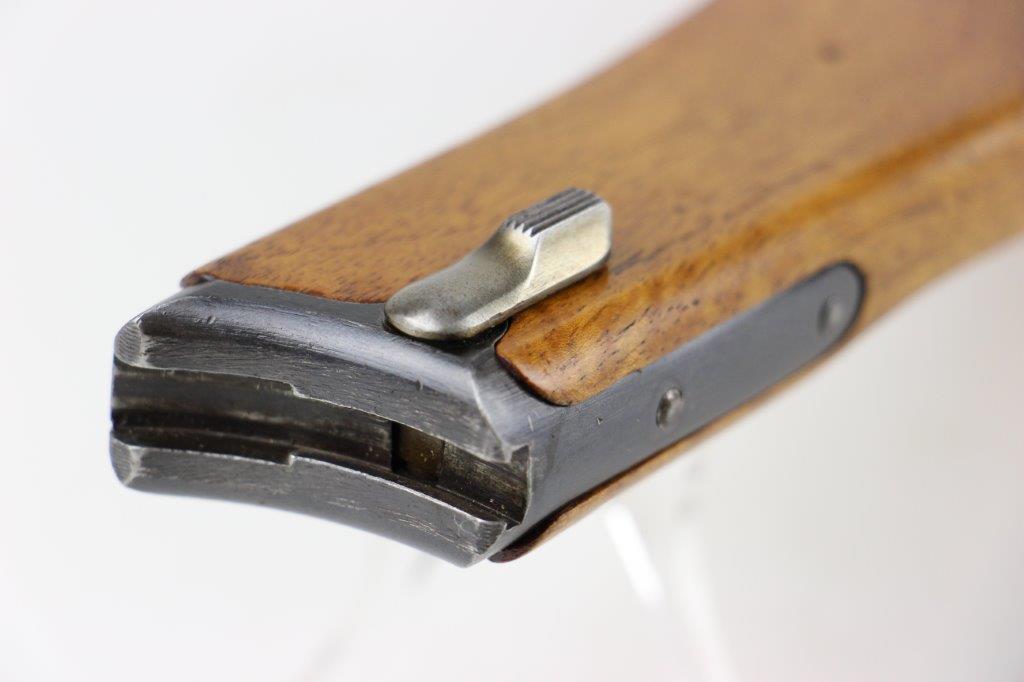 7/5/24 – This is a rare variation, WW1 German Imperial Navy M1904 Luger Stock / Shoulder Board. The stock comes as shown, with original central metal disc, and female attachment end with a fully functional locking mechanism. The stock is in excellent overall condition with clean, smooth wood that has no cracks or chips. The top of the board, along the top-spine or the shoulder-end of the board is a GERMANY export stamp with a few small dings / blemishes indicating this was used to hammer something previously. These are minor blemishes however and don’t affect the structural integrity overall. The metal disc is stamped with a small Crown/M Imperial Navy proof stamp. The stamp is crisp and verified as original. The female end is serial numbered 4433a. No other markings or stamps; price reduced due to the export stamp, but overall this is an excellent original example of a rare WW1 shoulder board.