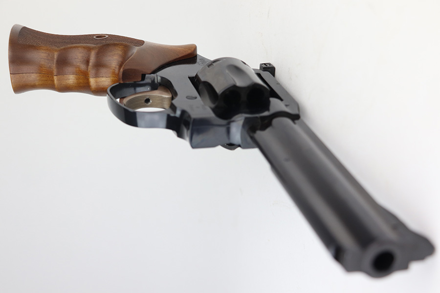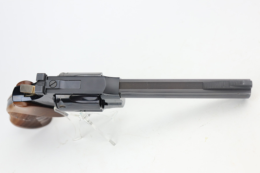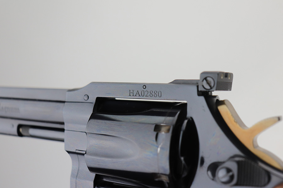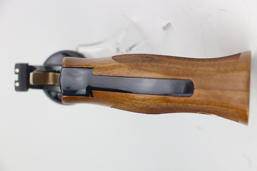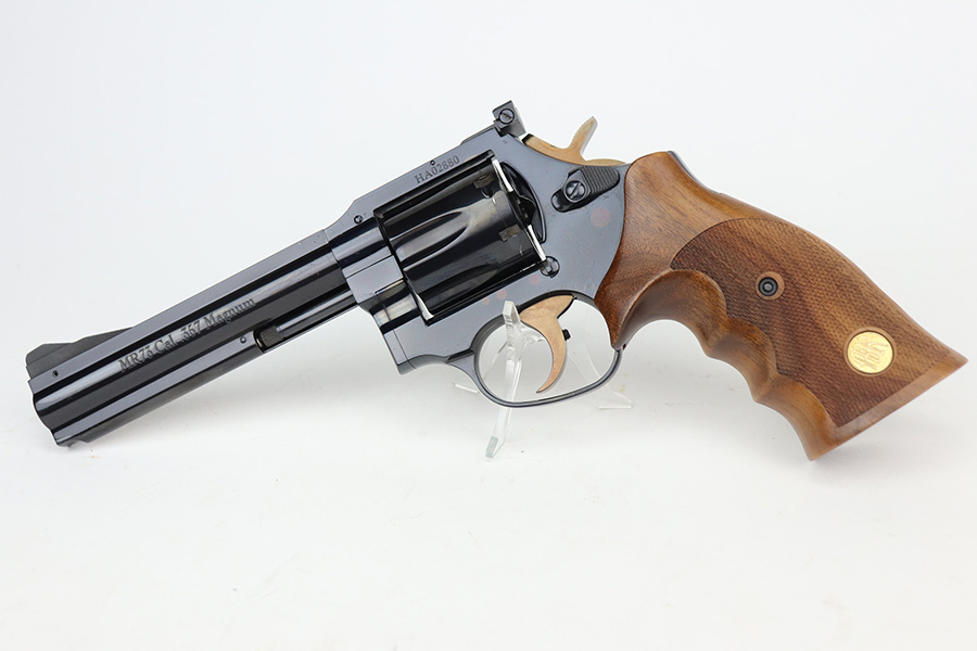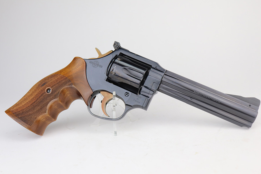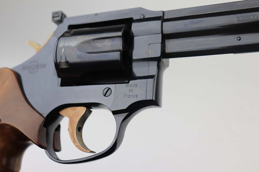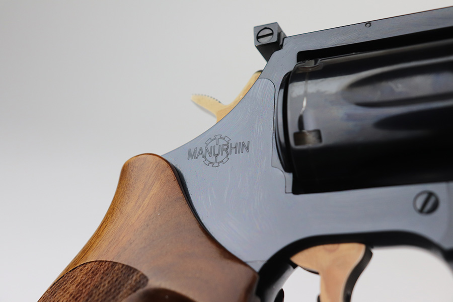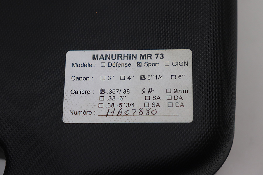 5/14/21 – This is a scarce and desirable French Manurhin MR73 Sport revolver in near-mint condition. It has a 5.25in barrel and is chambered for .357 Magnum. Every MR 73 is match grade accurate and has an adjustable trigger weight in both double-action and single-action modes, a feature found in other high-end revolvers such as Korth and Janz. These adjustments do not alter the strength of the main spring, ensuring reliable primer ignition. This is due to the use of roller bearings in the trigger mechanism along with extensive hand fitting and polishing of components during assembly. The MR73 requires more than 12 hours of hand-fitting at the factory, making it about 50% more expensive than competing U.S.-manufactured brands. They’re considered some of the best-made revolvers on the market. This one comes in the original Manurhin case and includes a manual. It has just a roll mark on the cylinder with no other wear.