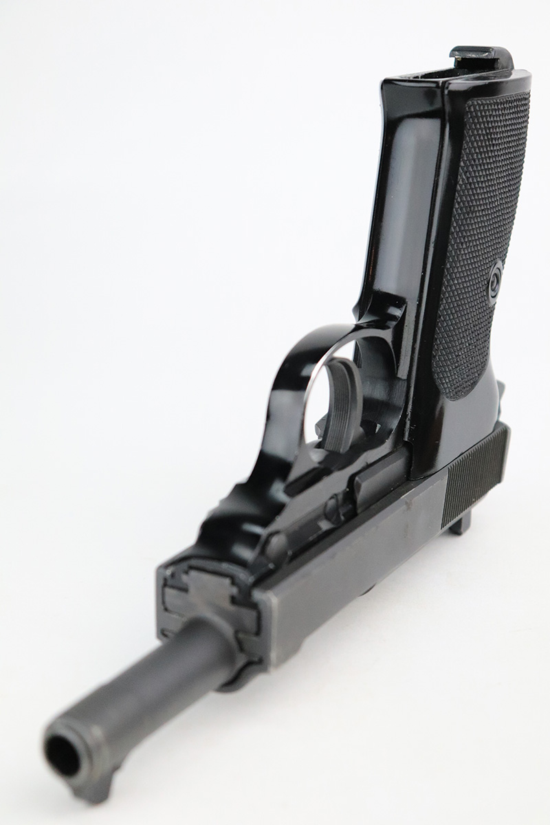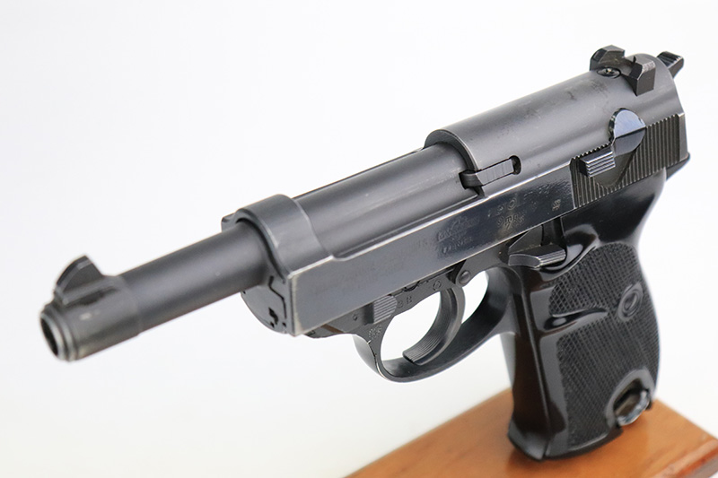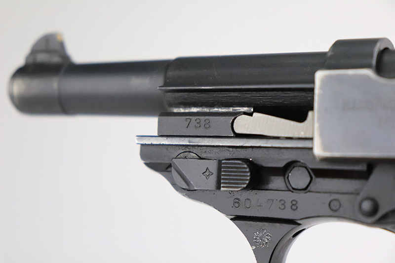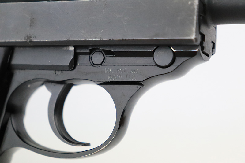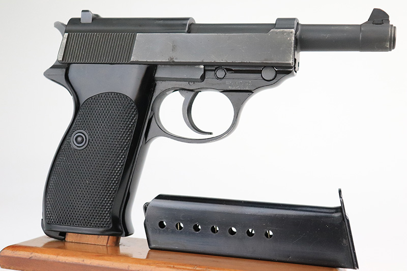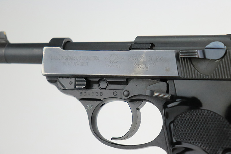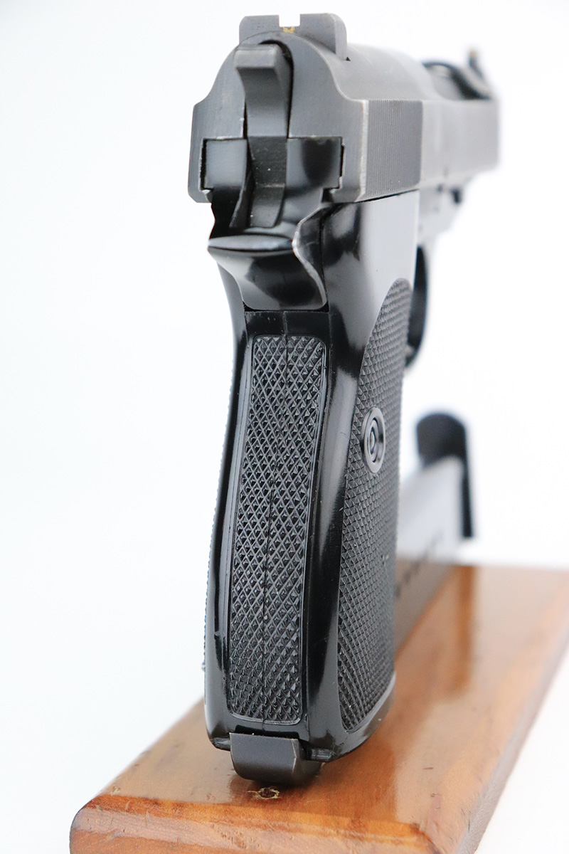 10/7/24 – This is an excellent example of a rare Manurhin Model P4. This particular gun was issued to the West Berlin Police and is very rare, as only 225 were made. It is all matching and has the West Berlin flower marking on the left side of the trigger guard. Import mark on the right side of the frame. It has retained about 96-97% of its original finish. Most of the wear is on the left side of the slide, but there is very minor wear on some of the high edges and around the muzzle. Some light scuffs on the top of the slide. There is some light spotty discoloration on the right side and top of the slide. Comes with excellent black plastic grips and a P.38 magazine. The bore is mint. De-cocker is functional.