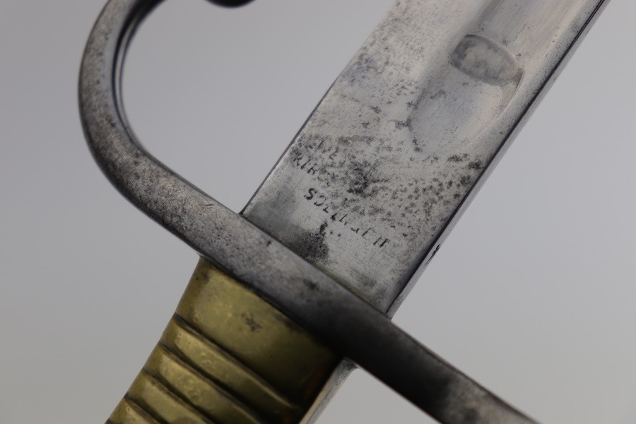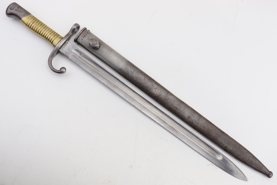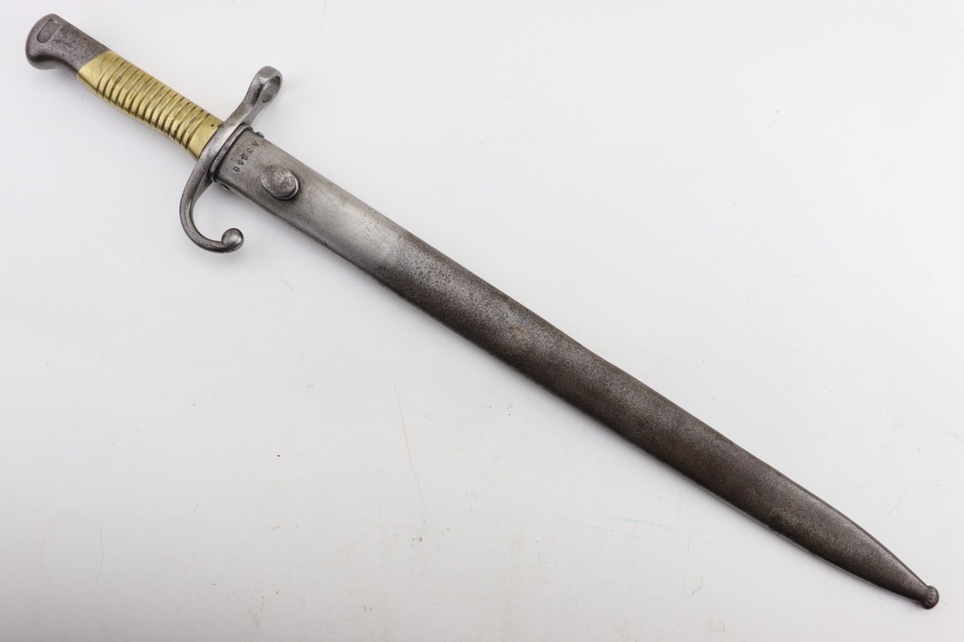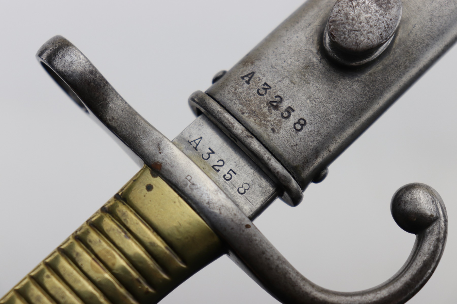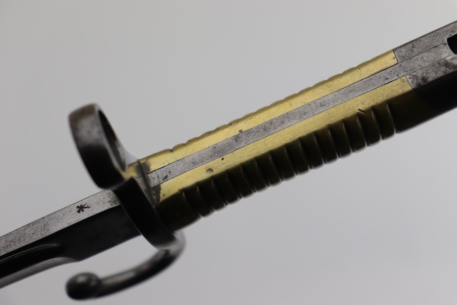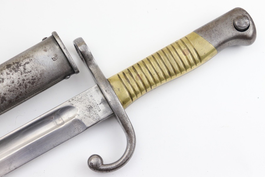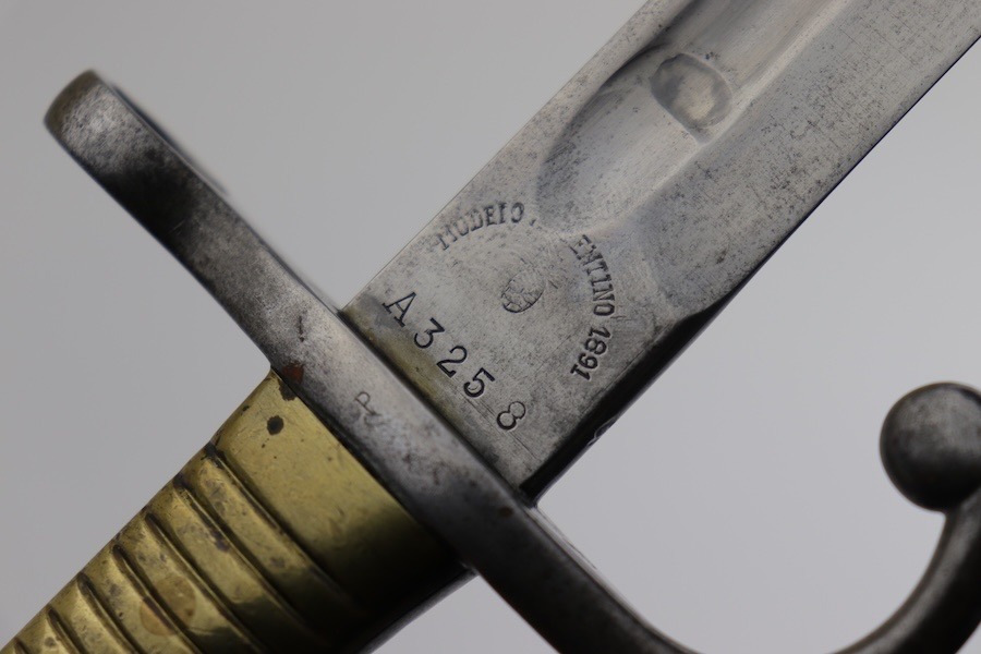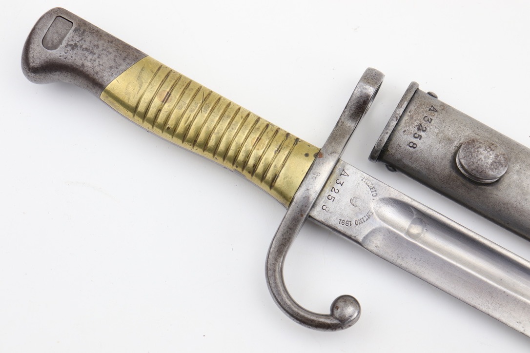 SOLD – Rare Matching Brass Grip 1891 Argentine Mauser Bayonet – Intact Crest