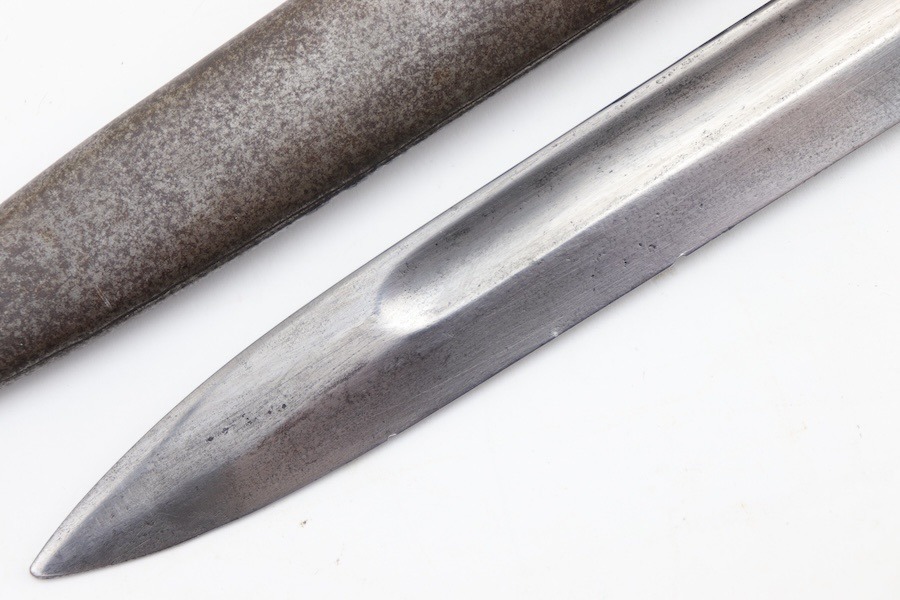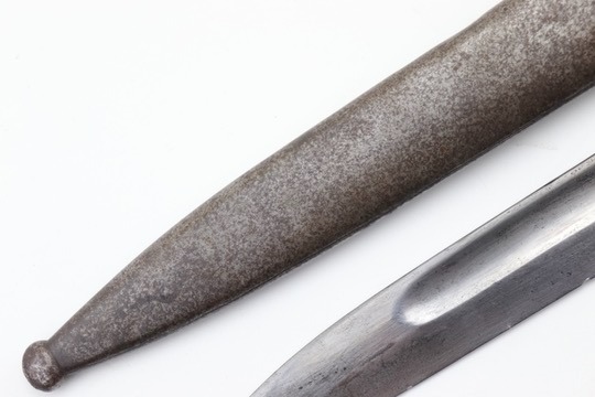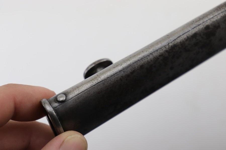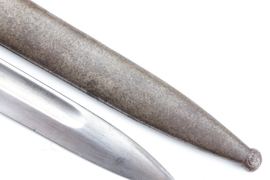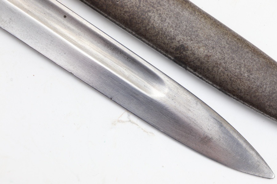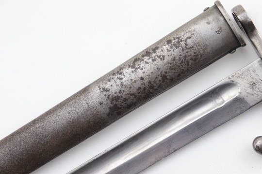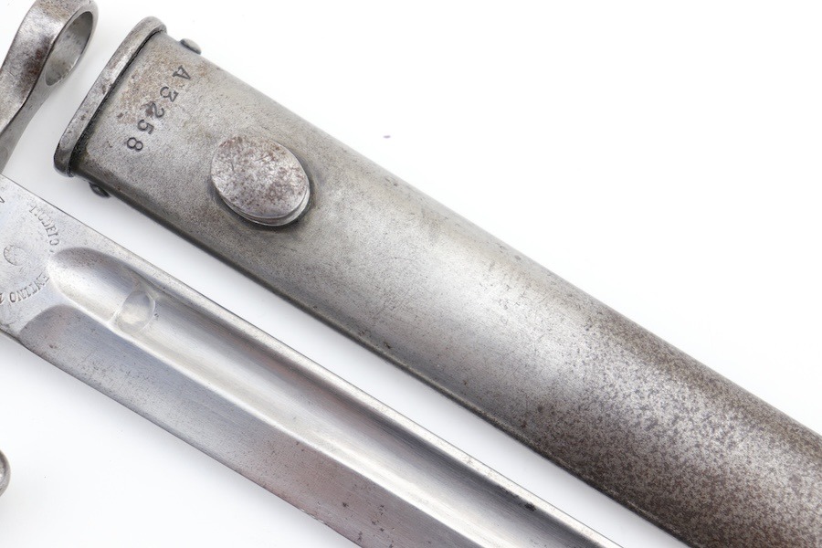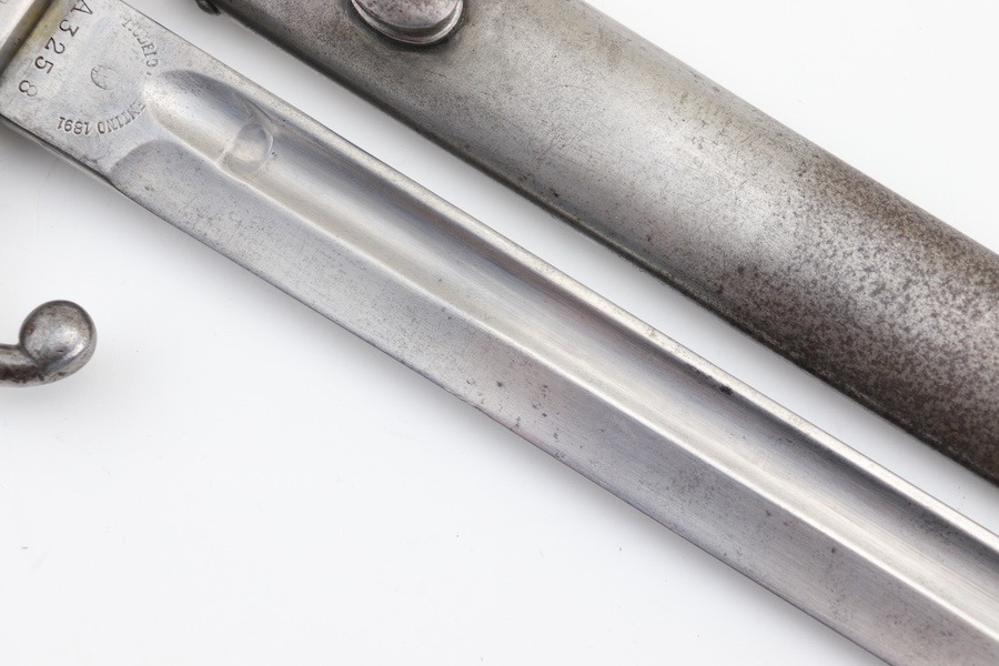 9/24/24 – For sale is an exceptionally rare first pattern 1891 Argentine Mauser bayonet. This bayonet features an intact national crest, a pair of shiny brass grips, and a matching scabbard. Condition-wise, the blade has a light patina throughout with no post-factory sharpening; however, there are a couple of minor chips on the edge. The markings on the ricasso are a little hard to read as they’ve worn down over time, but there is no grinding that is typically seen on these bayonets. The scabbard does not retain any original finish and is left with a natural patina; there is also a hairline crack that spans the length of the scabbard(See Photos). Overall a very scarce bayonet with a few condition issues.