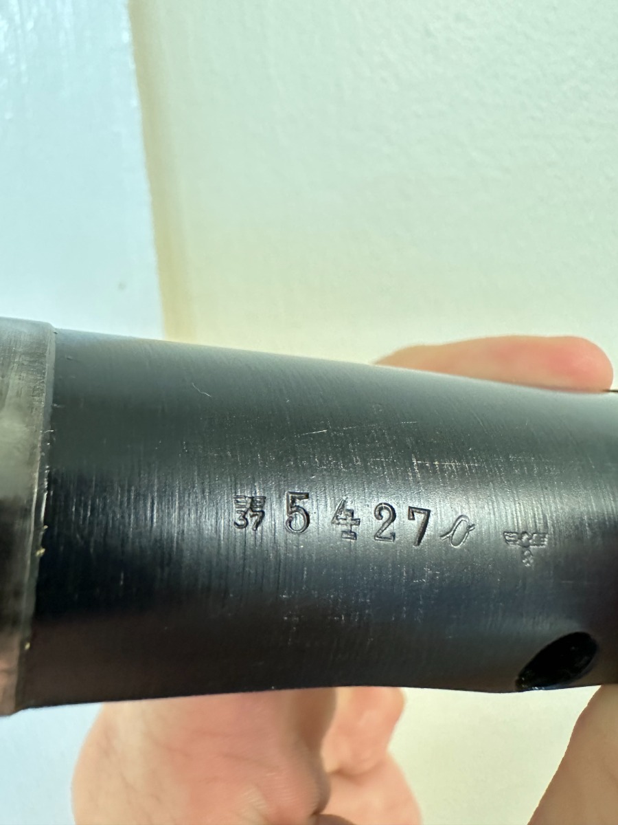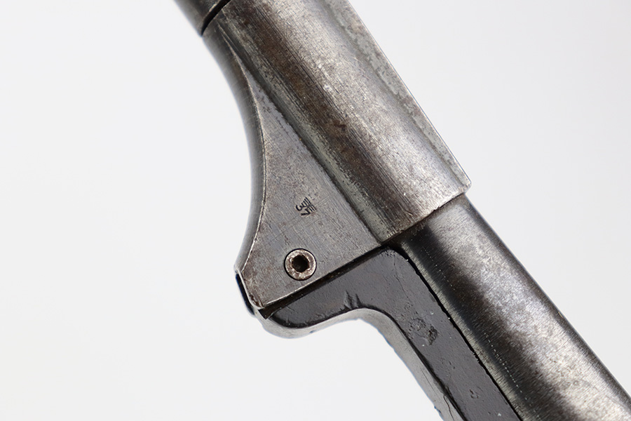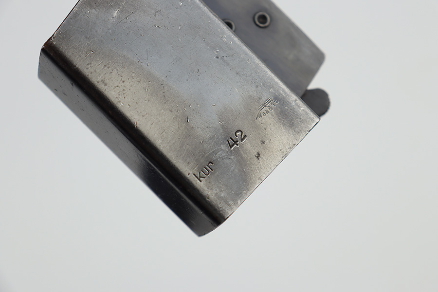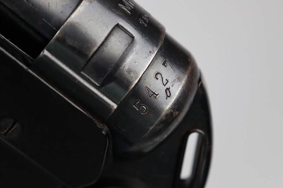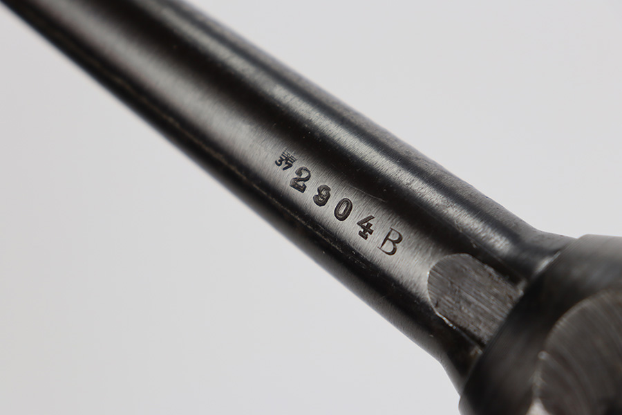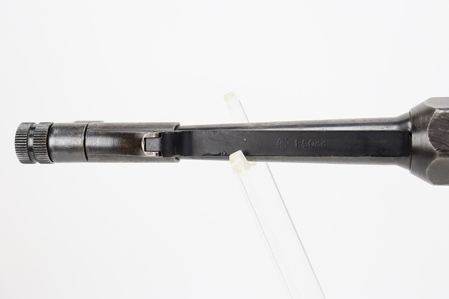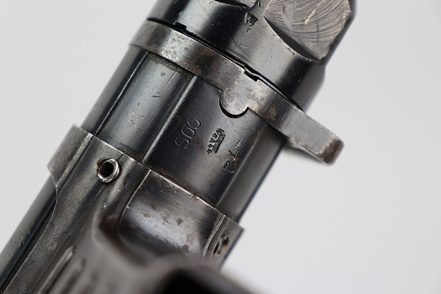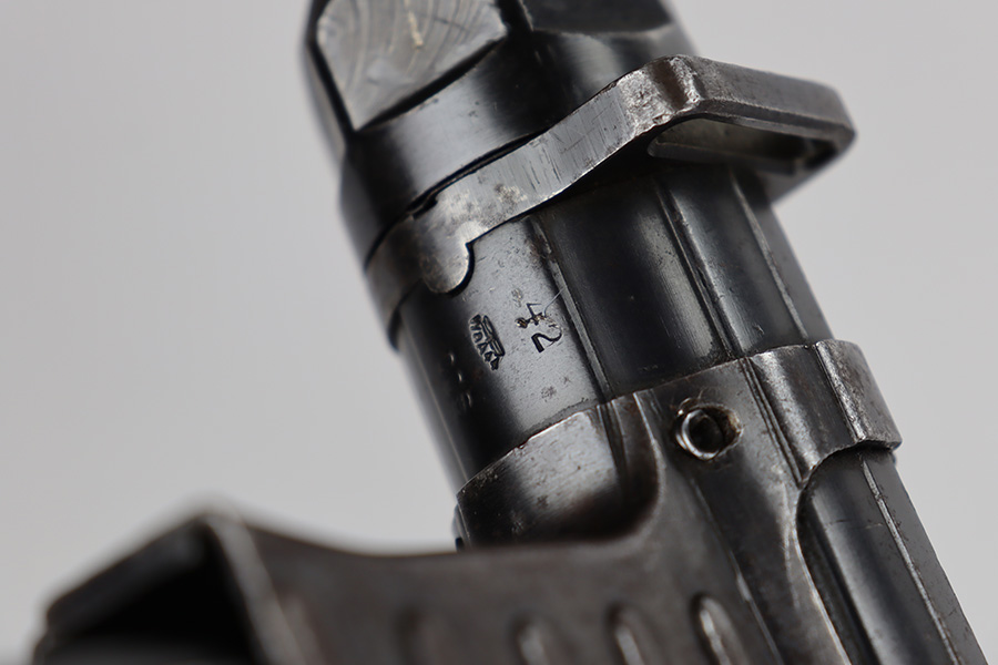 8/1/23 – This is an original and matching example of the iconic MP40 submachine gun, as made by Haenel in 1942. The MP-40 was the successor to the MP-38 model. Both were intended to be compact bust fire power weapons especially suited for dismounted vehicle troops but was issued in ever increasing numbers to troops of all kinds. It is slow firing, comfortable to shoot, durable, with readily available parts. This particular example is all matching numbers throughout, including the internals. The only negative is that the barrel or resting bar is a replacement, though this does not impact the functionality of the weapon at all. The original finish is very nice, with thinning on the mag housing and more intermixed on the receiver and barrel but no pitting. Some initials are lightly scratched into the right side of the stock though. WaA254 proofs found all over this one. Shoulder stock employs properly and quite tight when extended. Strong, shiny bore with only minor signs of use. Receiver is ’42 dated with ‘fxo’ maker code. The listing includes a total of three magazines, as well as two original loaders. This weapon is fully transferable on ATF form 3 or form 4 as C&R eligible.