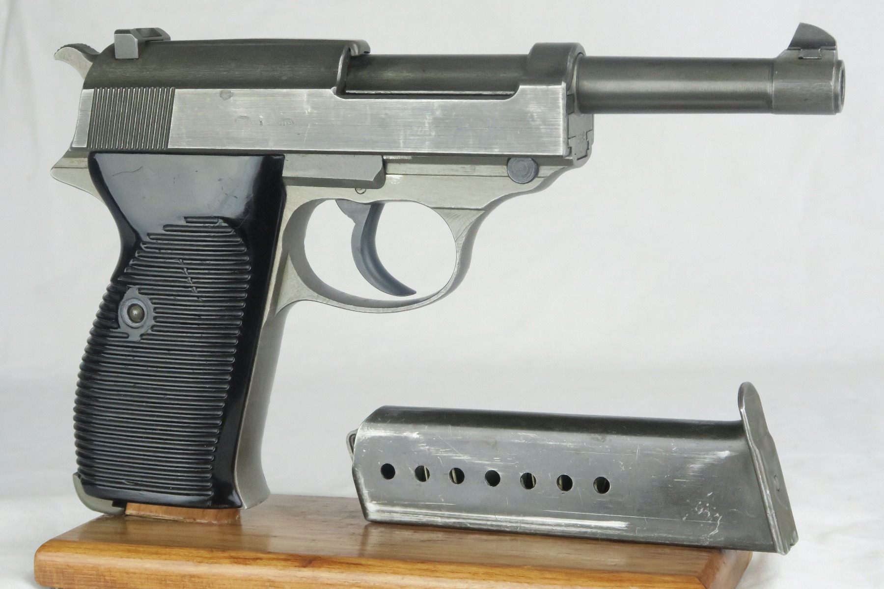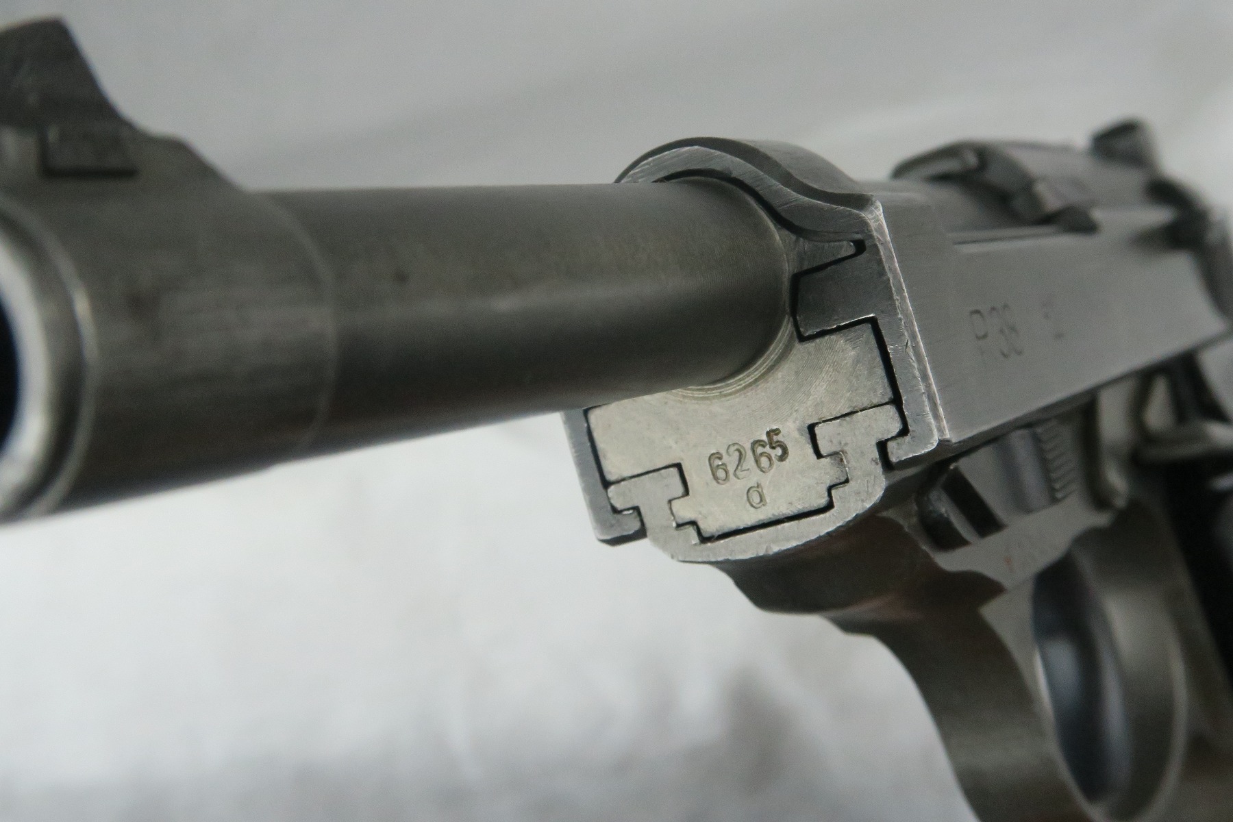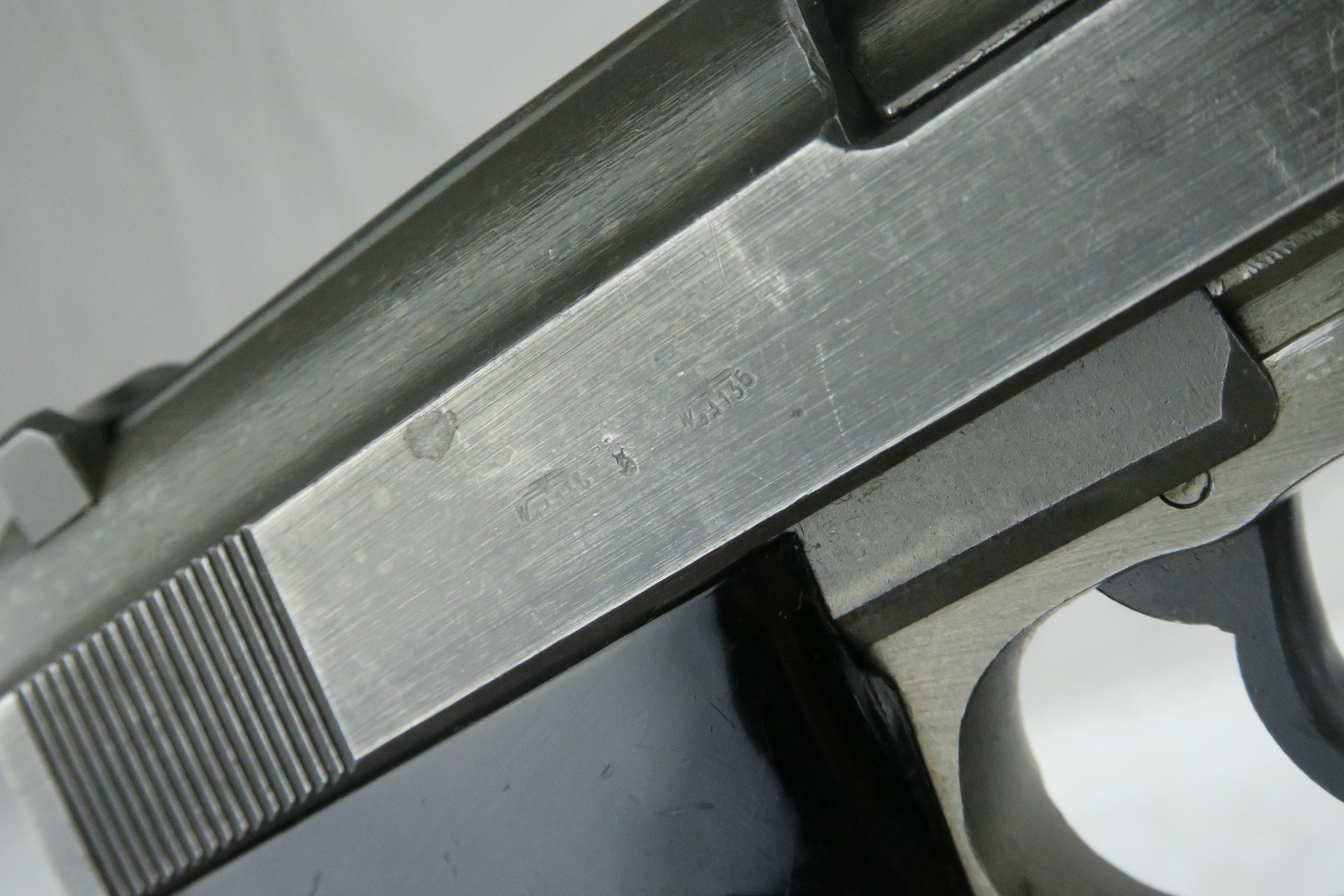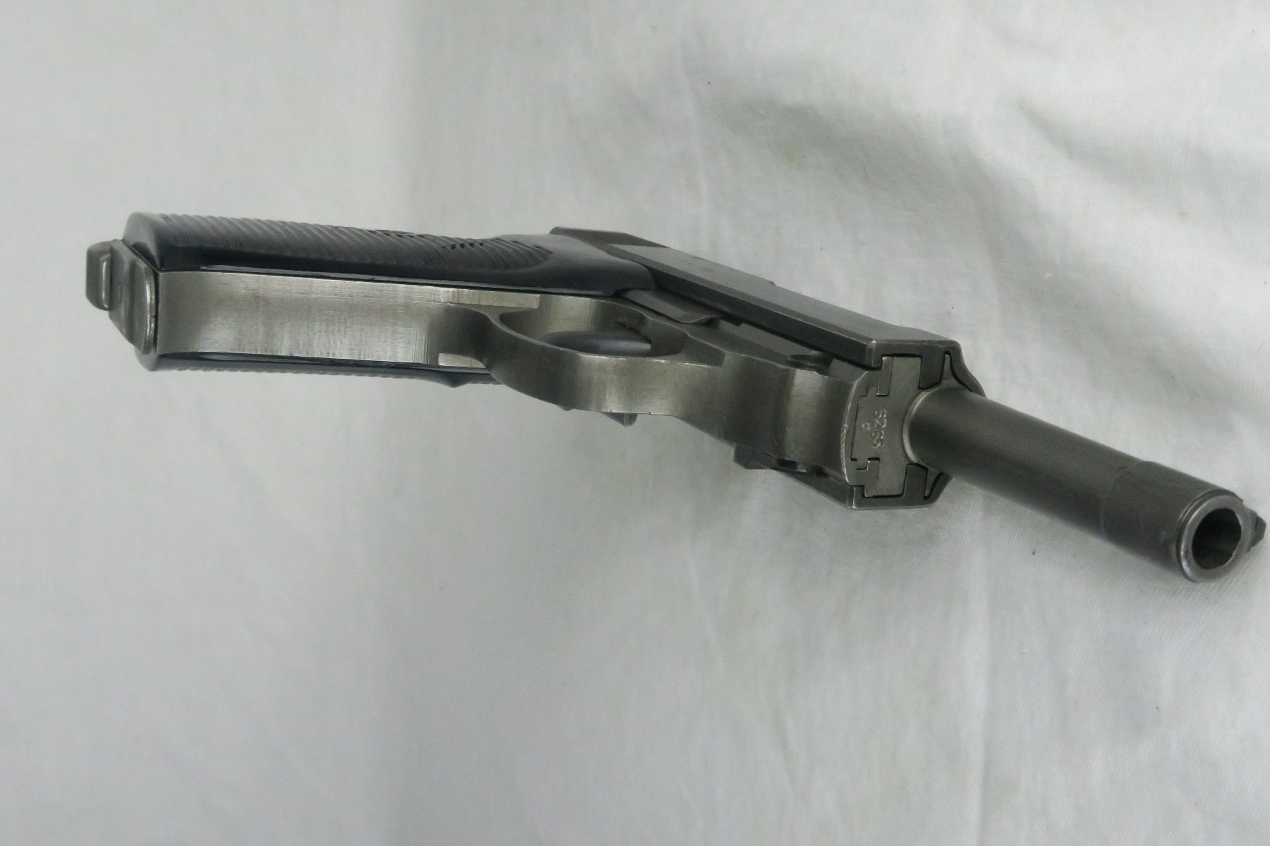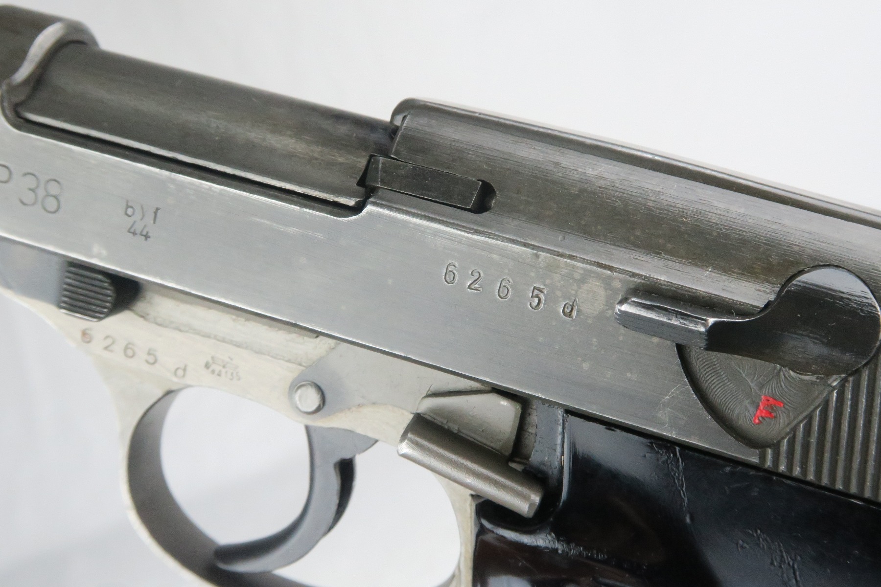 12/20/17 – This is a rare Mauser P.38 from 1944, as it has phosphated slide, frame and barrel. Typically these pistols are considered dual-tone, as the barrel is almost always blued. While we say “all phosphate”, the safety and takedown lever are late-war blued. The gun is all matching and original, with some finish loss on either side of the slide and on the high edges. Late-war black plastic grips. While dated ’44’, I believe this may have been put together in 1945. The magazine has a phosphate bottom and phosphate ribbed follower. Also ‘U’ marked – a rare 1945 magazine.