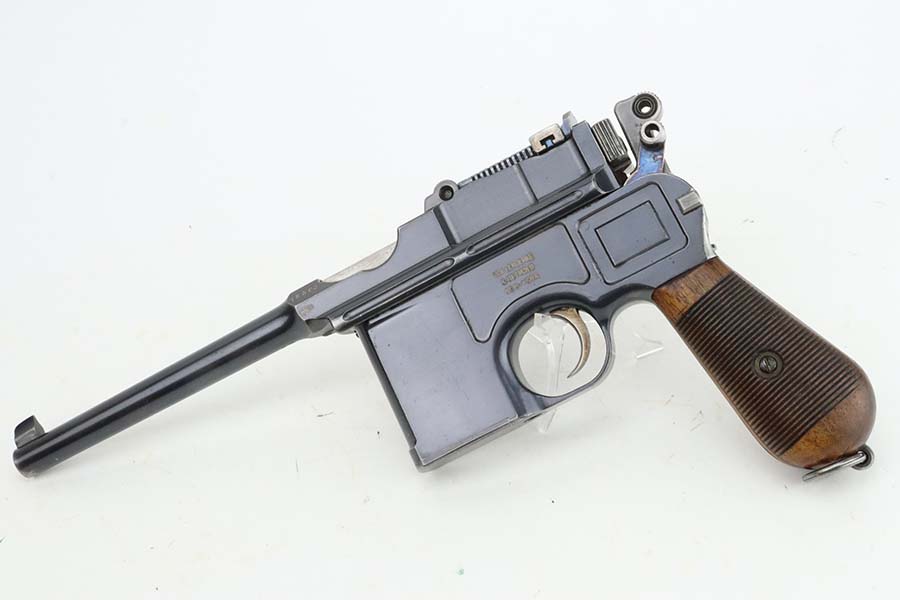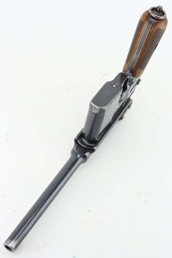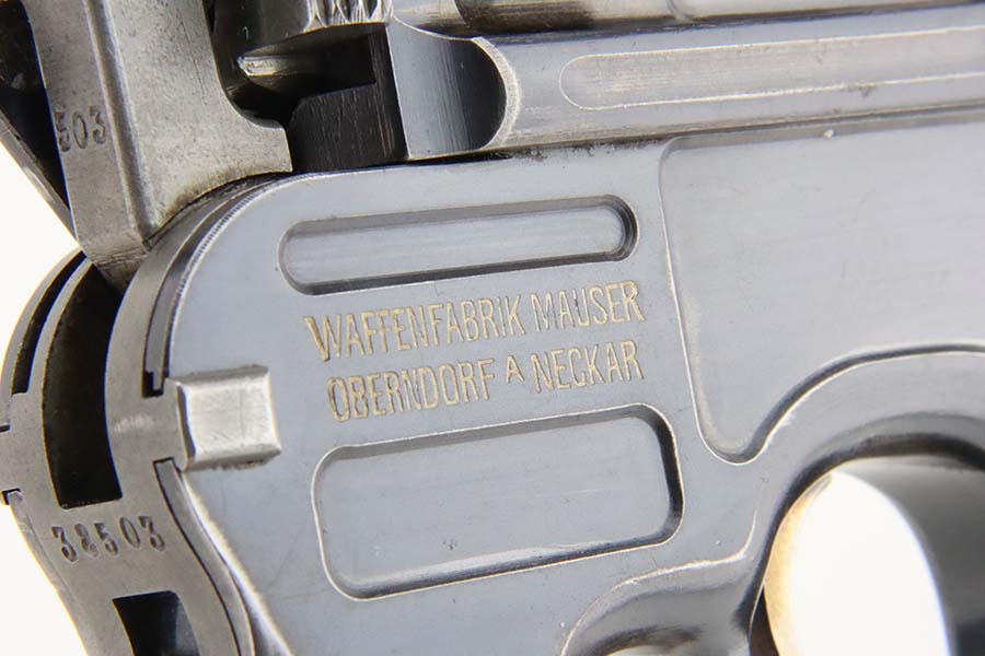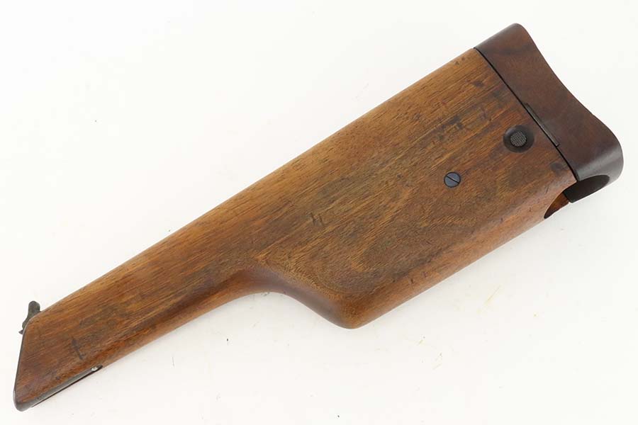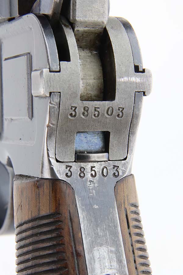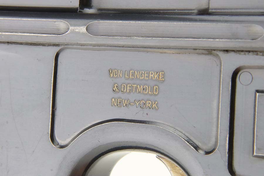 3/26/24 – This is an excellent and scarce Mauser C96 Broomhandle with rare “Von Lengerke and Detmold, New York” inscription on the left side of the frame – a company that was the sole distributor of the C96 Mauser in US at that time. The pistol is all matching and comes with a period-correct but mismatched wood stock. The gun itself has retained about 92% of its original bluing loss. The majority of the wear is on the grip straps, so the profile views are excellent – just minor high edge and muzzle wear. Excellent matching-numbered wood grips. The bore has good rifling, but there is light pin-pricking throughout.