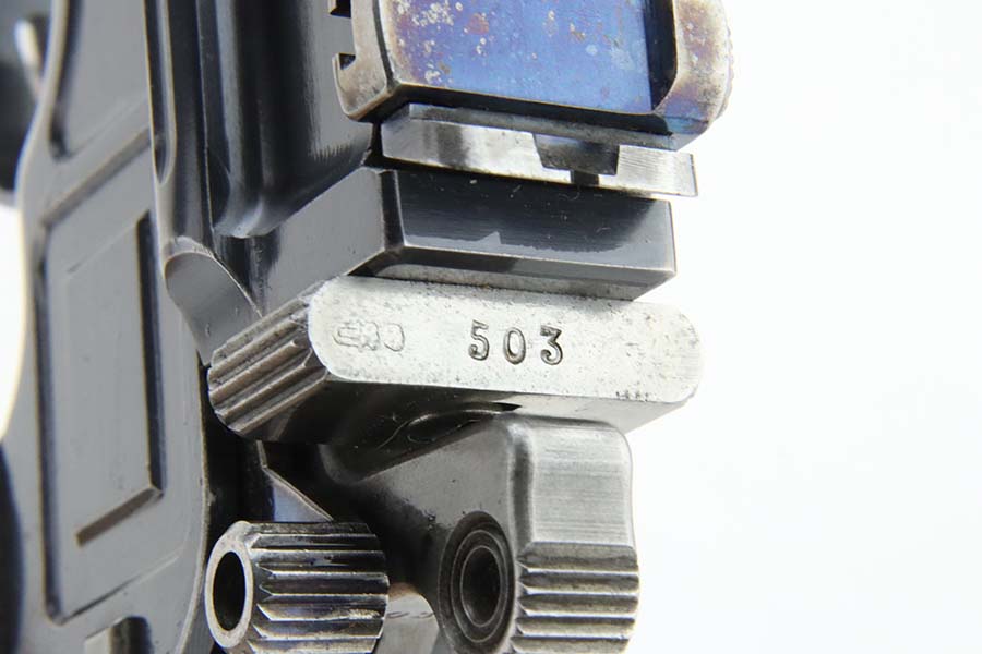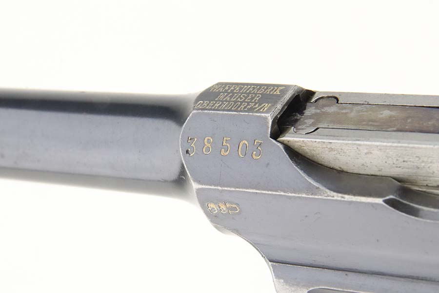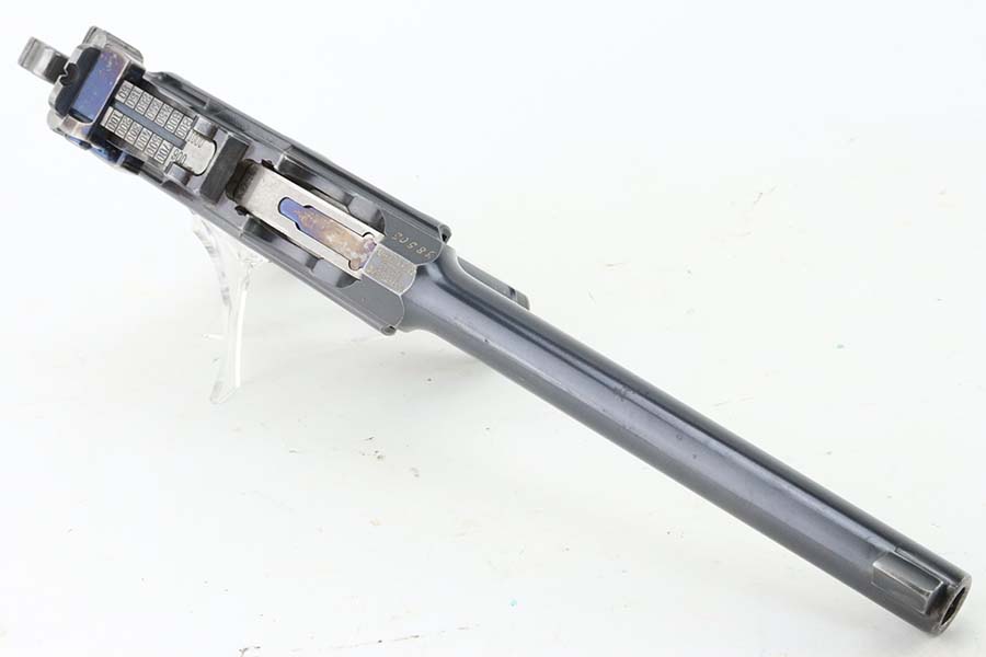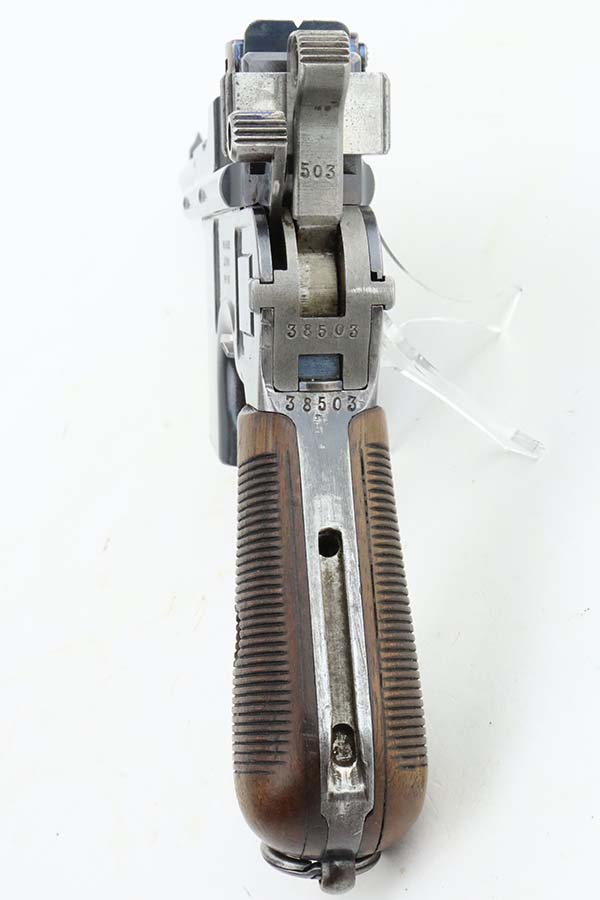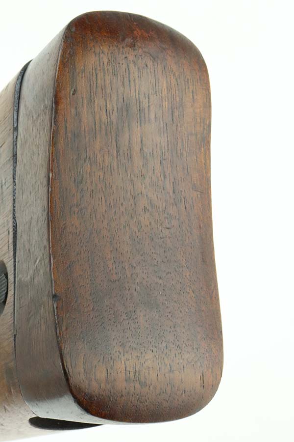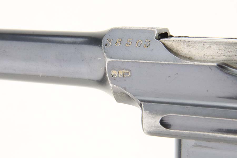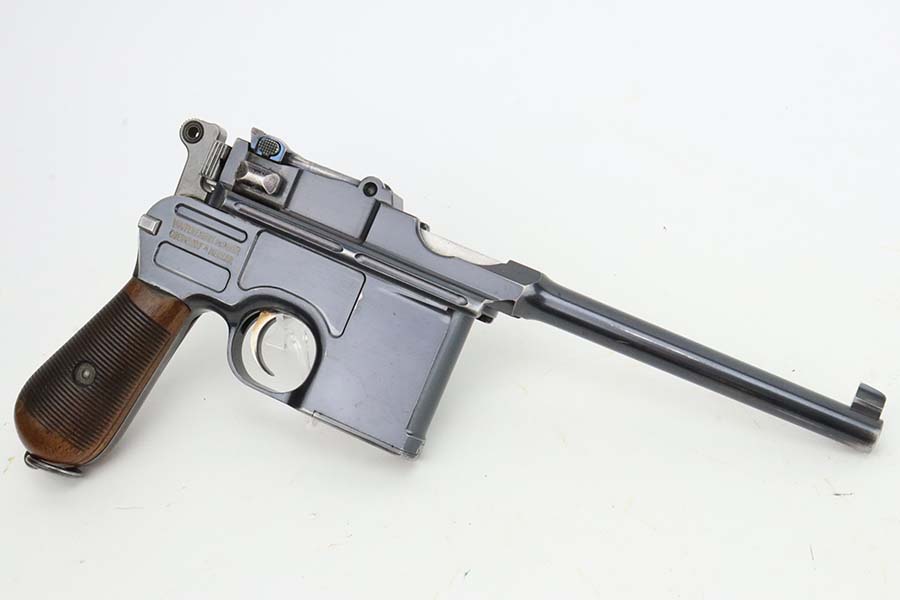 3/26/24 – This is an excellent and scarce Mauser C96 Broomhandle with rare “Von Lengerke and Detmold, New York” inscription on the left side of the frame – a company that was the sole distributor of the C96 Mauser in US at that time. The pistol is all matching and comes with a period-correct but mismatched wood stock. The gun itself has retained about 92% of its original bluing loss. The majority of the wear is on the grip straps, so the profile views are excellent – just minor high edge and muzzle wear. Excellent matching-numbered wood grips. The bore has good rifling, but there is light pin-pricking throughout.