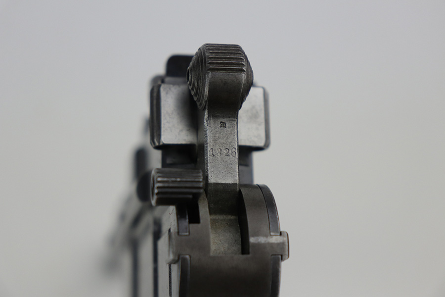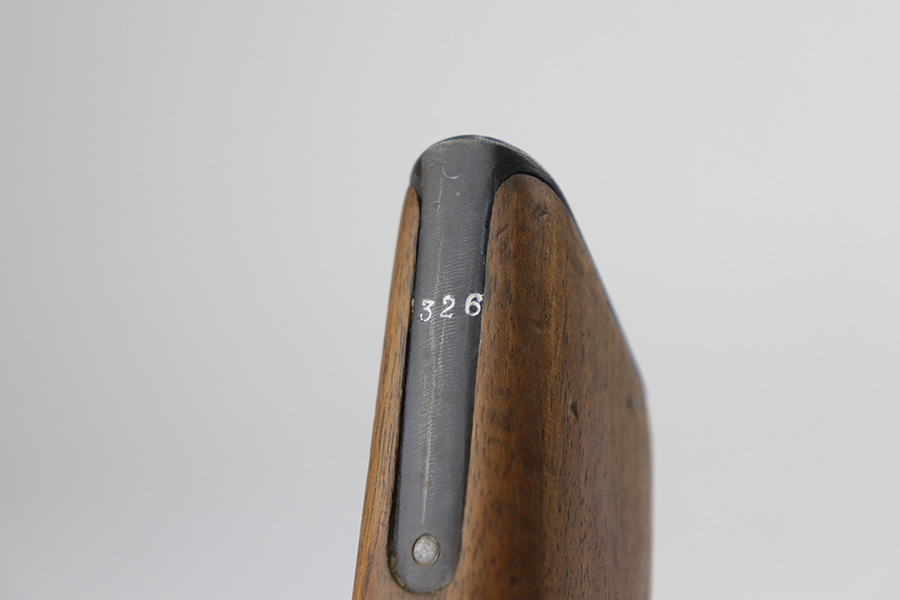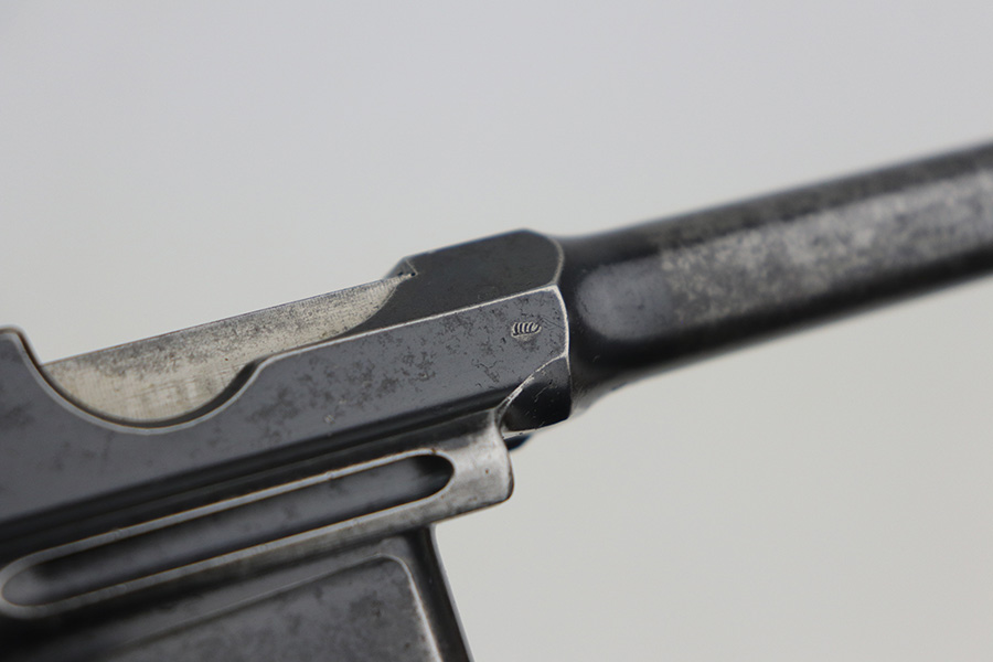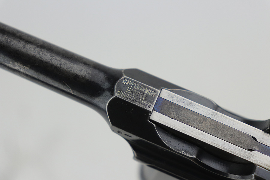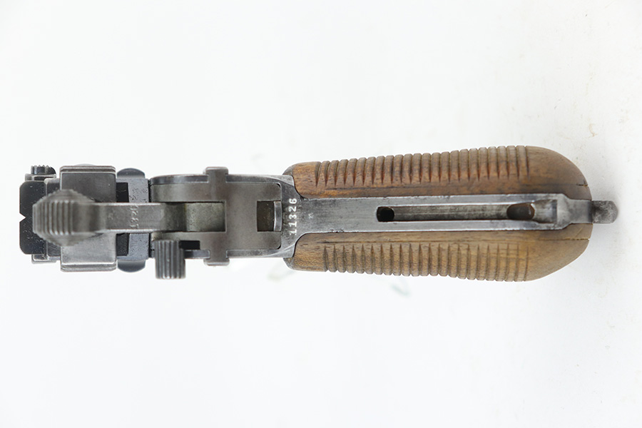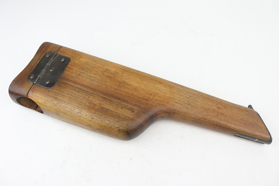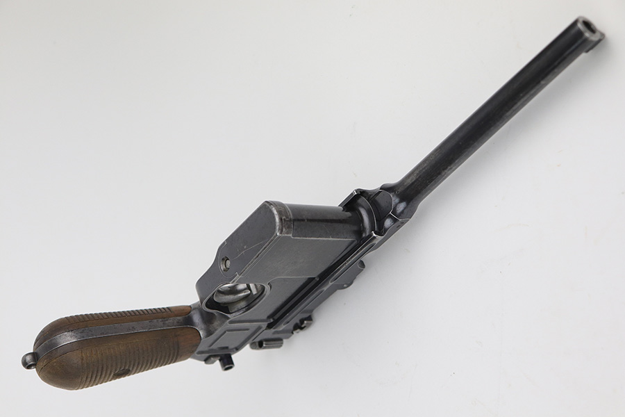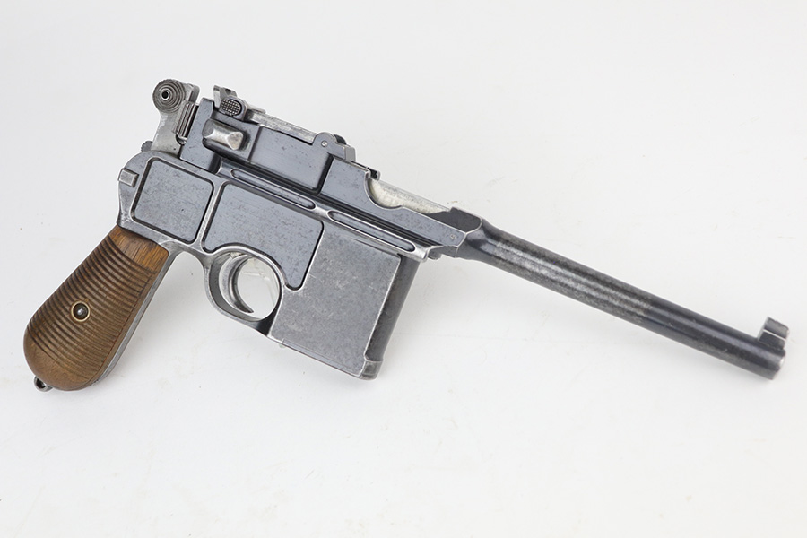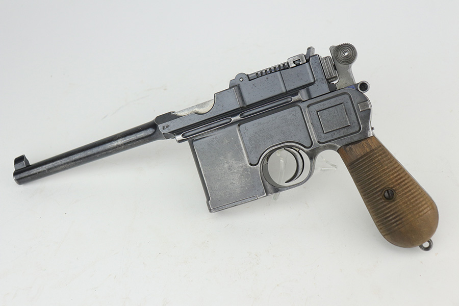 11/5/21 – This is a very early Mauser C96 Broomhandle, made in 1897, with the original, matching stock. Only about 14,000 guns were made with early features, including a cone shaped hammer that gave the gun its nickname. Chambered in a potent 7.63 Mauser caliber, these guns had ballistics comparable to light carbines, and could function as such when equipped with a detachable shoulder stock. They became especially popular with British officers, including Winston Churchill, and were used extensively in Boer wars. This particular gun has about 75-80% of the original blue, with notable wear on barrel and grip frame, but some thinning throughout. It has the original, matching numbered grips and they’re in excellent condition. Bore has decent rifling but notable frost and freckling throughout. Stock is also matching numbered to the pistol and in excellent condition, but it does have a professionally repaired crack in it. Antique so no licensing required.