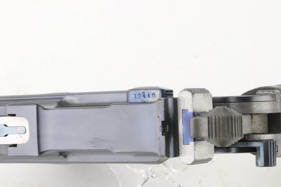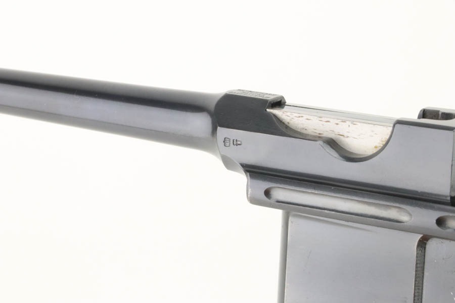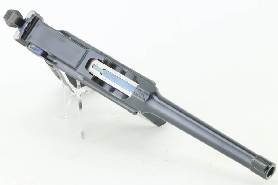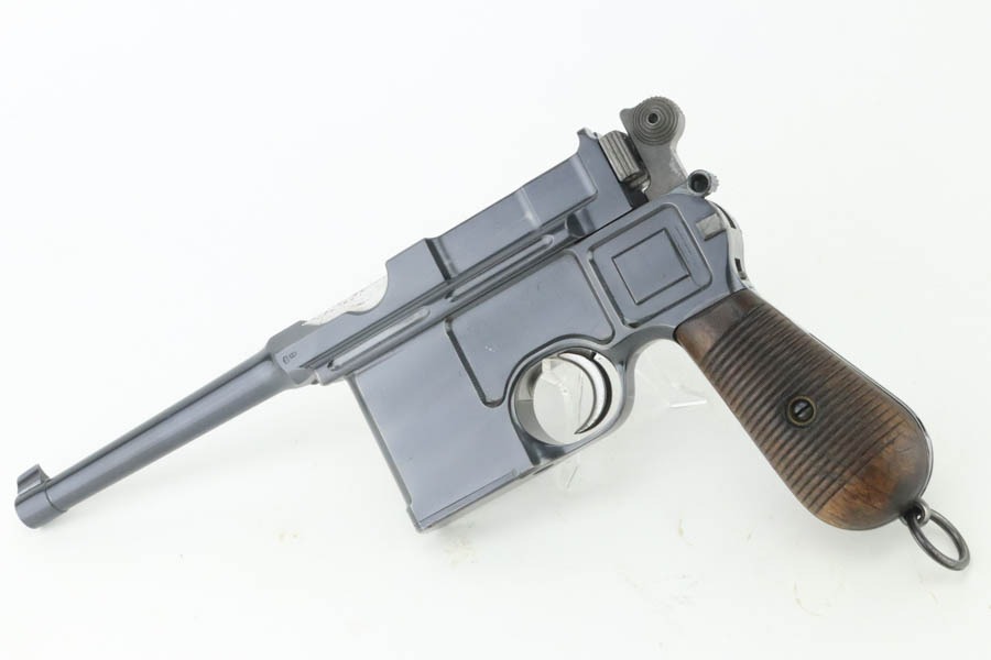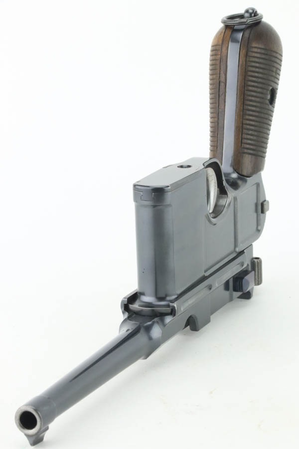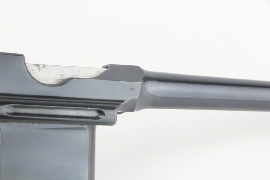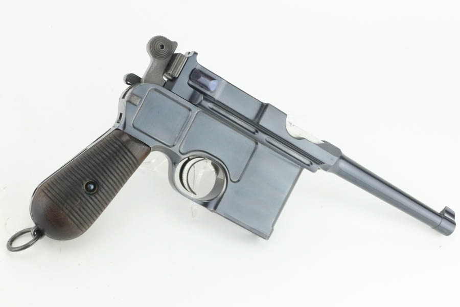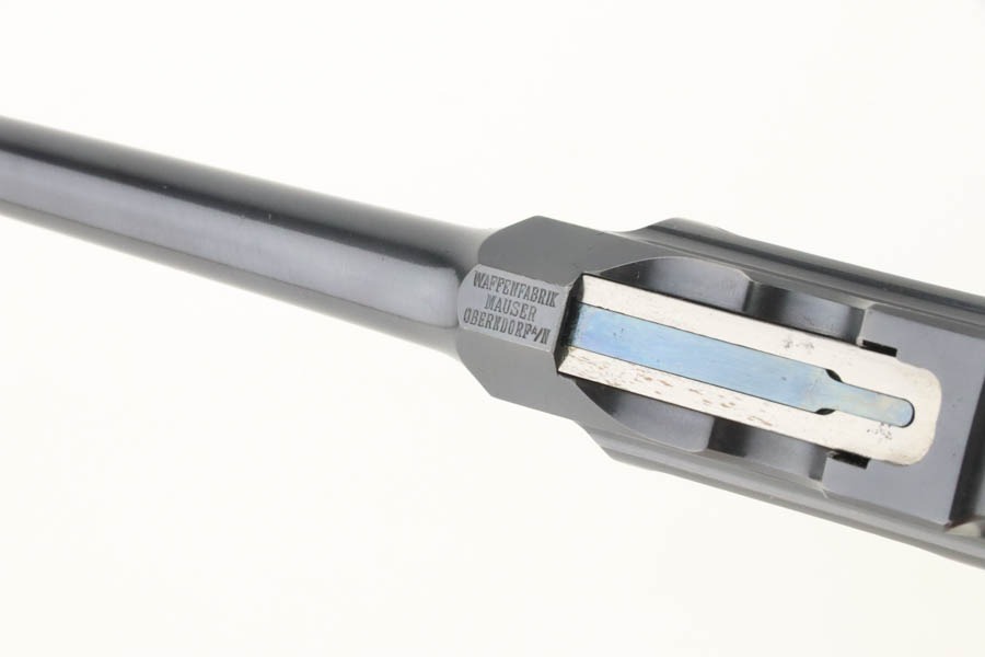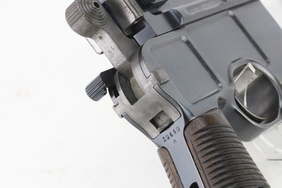 10/1/24 – This is a rare, early Mauser C96 Broomhandle rig with conehammer feature, one of ~13,000 produced. This pistol dates to 1897-98, and qualifies as an antique. The gun is all matching and shows almost no finish loss. We believe this one is a high-quality professional restoration – whoever did this work did a great job. Fitted with excellent matching-numbered grips. The rifling in the bore is a bit worn with noticeable pitting throughout. No FFL required.