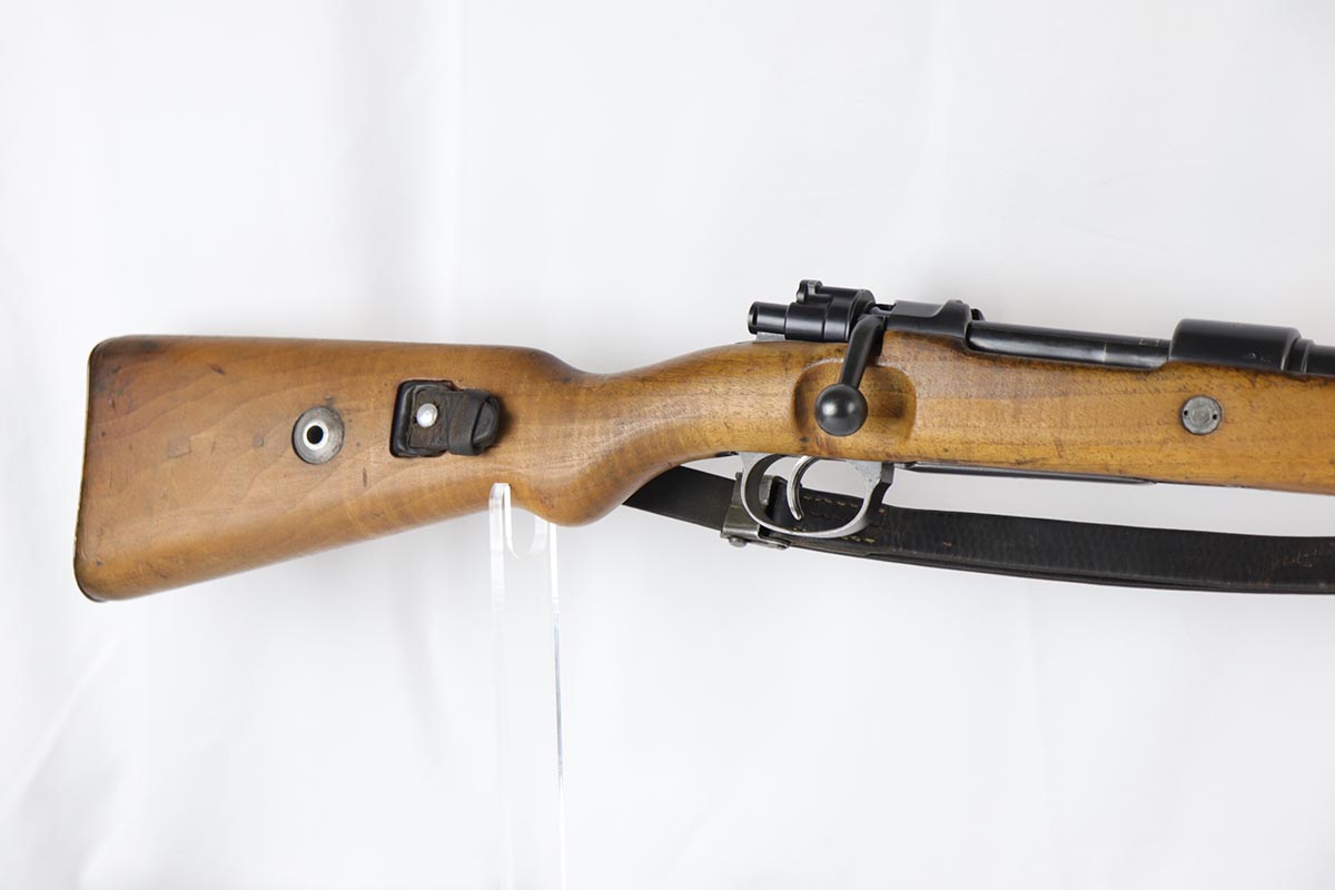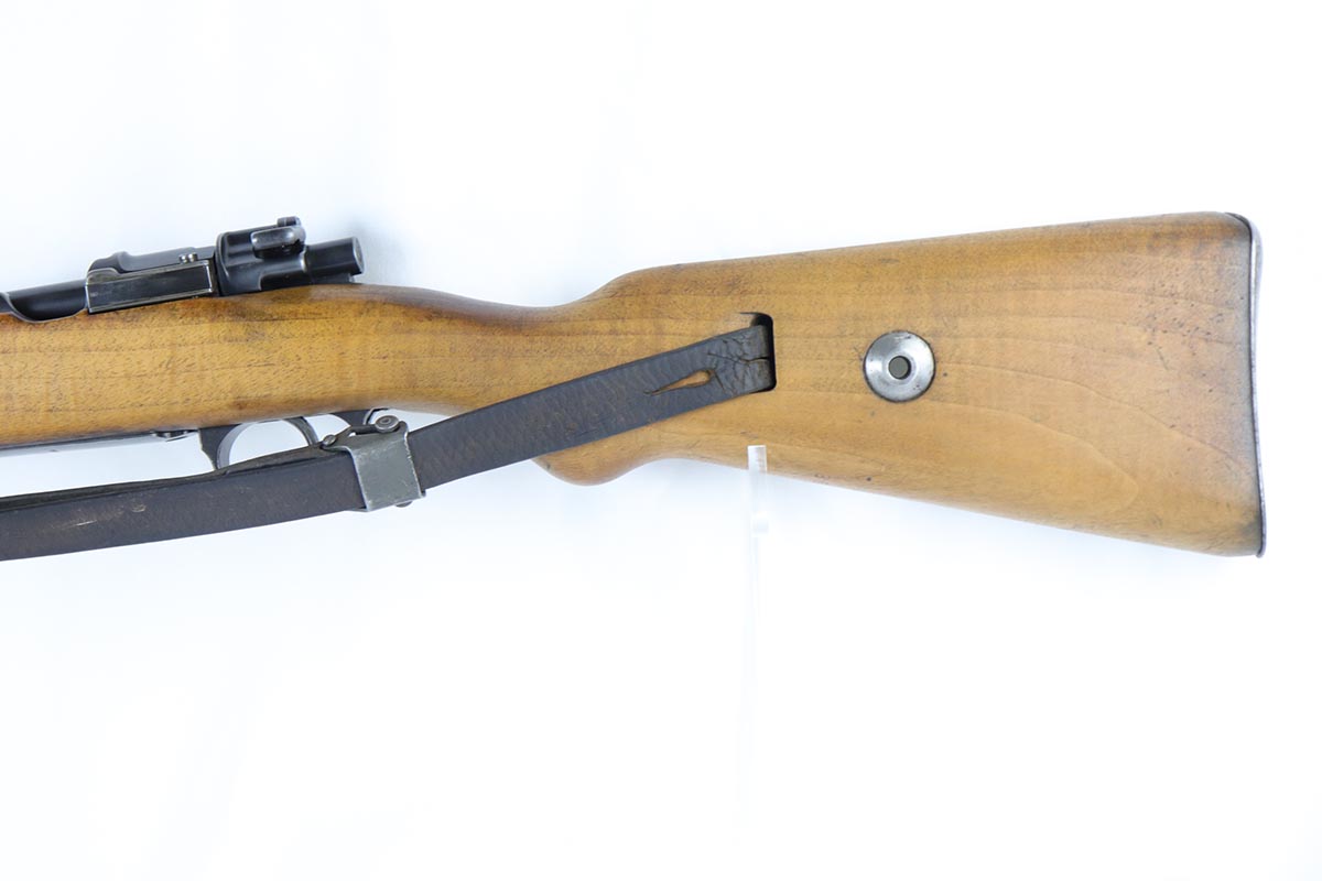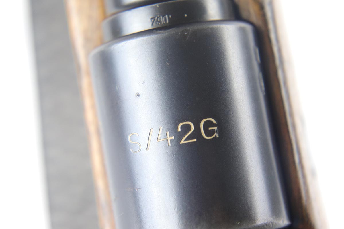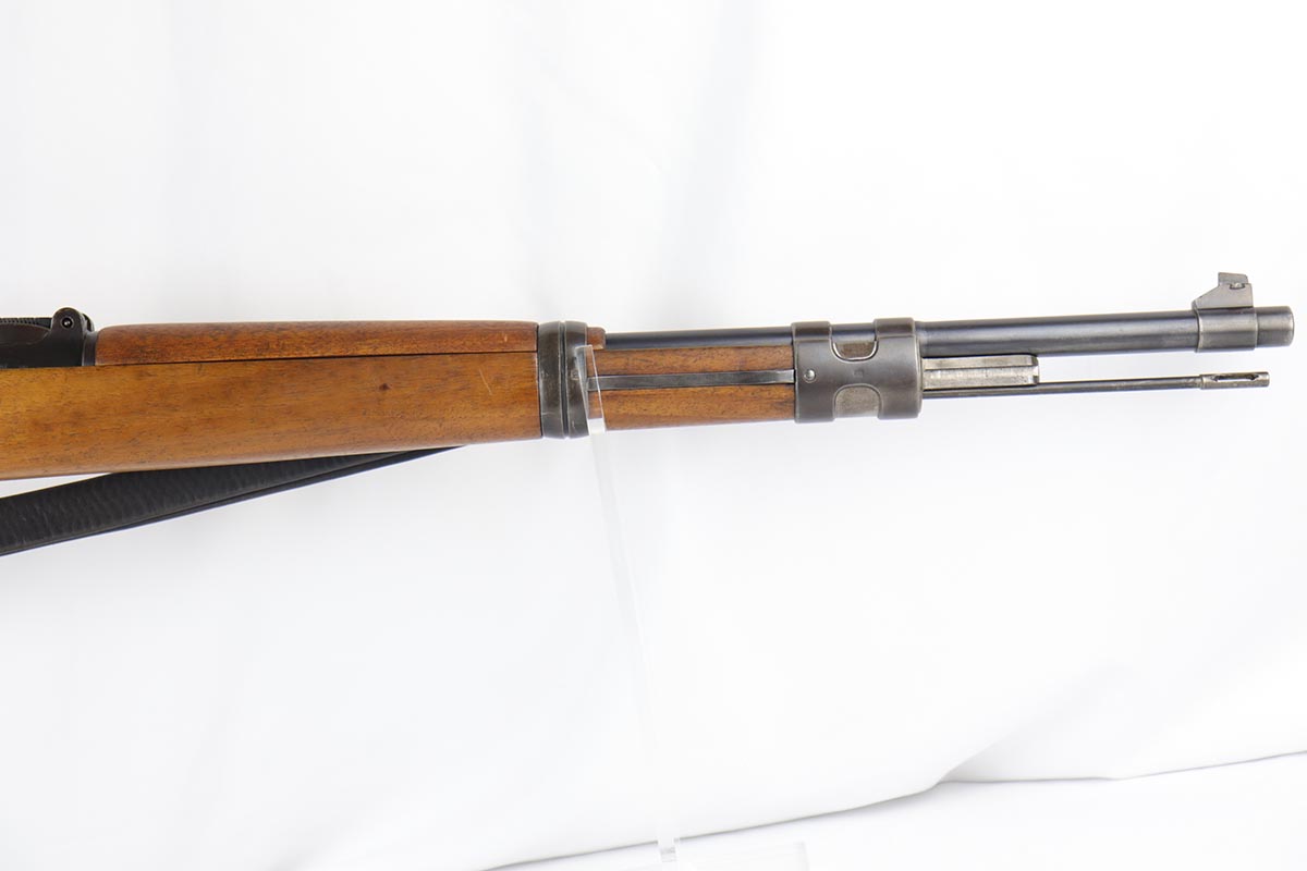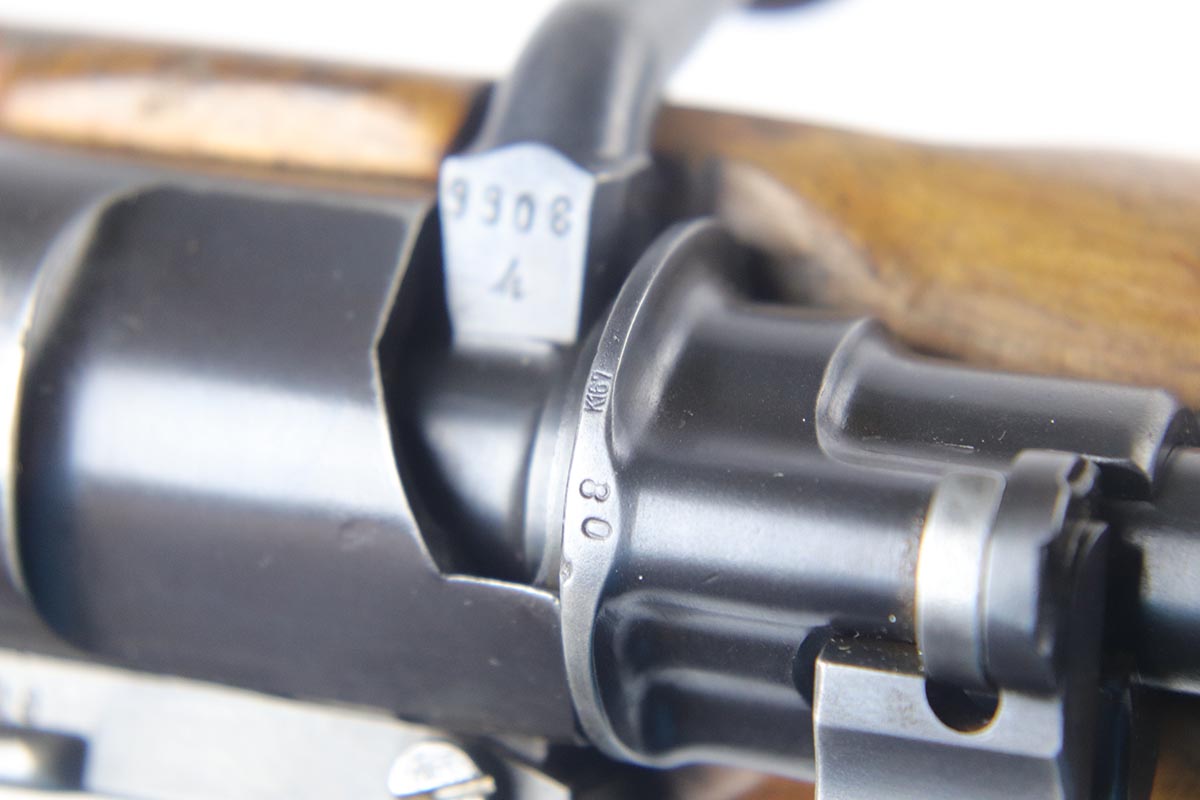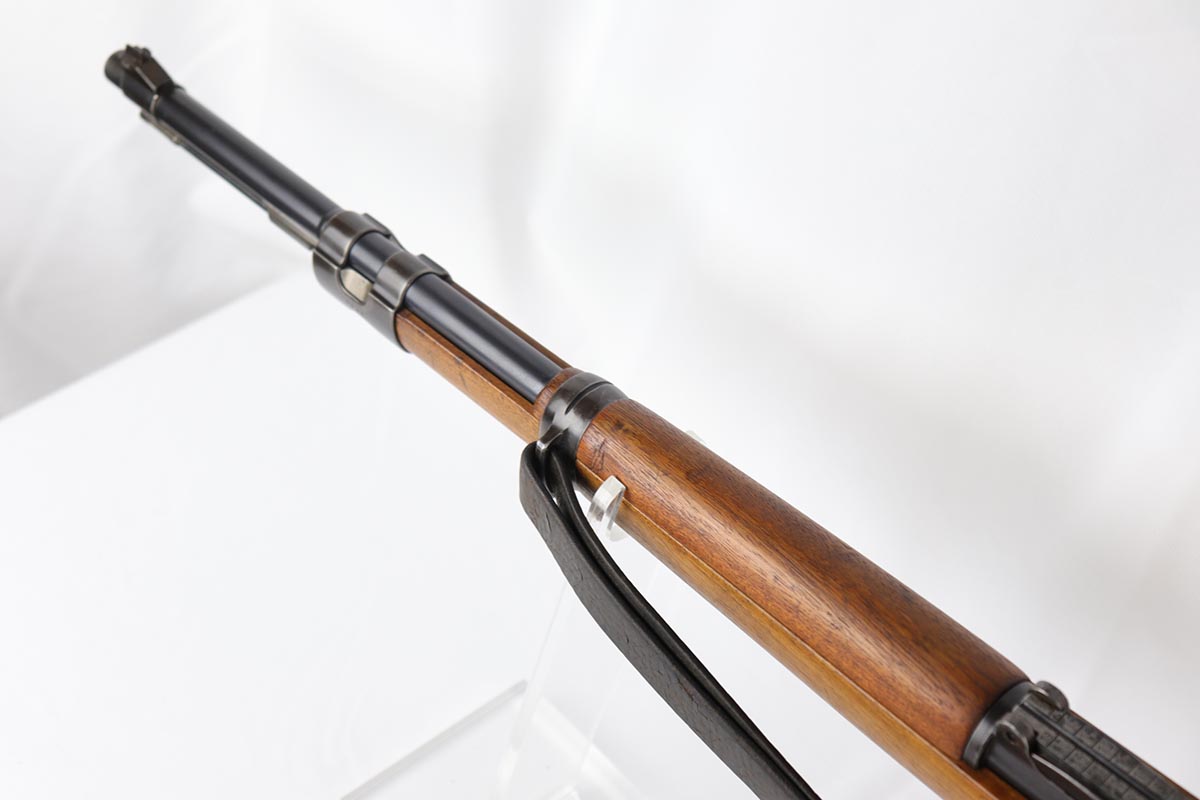 7/17/18 – This is an extremely rare G Date Mauser K98, manufactured in 1935 and featuring all matching numbers and original finish.  Introduced during the early years of the Nazi Party’s dominance of Germany, the code system was intended to obscure the scale and speed of German re-armament, and all correct G Date K98s are seldom available to the collector market.  The original finish rates at 90+% with some minor edge thinning and dulling of the finish, as well as muzzle wear on either side.  The bayo lug and area under the front barrel band are ‘in the white’, a feature of these early rifles that helps to ensure original bluing.  All numbered parts match the receiver, including the stock, hand guard and butt plate.  Loads of early acceptance proofs adorn this rifle as well.  Comes with an original sling and cleaning rod.  Terrifc bore.