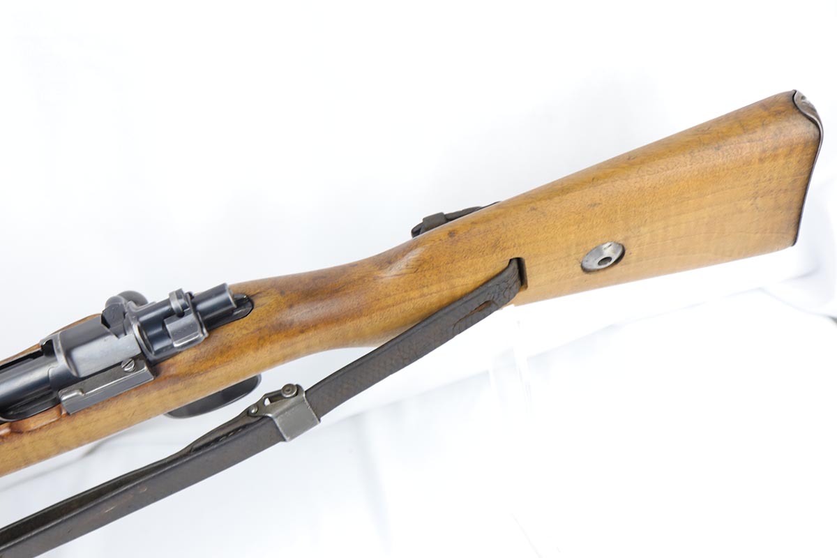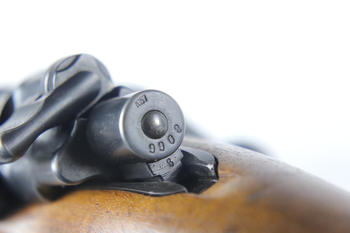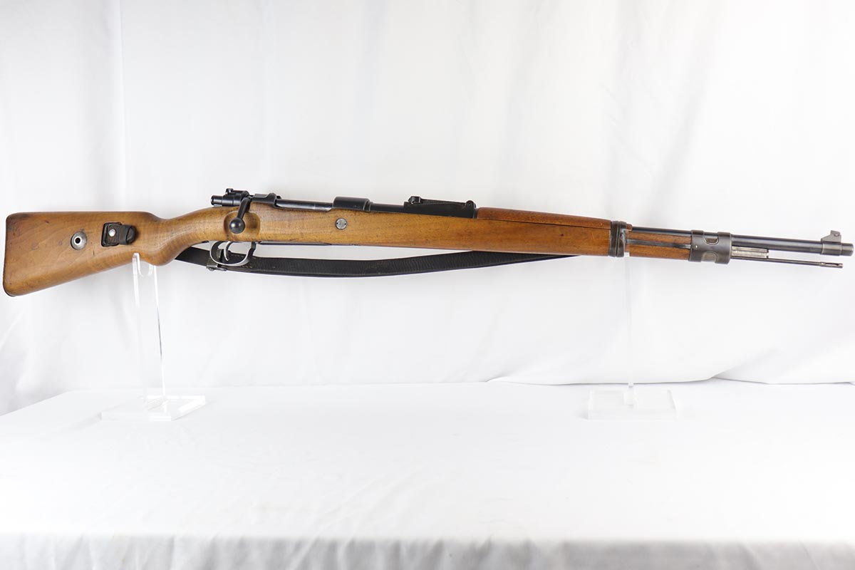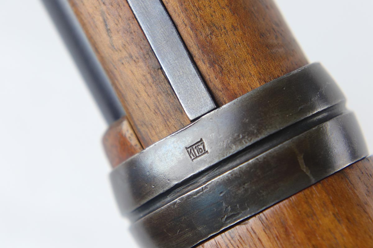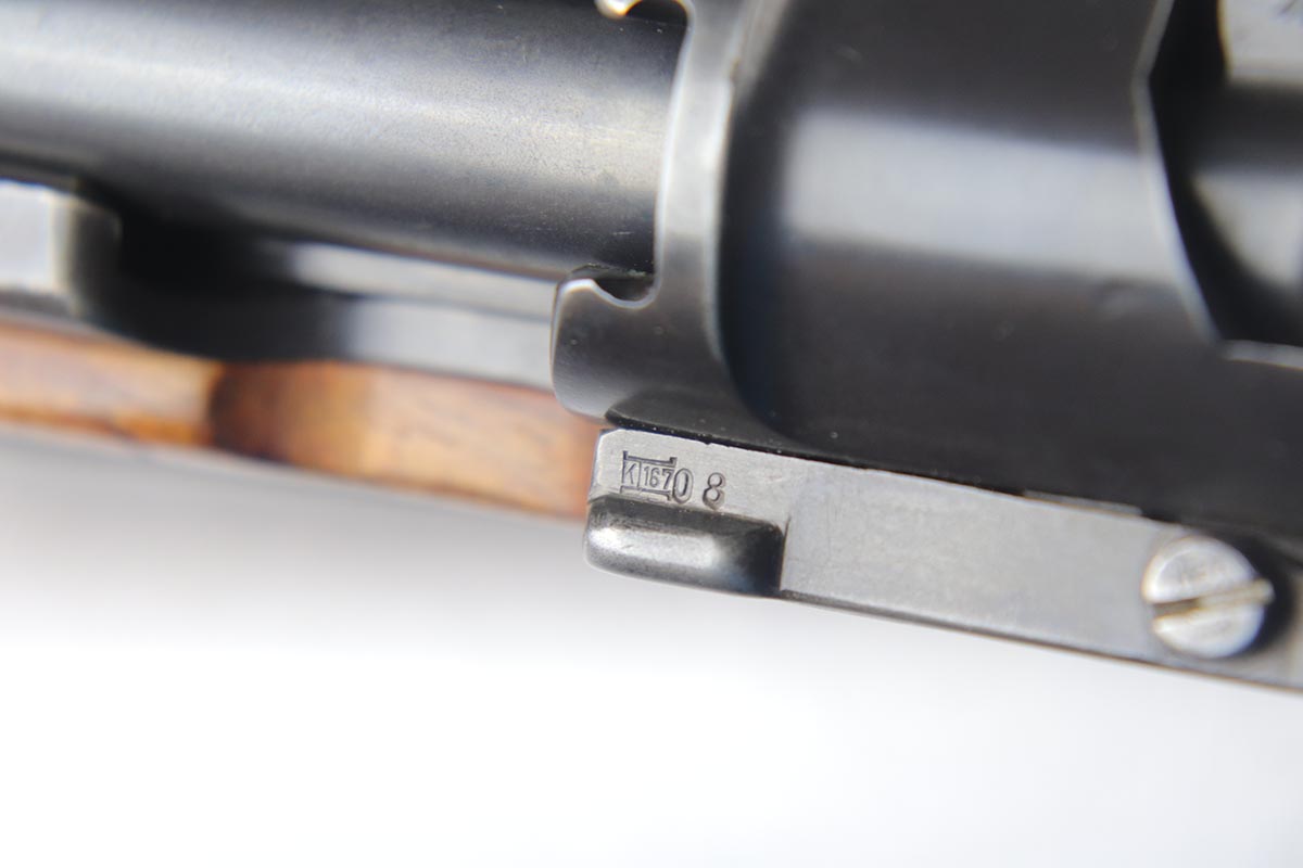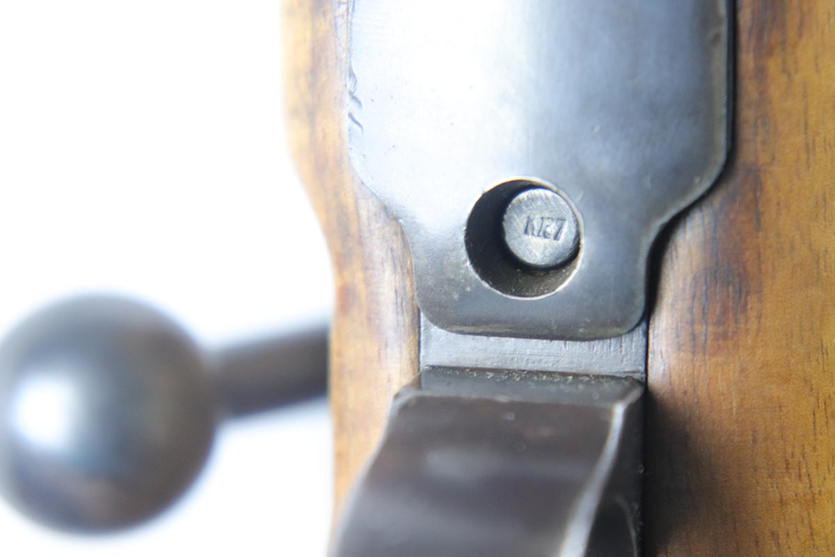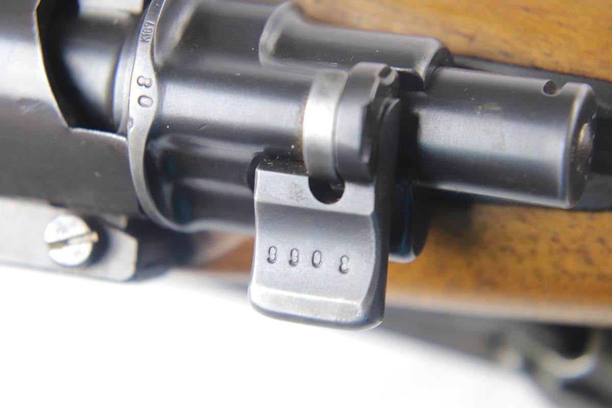 7/17/18 – This is an extremely rare G Date Mauser K98, manufactured in 1935 and featuring all matching numbers and original finish.  Introduced during the early years of the Nazi Party’s dominance of Germany, the code system was intended to obscure the scale and speed of German re-armament, and all correct G Date K98s are seldom available to the collector market.  The original finish rates at 90+% with some minor edge thinning and dulling of the finish, as well as muzzle wear on either side.  The bayo lug and area under the front barrel band are ‘in the white’, a feature of these early rifles that helps to ensure original bluing.  All numbered parts match the receiver, including the stock, hand guard and butt plate.  Loads of early acceptance proofs adorn this rifle as well.  Comes with an original sling and cleaning rod.  Terrifc bore.