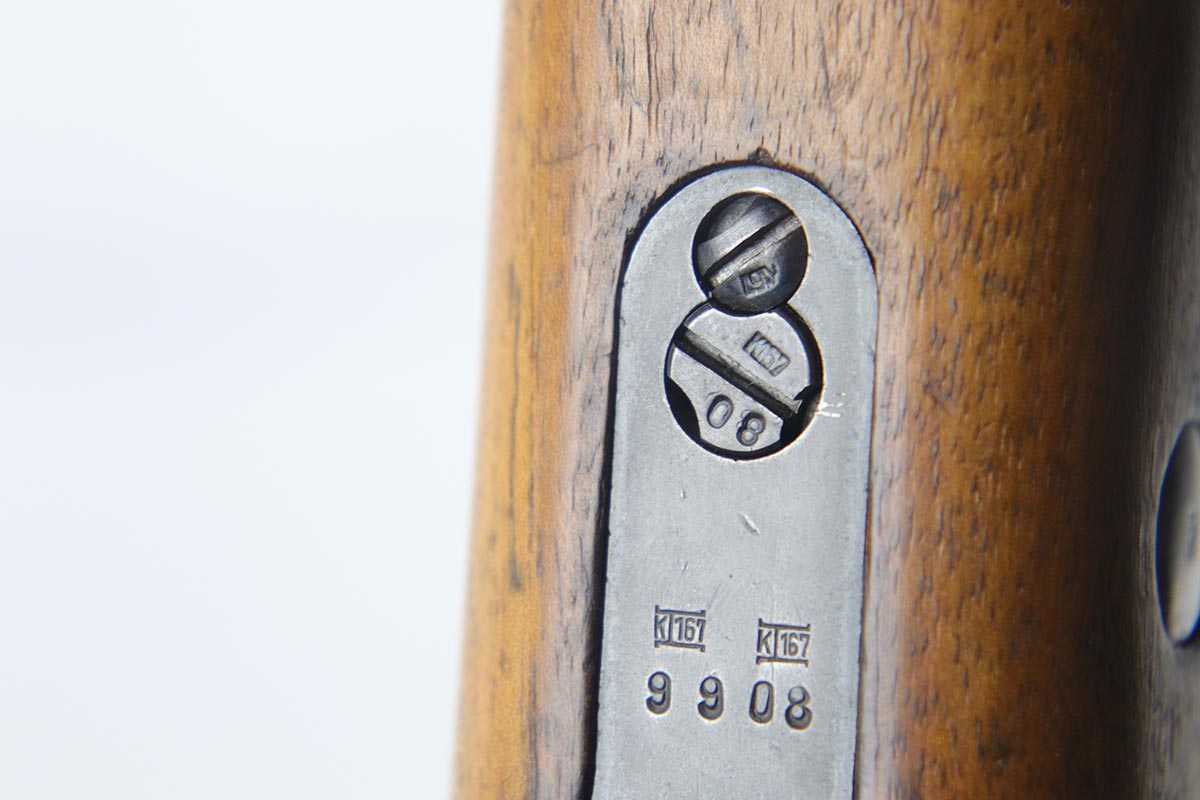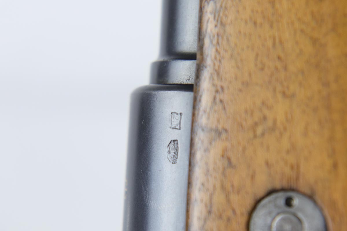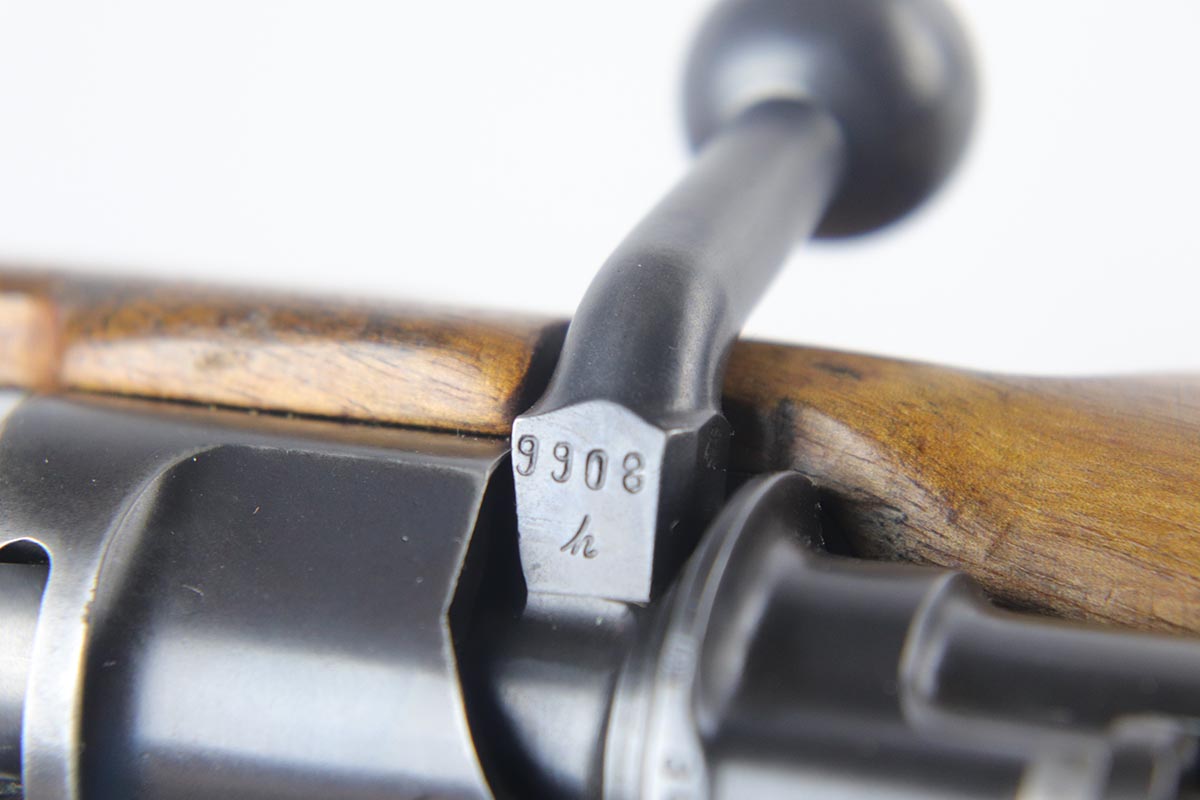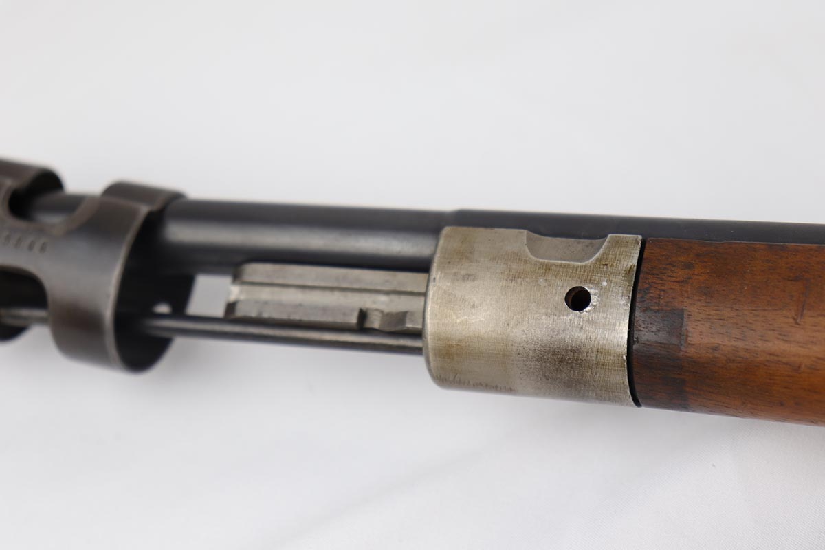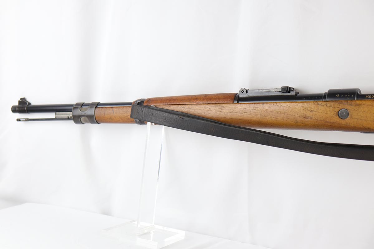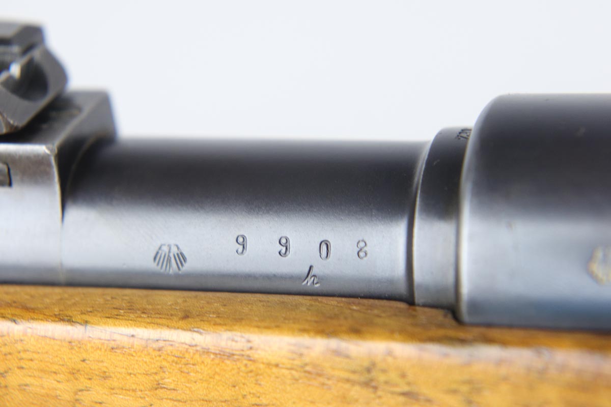 7/17/18 – This is an extremely rare G Date Mauser K98, manufactured in 1935 and featuring all matching numbers and original finish.  Introduced during the early years of the Nazi Party’s dominance of Germany, the code system was intended to obscure the scale and speed of German re-armament, and all correct G Date K98s are seldom available to the collector market.  The original finish rates at 90+% with some minor edge thinning and dulling of the finish, as well as muzzle wear on either side.  The bayo lug and area under the front barrel band are ‘in the white’, a feature of these early rifles that helps to ensure original bluing.  All numbered parts match the receiver, including the stock, hand guard and butt plate.  Loads of early acceptance proofs adorn this rifle as well.  Comes with an original sling and cleaning rod.  Terrifc bore.