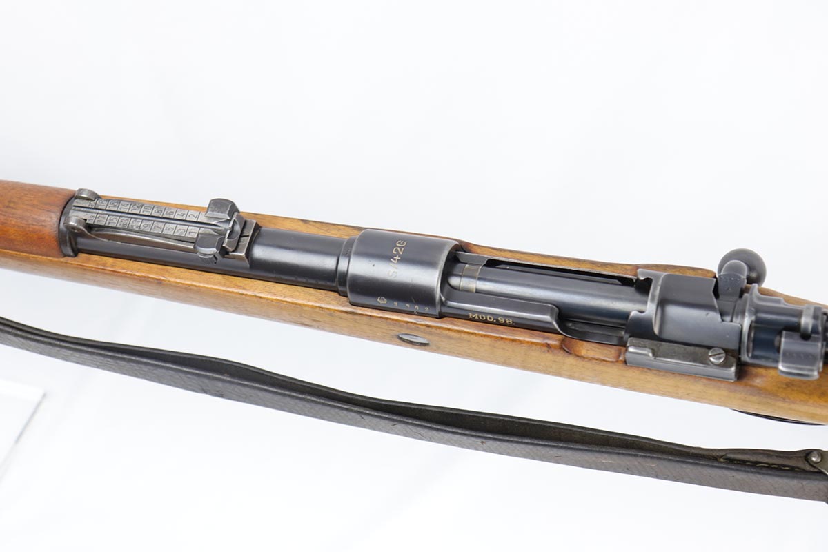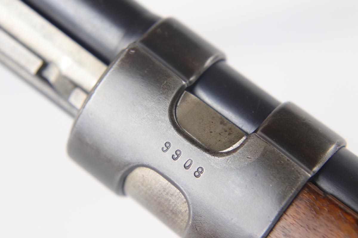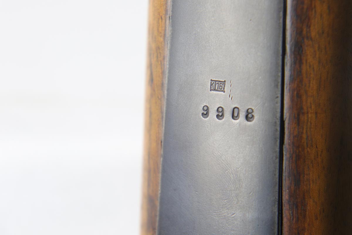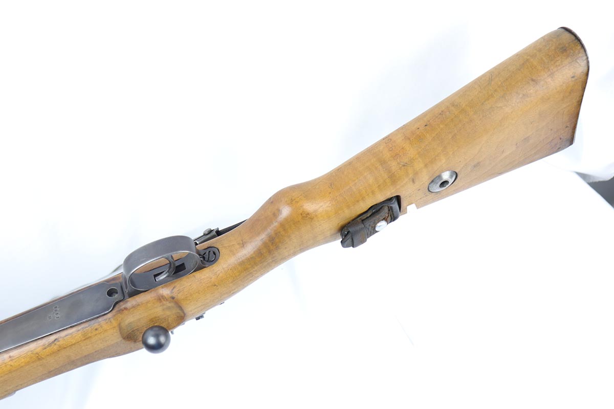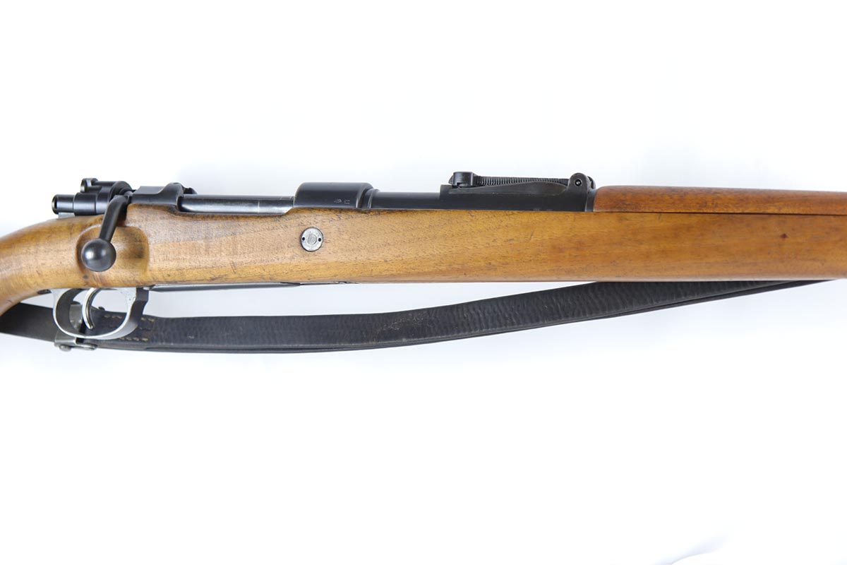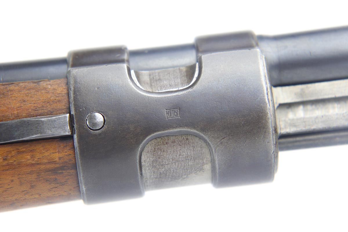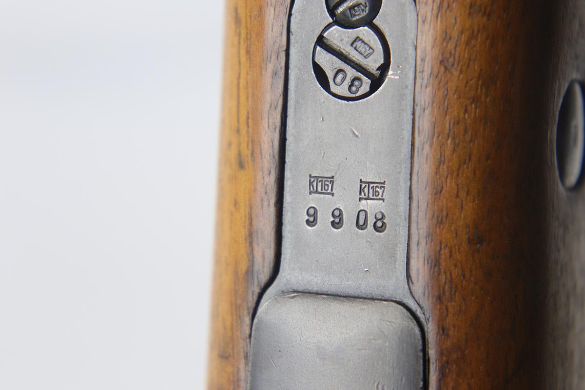 7/17/18 – This is an extremely rare G Date Mauser K98, manufactured in 1935 and featuring all matching numbers and original finish.  Introduced during the early years of the Nazi Party’s dominance of Germany, the code system was intended to obscure the scale and speed of German re-armament, and all correct G Date K98s are seldom available to the collector market.  The original finish rates at 90+% with some minor edge thinning and dulling of the finish, as well as muzzle wear on either side.  The bayo lug and area under the front barrel band are ‘in the white’, a feature of these early rifles that helps to ensure original bluing.  All numbered parts match the receiver, including the stock, hand guard and butt plate.  Loads of early acceptance proofs adorn this rifle as well.  Comes with an original sling and cleaning rod.  Terrifc bore.