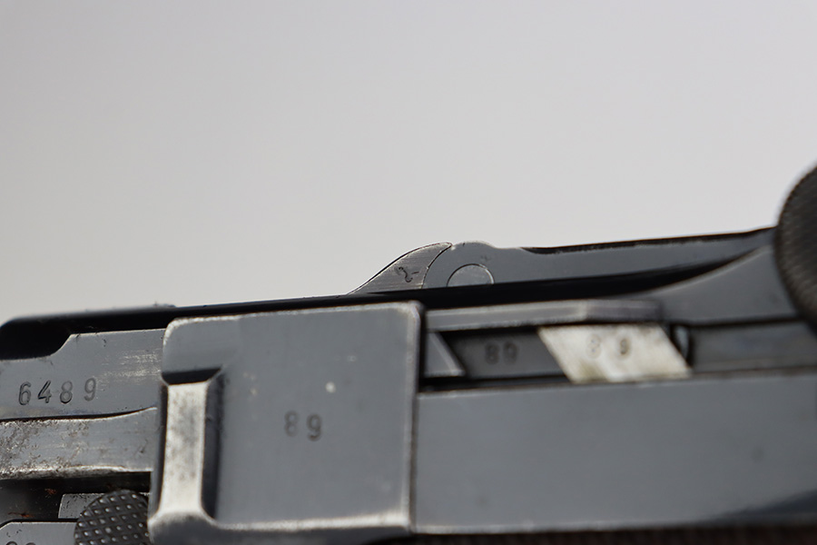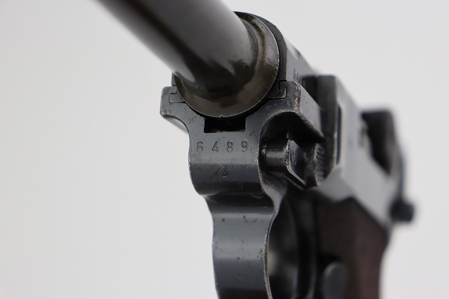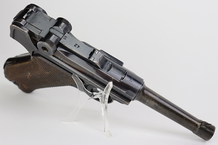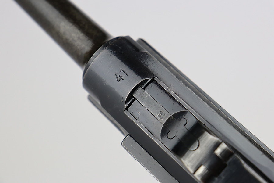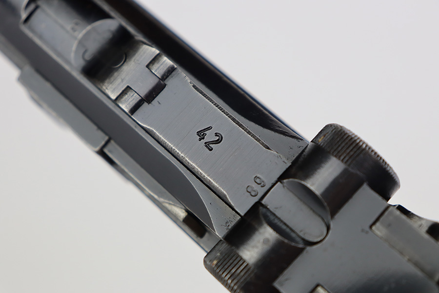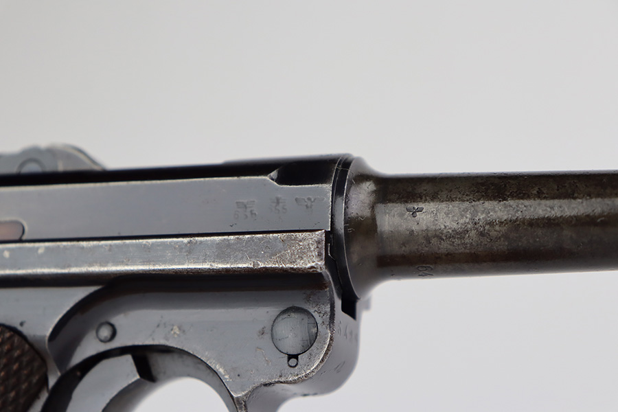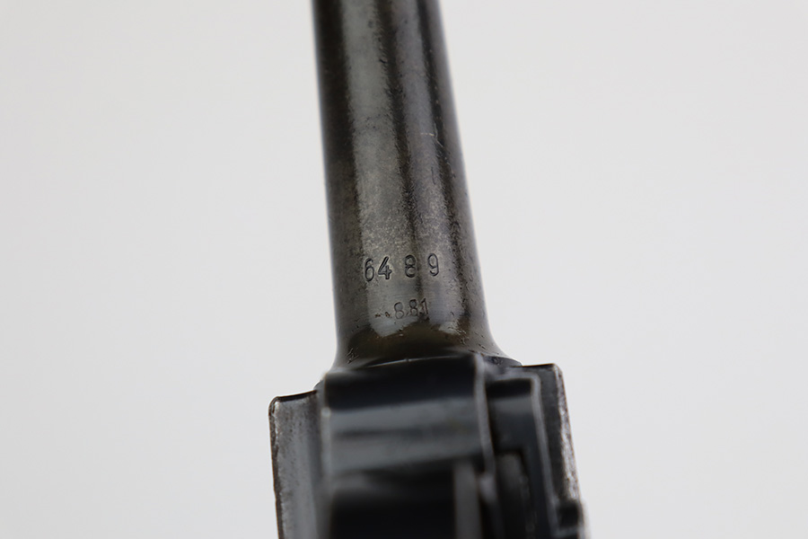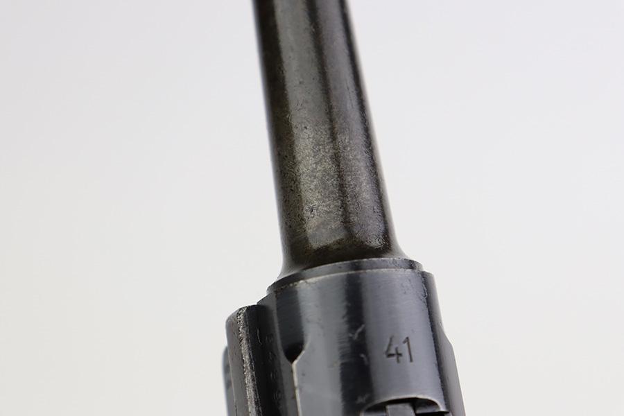 6/26/23 – This is a rare and desirable Luger variation – the 1941/42 Mauser Luger. Only about 7,000 made, making them even rarer than the K date Luger. This one is all matching, has the proper “Eagle 655” Nazi military proofs. The grips are E/655 proofed with no serial numbers, and fit the pistol snugly. The original blue on the pistol rates at about 80-85% with the majority of finish loss and pitting on the barrel. There is also some wear on the sideplate, right side rail and ejector, and pitting on the left side rail and right ear. The grips show some smoothing but no cracks or chips. The magazine is a rare E/211 marked example but has been renumbered. Bore is generally shiny with good rifling but has some freckling in the grooves.