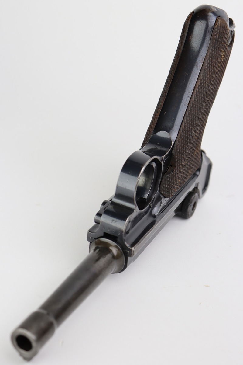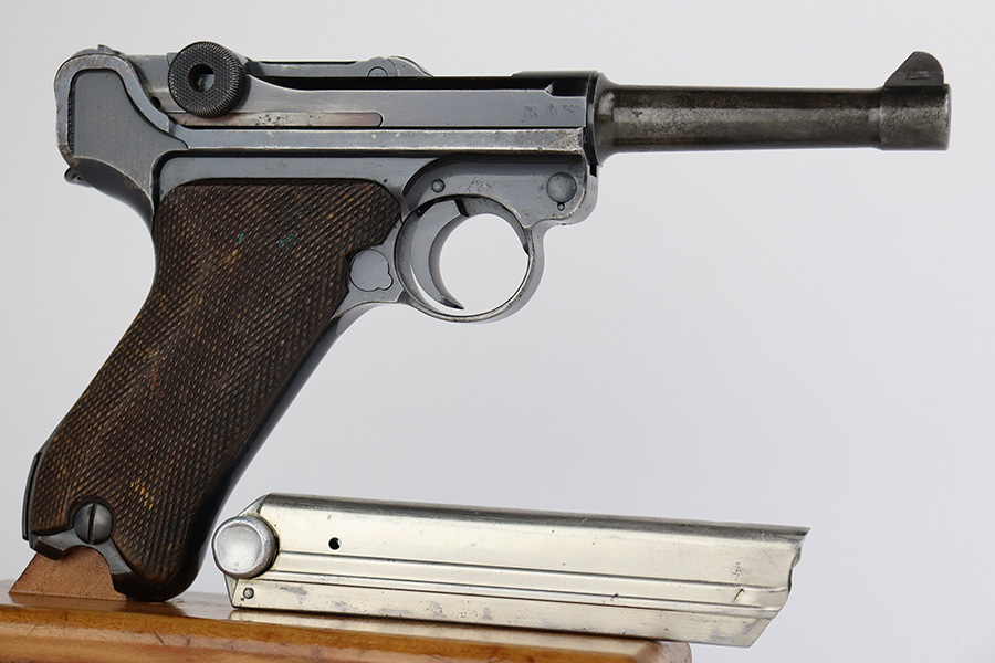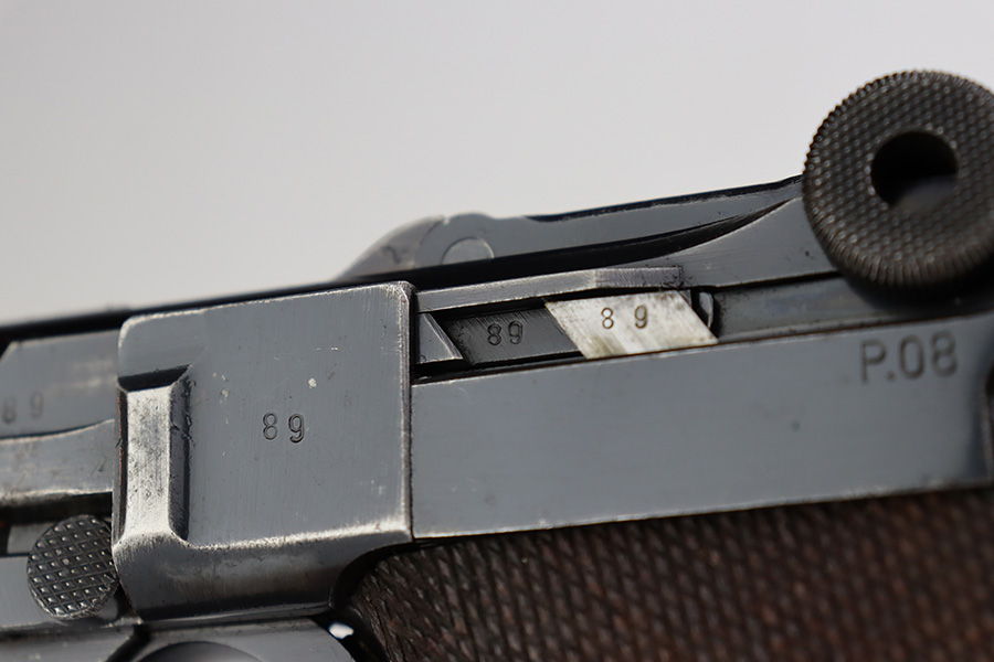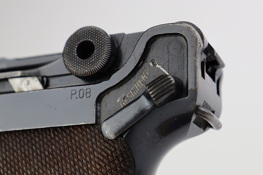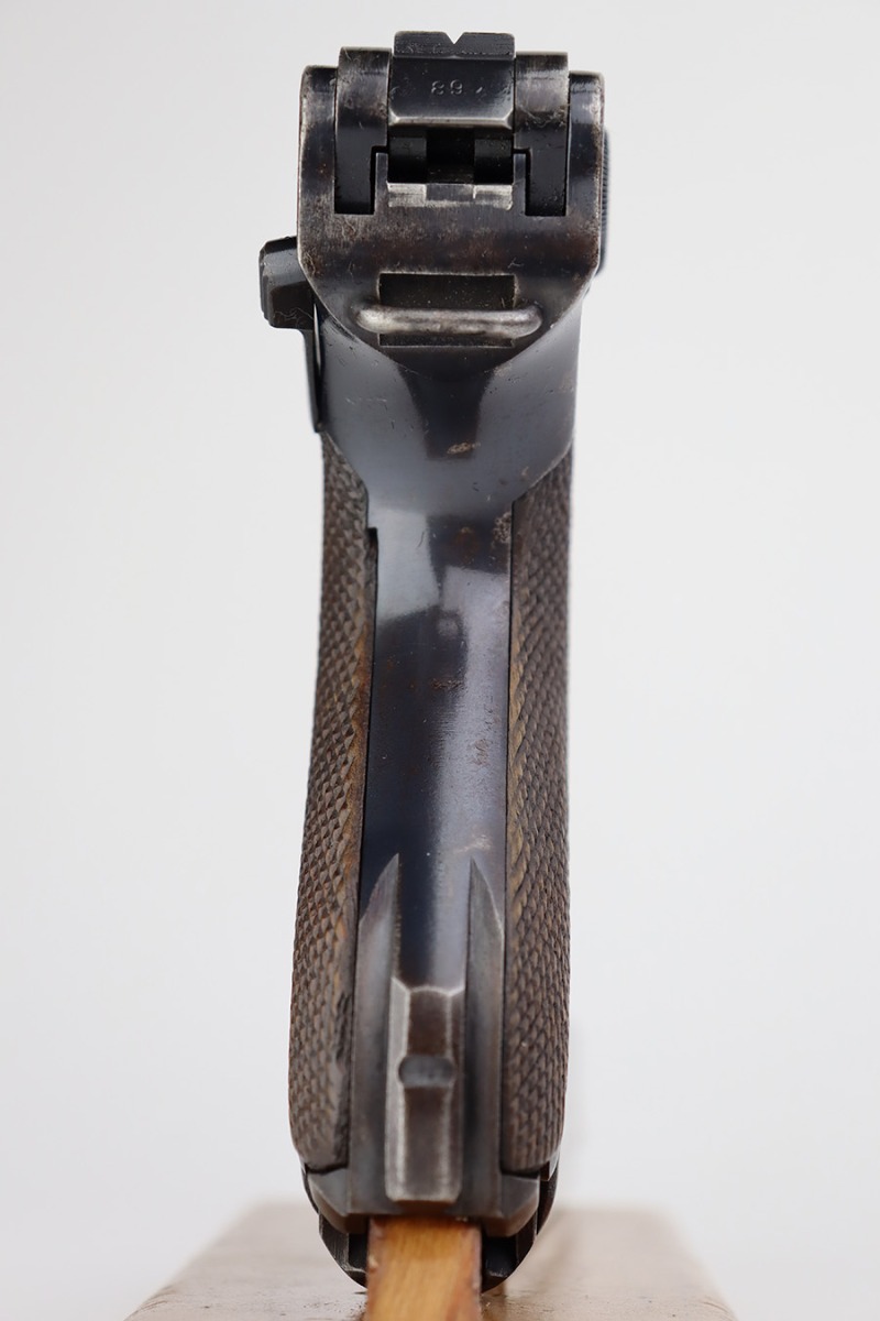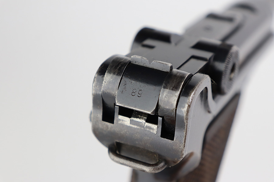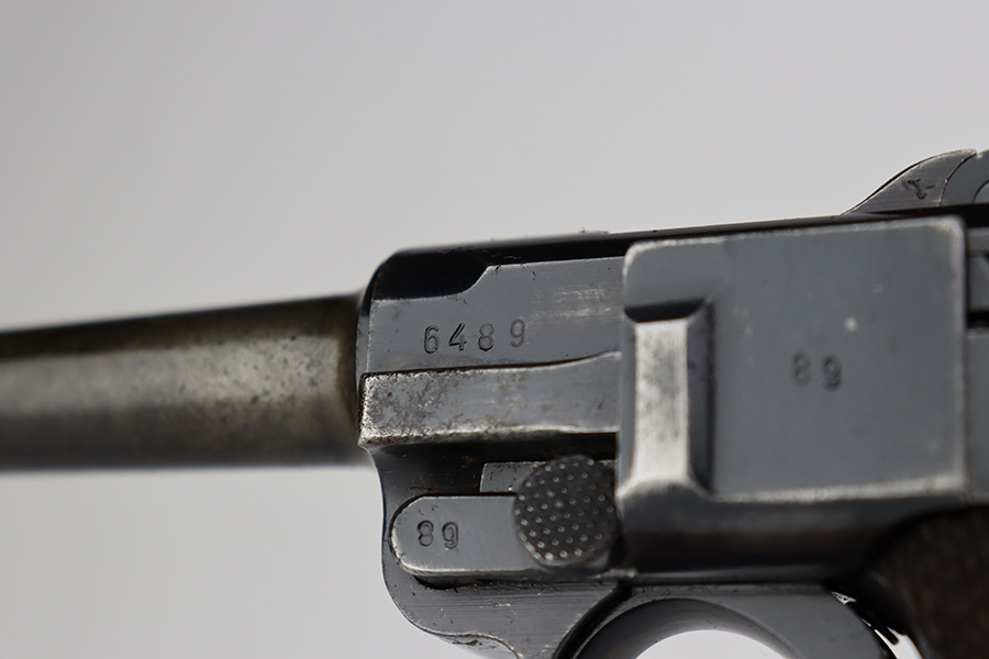6/26/23 – This is a rare and desirable Luger variation – the 1941/42 Mauser Luger. Only about 7,000 made, making them even rarer than the K date Luger. This one is all matching, has the proper “Eagle 655” Nazi military proofs. The grips are E/655 proofed with no serial numbers, and fit the pistol snugly. The original blue on the pistol rates at about 80-85% with the majority of finish loss and pitting on the barrel. There is also some wear on the sideplate, right side rail and ejector, and pitting on the left side rail and right ear. The grips show some smoothing but no cracks or chips. The magazine is a rare E/211 marked example but has been renumbered. Bore is generally shiny with good rifling but has some freckling in the grooves.