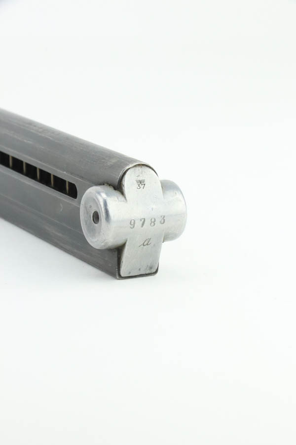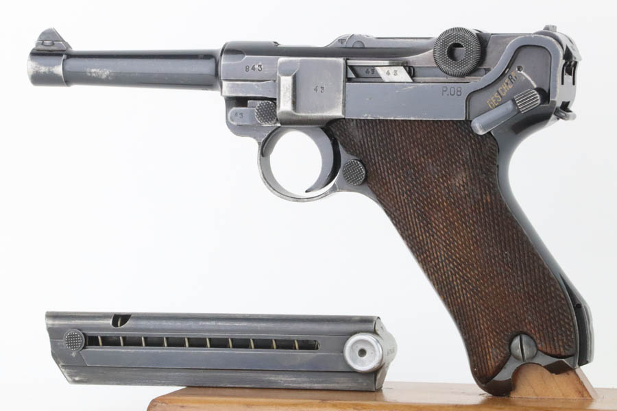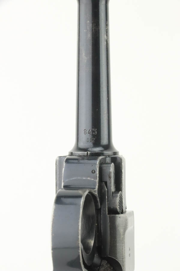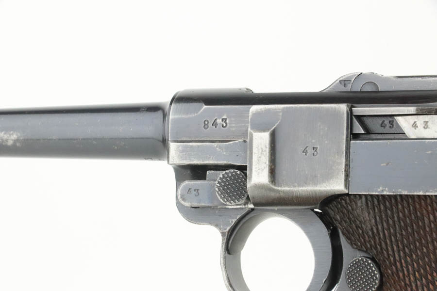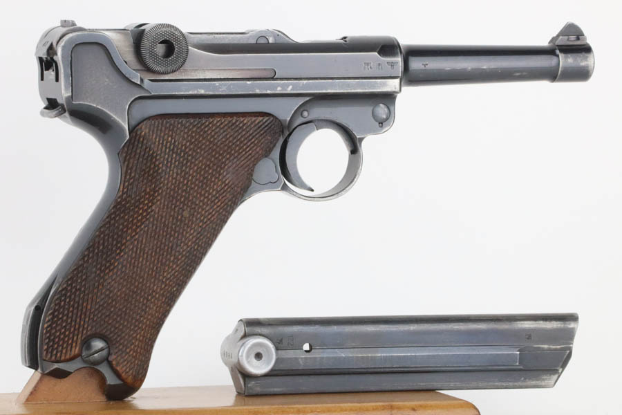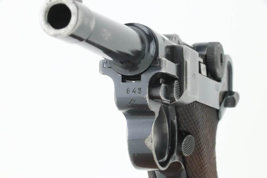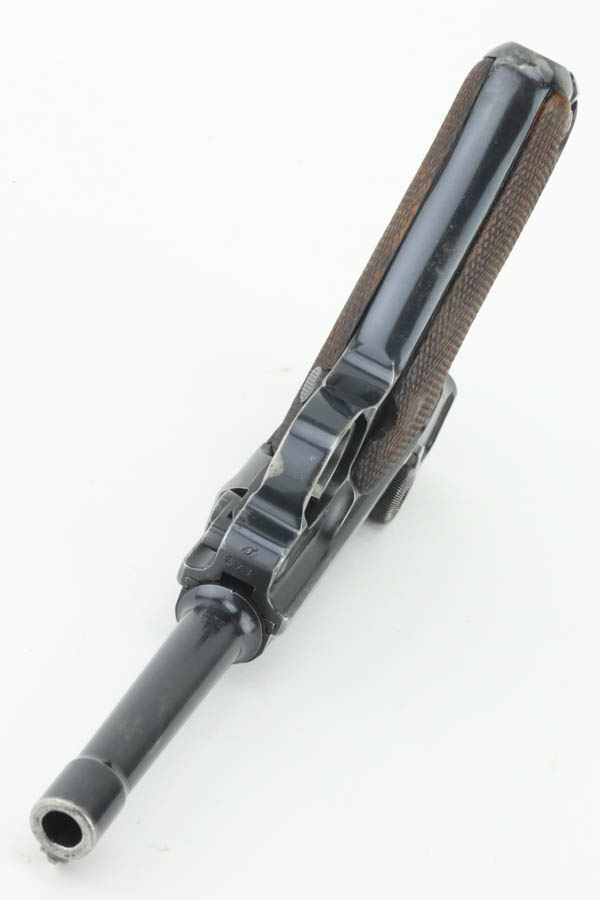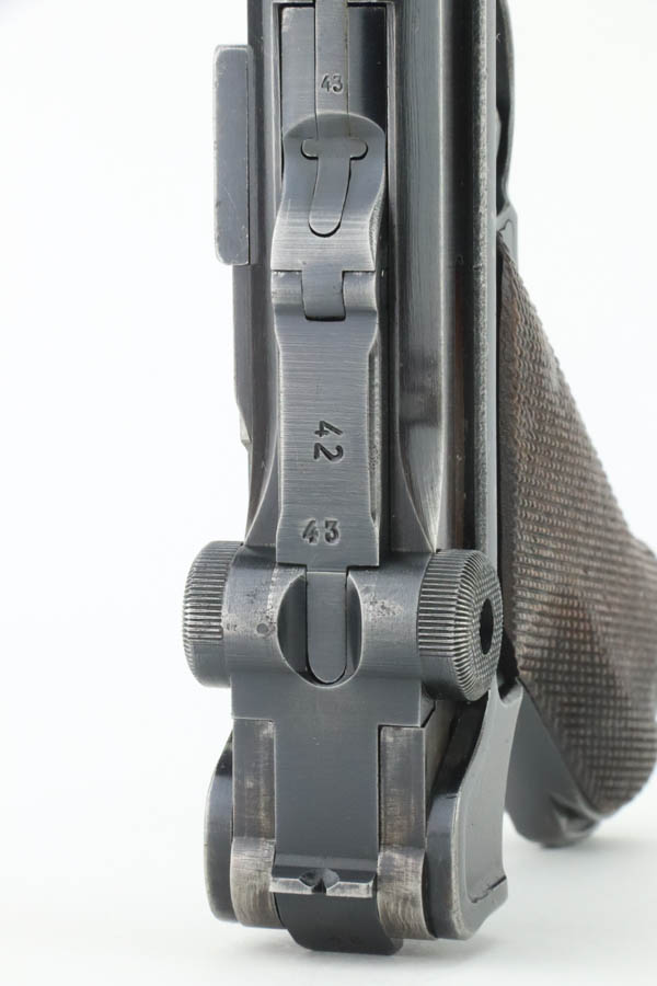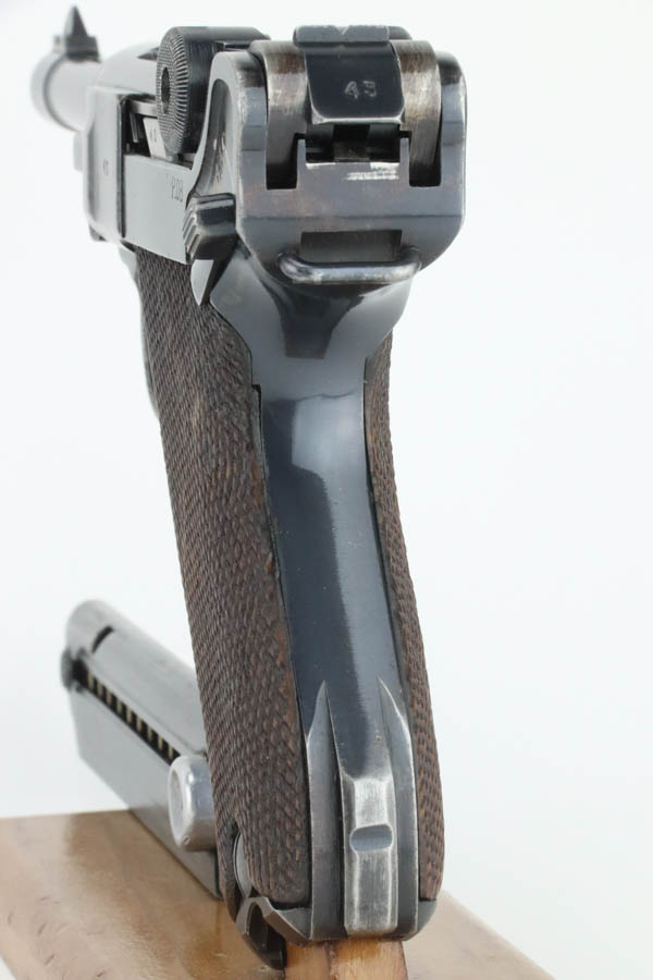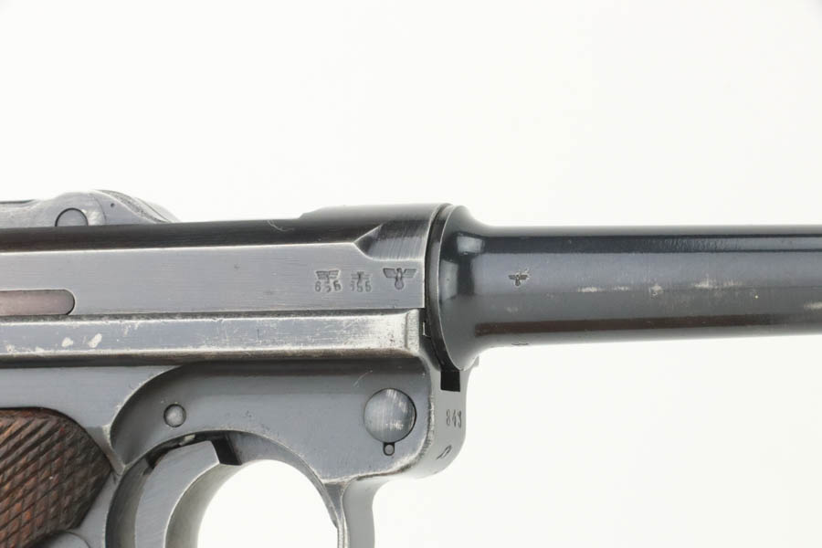 7/31/24 – This is a rare and desirable Luger variation – the 1941/42 Mauser Luger. Only about 7,000 made, making them even rarer than the K date Luger. This one is all matching, has the proper “Eagle 655” Nazi military proofs. It has retained about 90% of its original finish. There is honest wear throughout, concentrated mostly around the high edges and around the muzzle. Fitted with excellent “Eagle 655” proofed wood grips and comes with a mismatched “Eagle 37” magazine. The bore has great rifling with some frosting in the grooves.