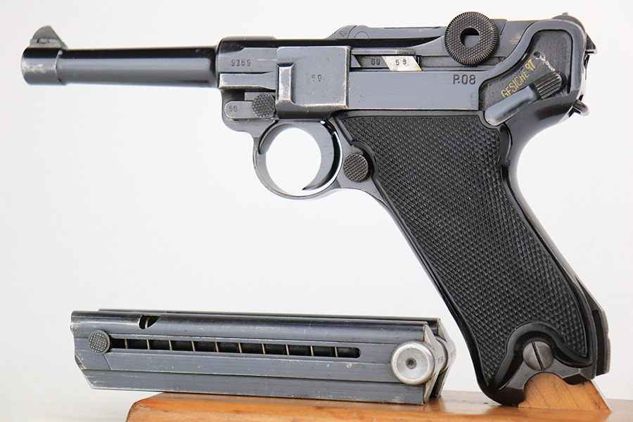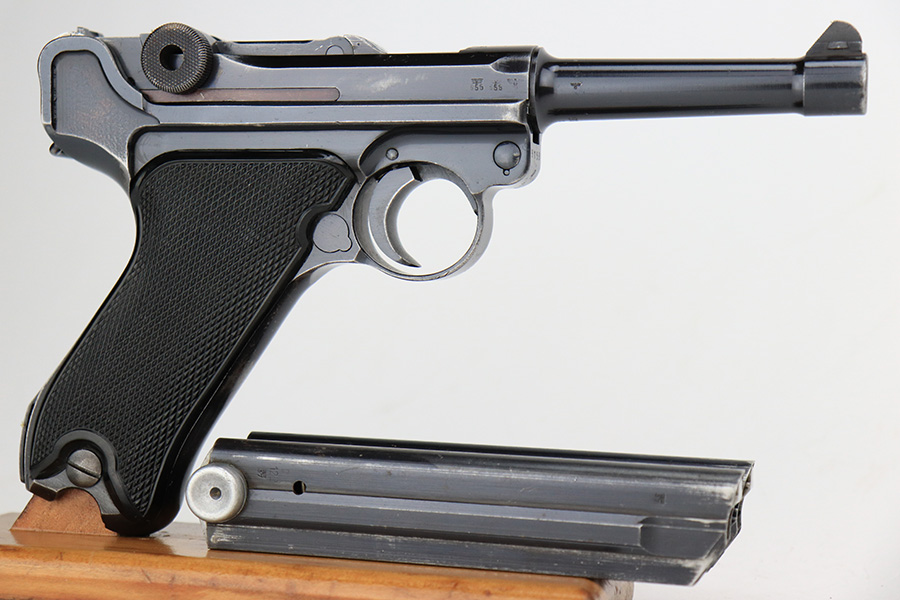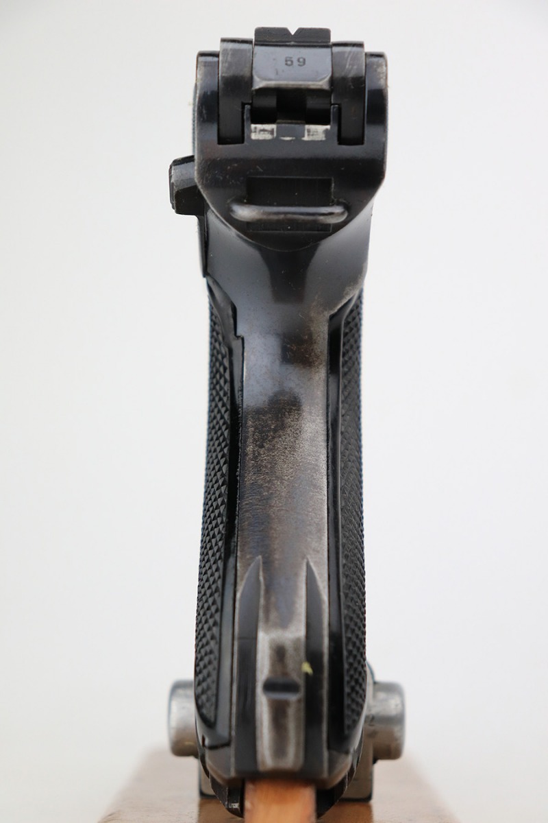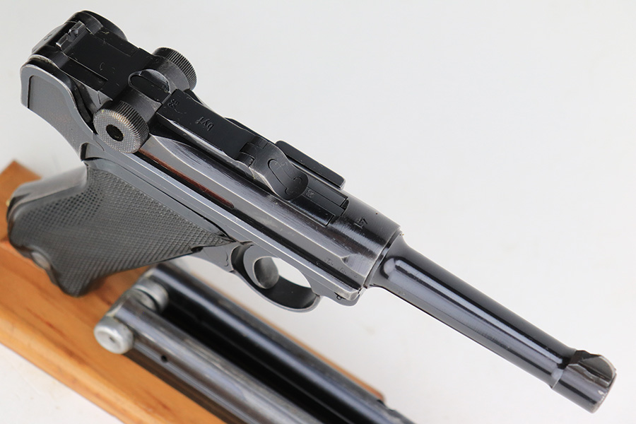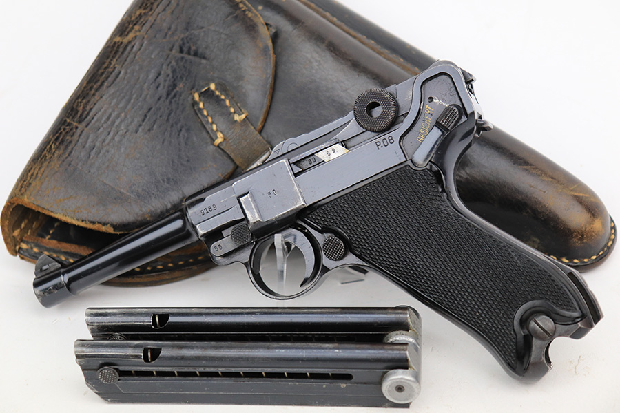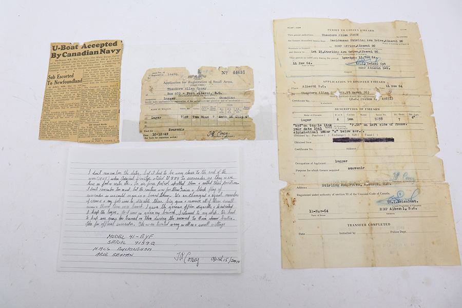 6/2/23 – This is a very rare Mauser Luger rig from 1941 that was captured from a U-Boat officer, and was featured in one of our Youtube videos that is linked below. The listing includes a signed statement from Theodore Allen Coney that details how he obtained this pistol specifically from U-889. It also includes the firearm registration he filed in 1949, as well as packets of history on this U-Boat. The pistol is all matching and original, including one of the original magazines. It has a nice profile view but the majority of the bluing loss is on the grip straps. Excellent black widow style grips. The spare magazine is period original but mismatched to this pistol, and it comes in an original ’42 holster that has been cut in a couple of places. Listing also includes a copy of a book about U-Boats by Michael L. Hadley.