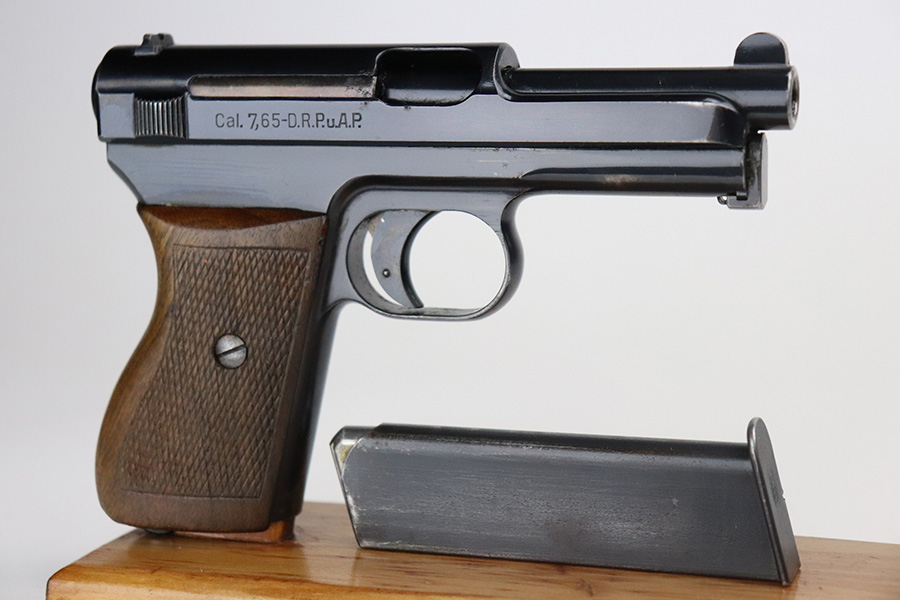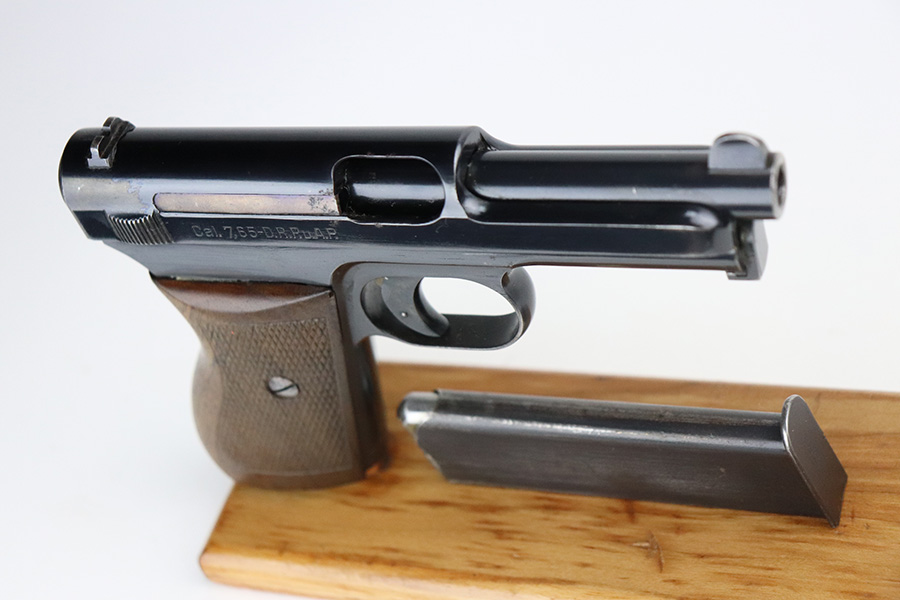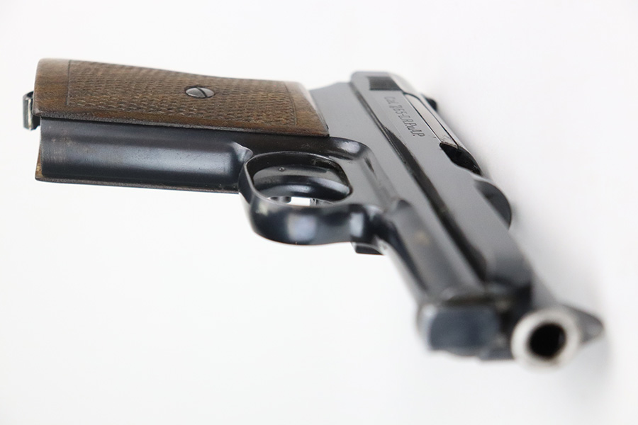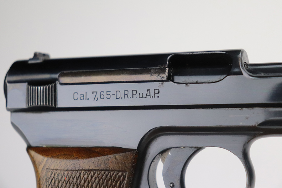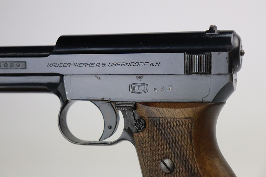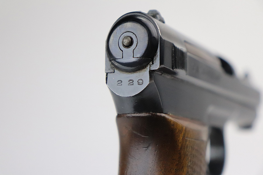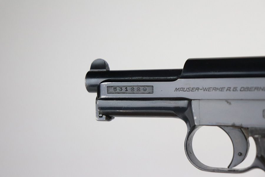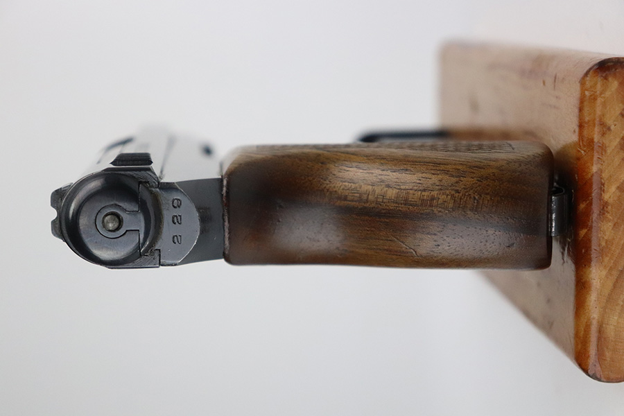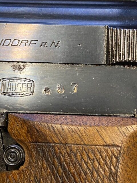8/2/21 – This is a Mauser M1934 that was made in the 1930s, and appears to be a rare Chinese contract. If anyone is familiar with this particular variation, feel free to email us, but the following is our best guess from research. The pistol falls into a serial range of similar contract pistols that went to China, many of which going to Shanghai police/security. This pistol does not have identical markings to the Shanghai examples but it does appear to have an arsenal number. So it may not be Shanghai police contract specifically, but could have ended up with Chinese military or officer in the 1930s-40s. It has nice, original bluing throughout with minor wear on trigger guard and front strap, and a little more on high edges of slide. There are also a couple small areas of pitting. Strong, shiny bore. Excellent grip with no cracks.