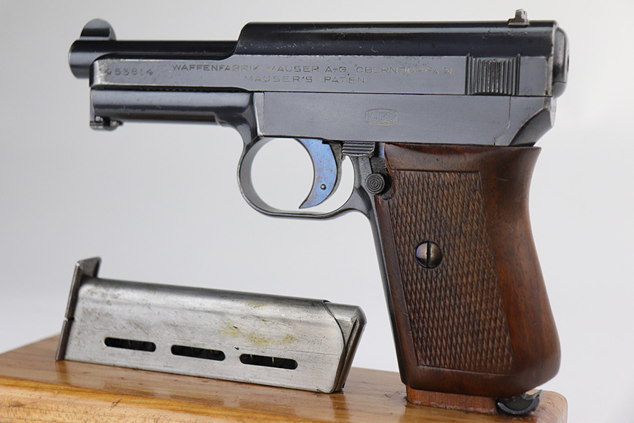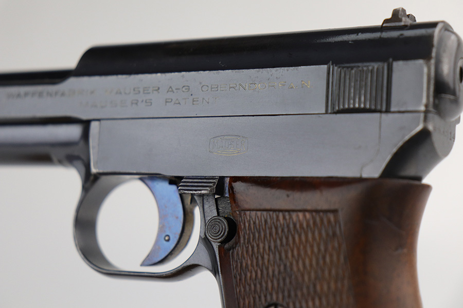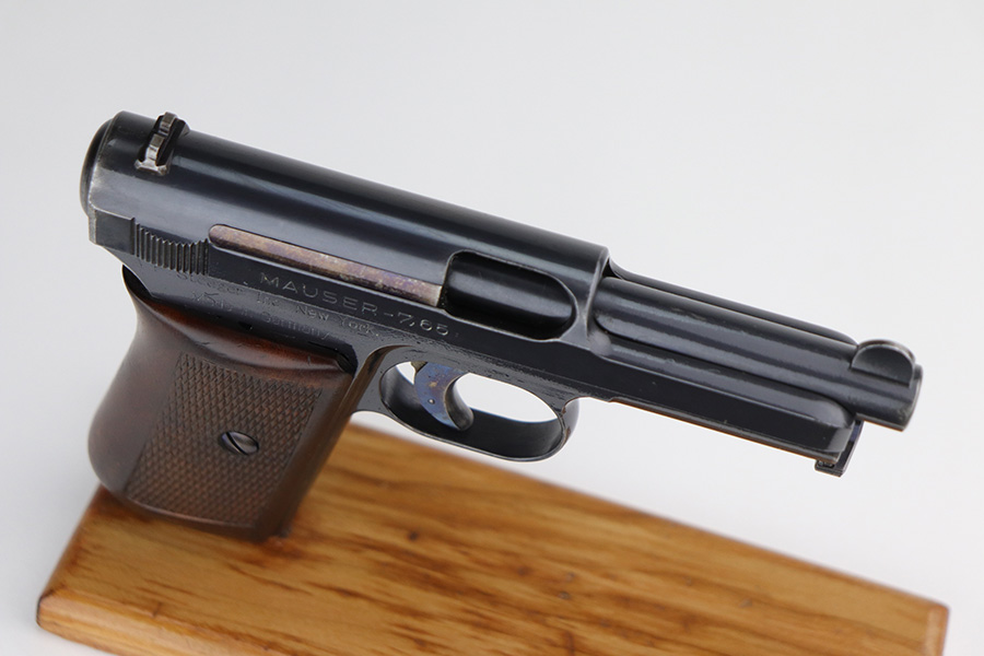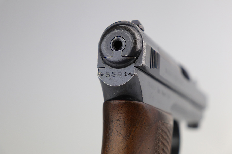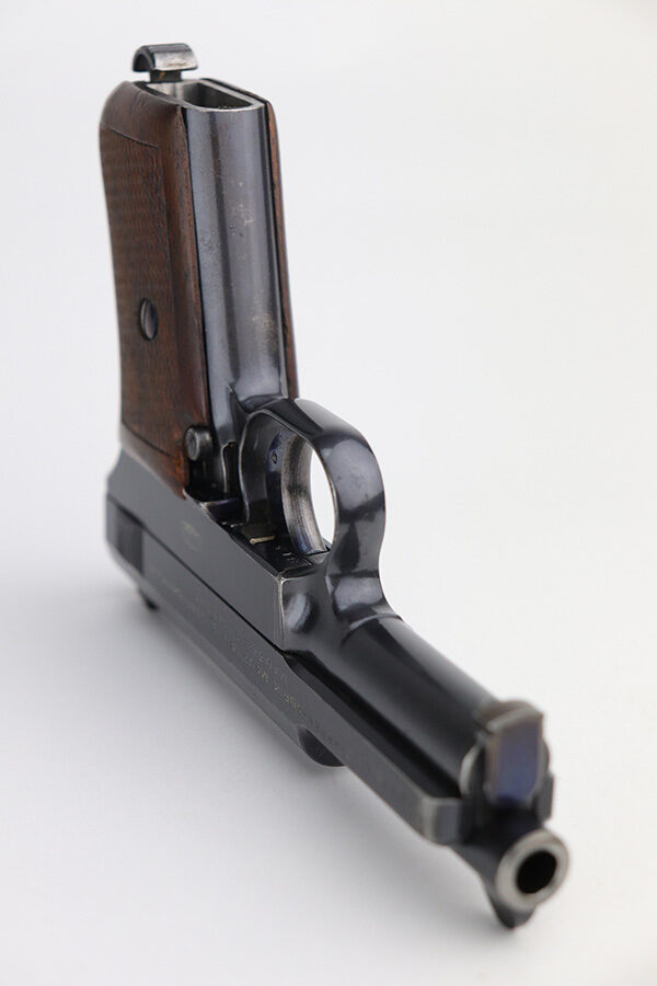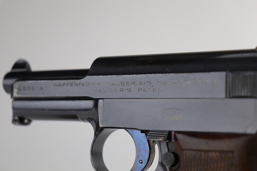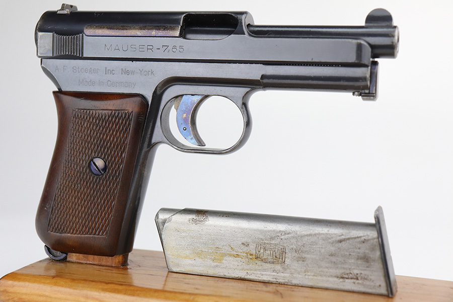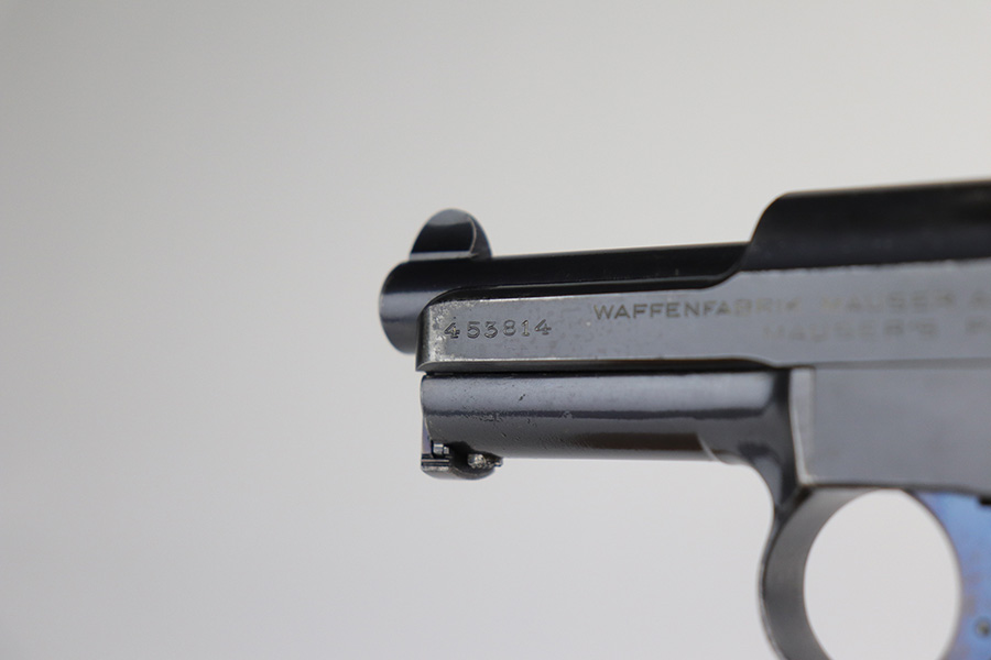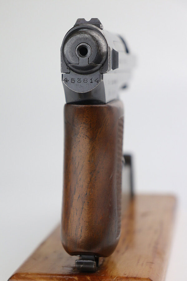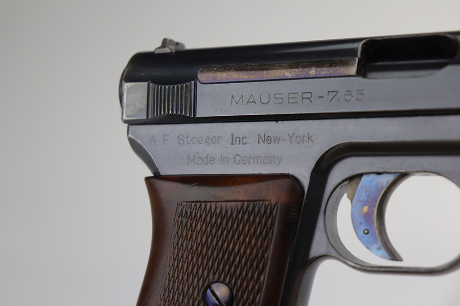 4/7/22 – This is a very nice example of a rare Mauser Model 1914 sold in the commercial market in the 1920’s. It is all matching and has the proper “Crown U” proofs. This one is unique because it has an “AF Stoeger Inc New-York” private retailer marking, indicating this gun was sent from Germany to AF Stoeger for resale in the US commercial market. It has retained about 93% of its finish. There is spotty wear on the front strap, hints of wear on the high edges of the slide, and minor wear around the muzzle. An area of discoloration on the top of the slide. There are areas of spotty oxidation on the front strap, on the left side of the slide, and around the muzzle. Comes with nice wood grip and a period-correct magazine. The bore is mint.