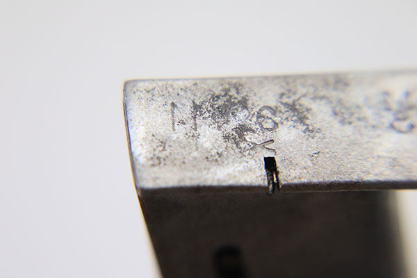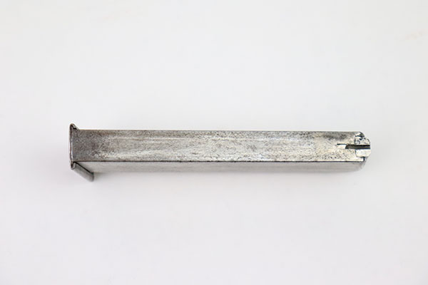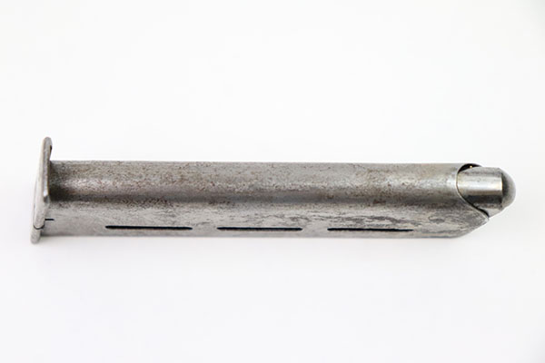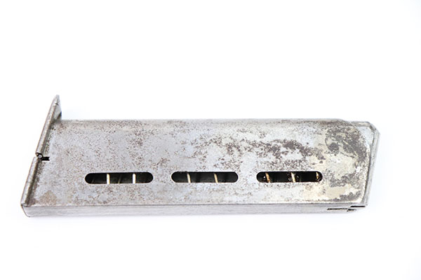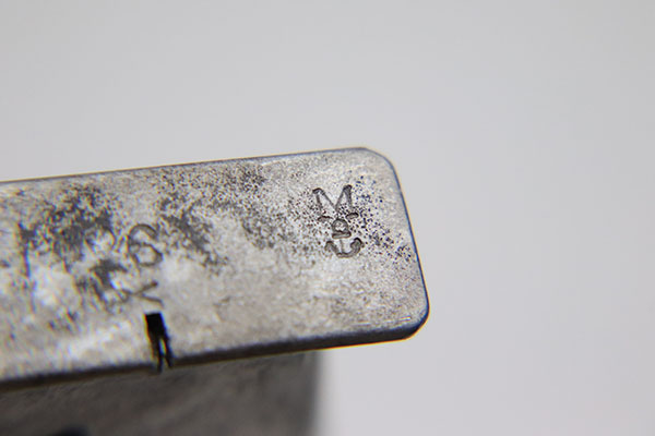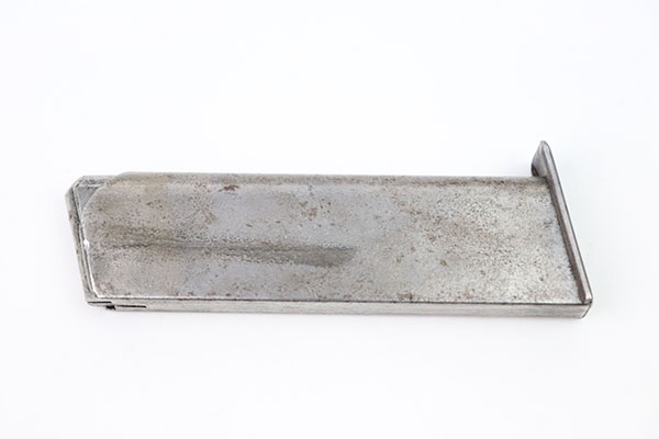 10/3/22 – Here’s a magazine that would be really hard to find, so if you need one you’d better grab it! It is has no finish and a bit of corrosion, but is correct for a Mauser M1914 Navy-issued pistol. 7.65mm. The bottom marking is worn but bares the “N.” Navy Property mark for the Nordsee Navy Base in Wilhelmshaven. It is hard to read the number, but it does have the “lazy X” for extra magazine and a clear WW1-era Navy “Anchor over M” marking. Have you ever seen another?