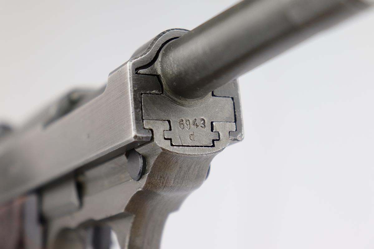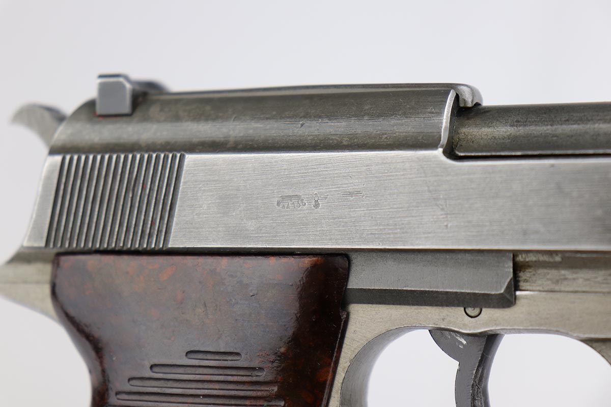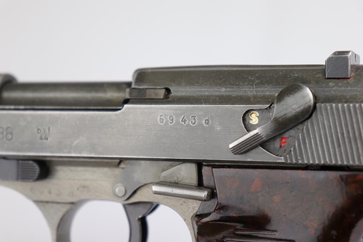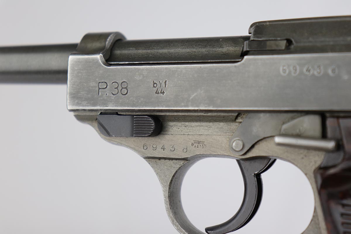 5/3/19 – This is an excellent example of a rare Mauser P.38 with all phosphate finish on slide, barrel and frame. Only a tiny fraction of Mauser P.38s have such features. Made near the end of 1944. This one is all matching and original with 96-97% finish remaining, showing minor finish loss at the edges. Only blued parts are the trigger and takedown lever. Mint bore and similarly excellent grips.