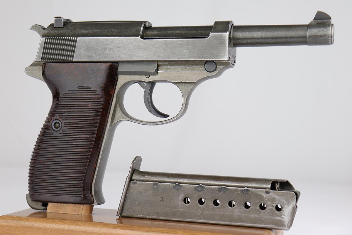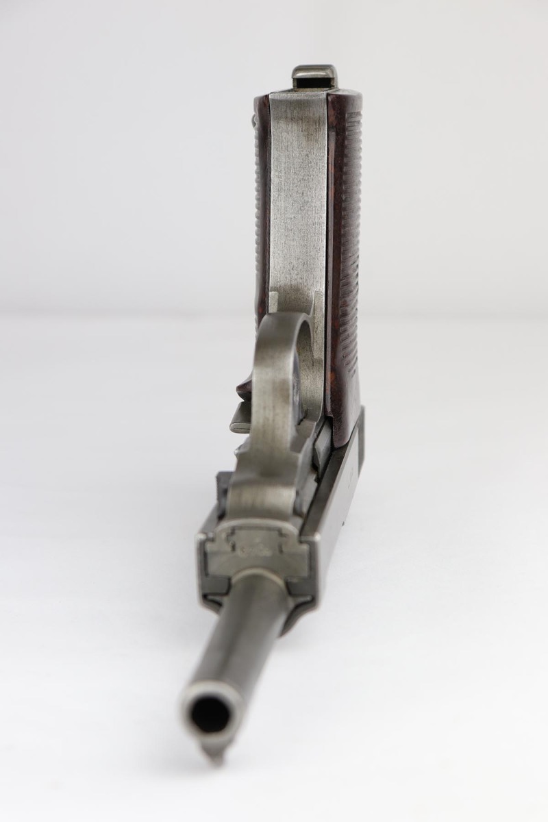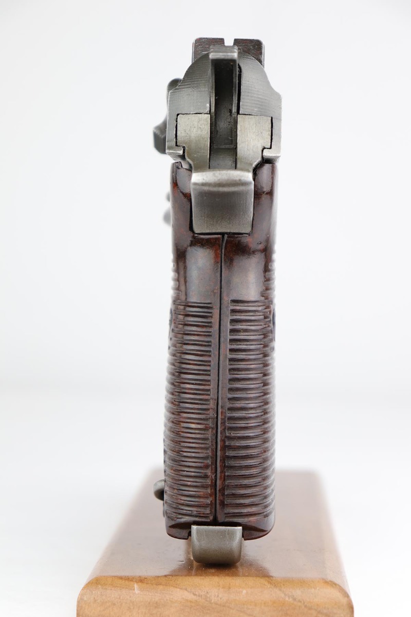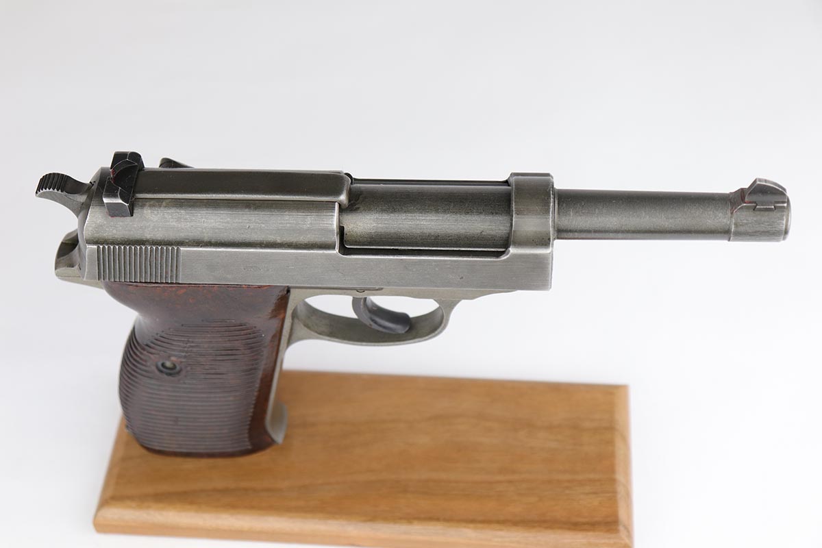 5/3/19 – This is an excellent example of a rare Mauser P.38 with all phosphate finish on slide, barrel and frame. Only a tiny fraction of Mauser P.38s have such features. Made near the end of 1944. This one is all matching and original with 96-97% finish remaining, showing minor finish loss at the edges. Only blued parts are the trigger and takedown lever. Mint bore and similarly excellent grips.