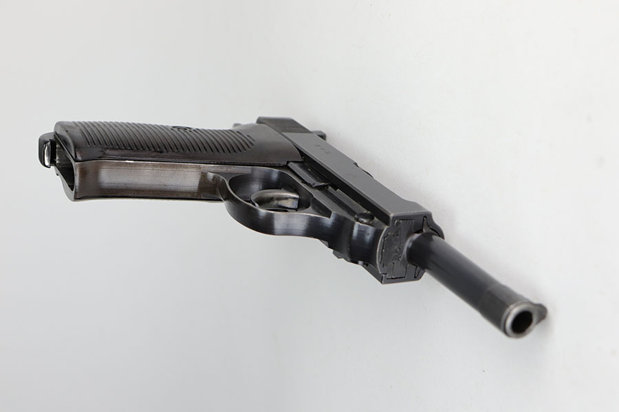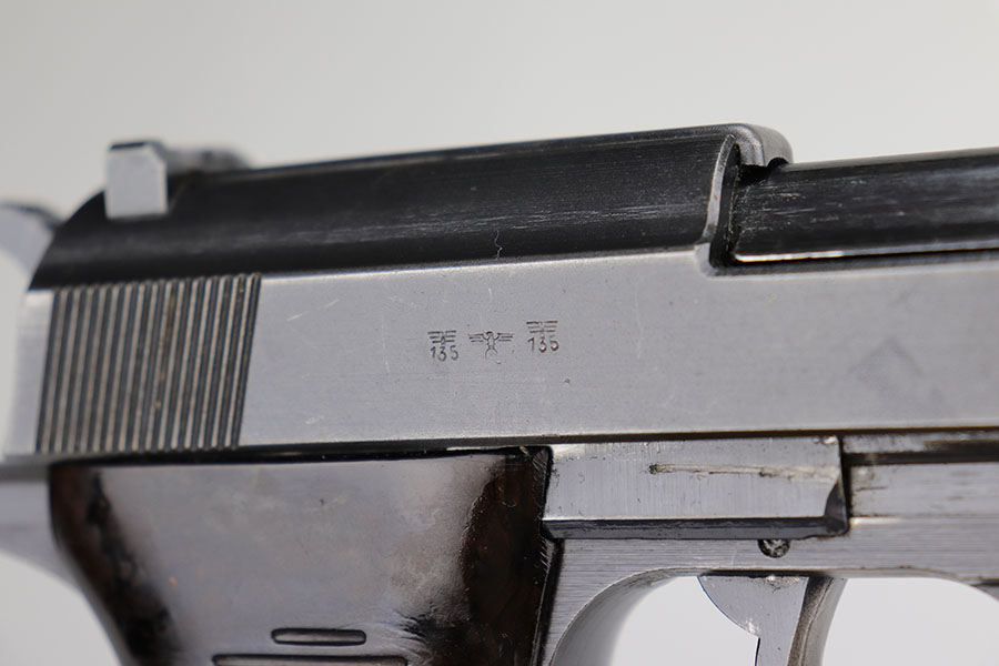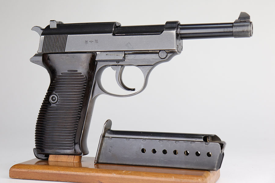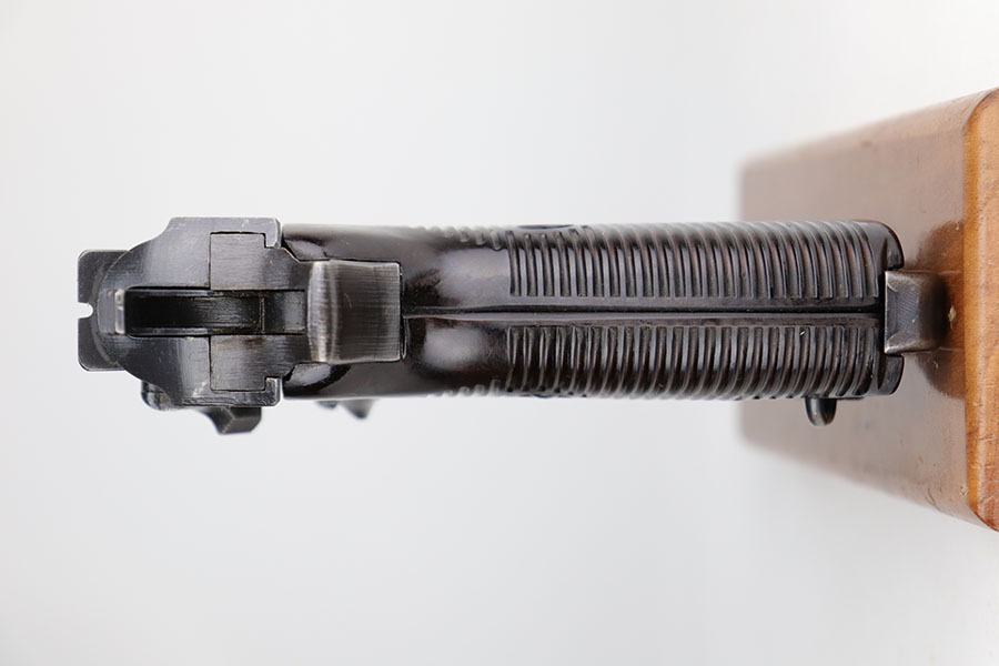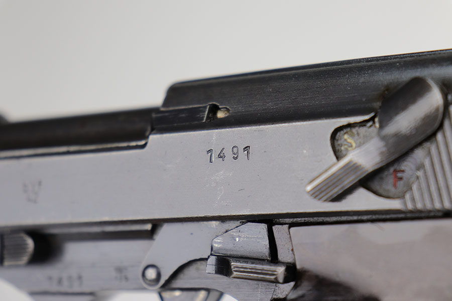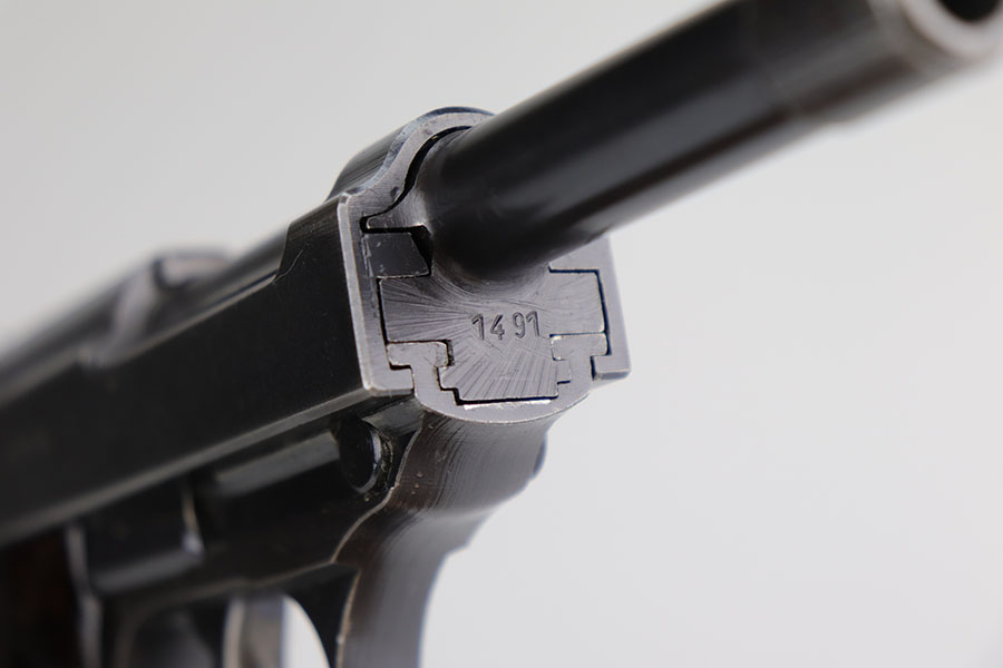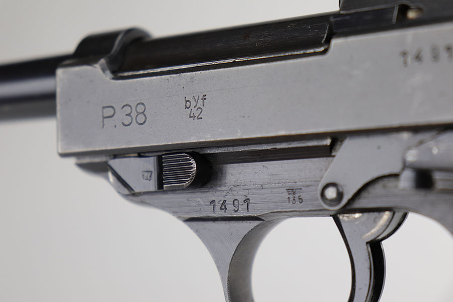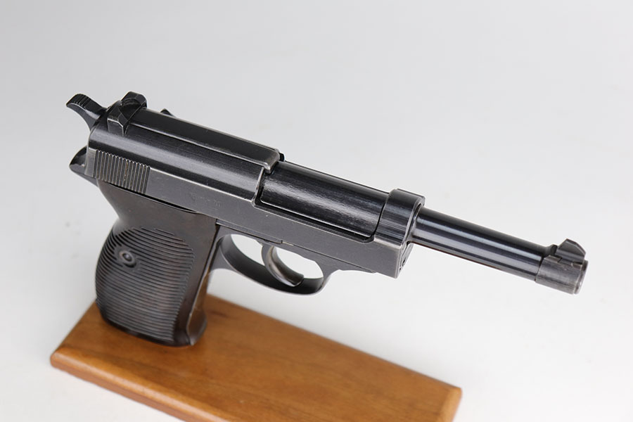 12/8/20 – This is a nice example of a rare Mauser P.38, made in 1942, the first year of production. There were fewer than 20,000 of this variation produced, which is a very low production total for any wartime P.38 variation. This particular gun is all matching with 93-94% of the original, dust blue finish remaining. Excellent profile with minor muzzle wear, but most of the thinning/patina is on the front strap. Excellent bore and good mechanics, though de-cocker is a little tight. Excellent brown grips. Mauser magazine.