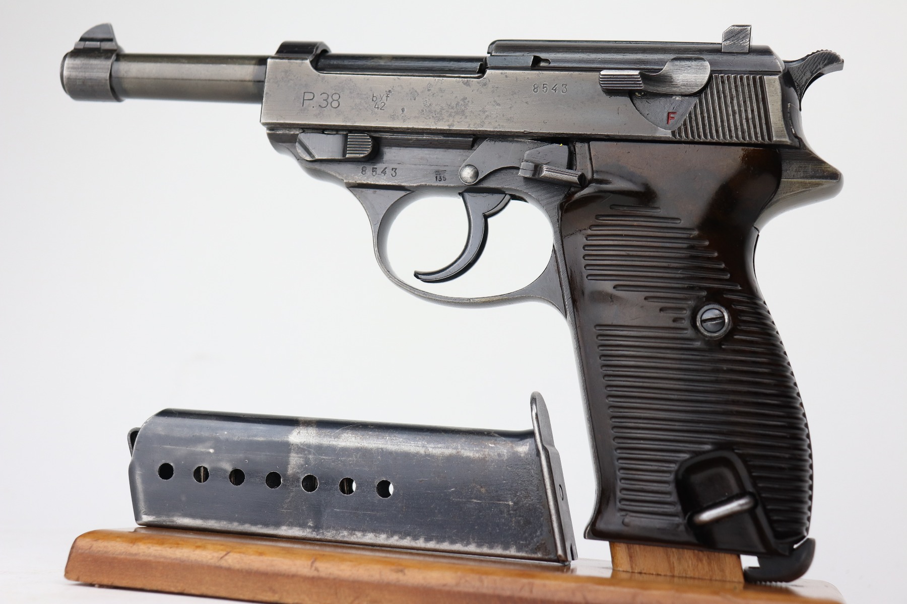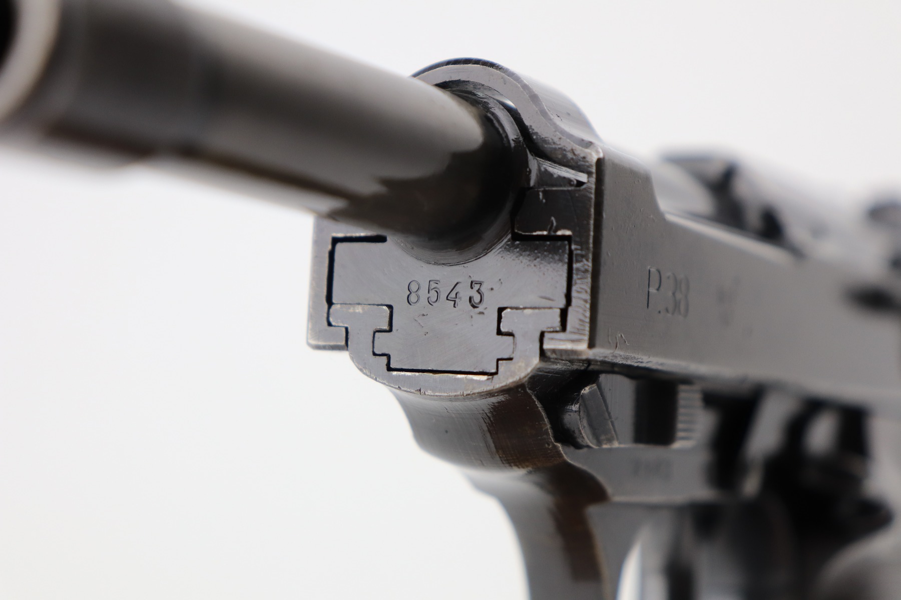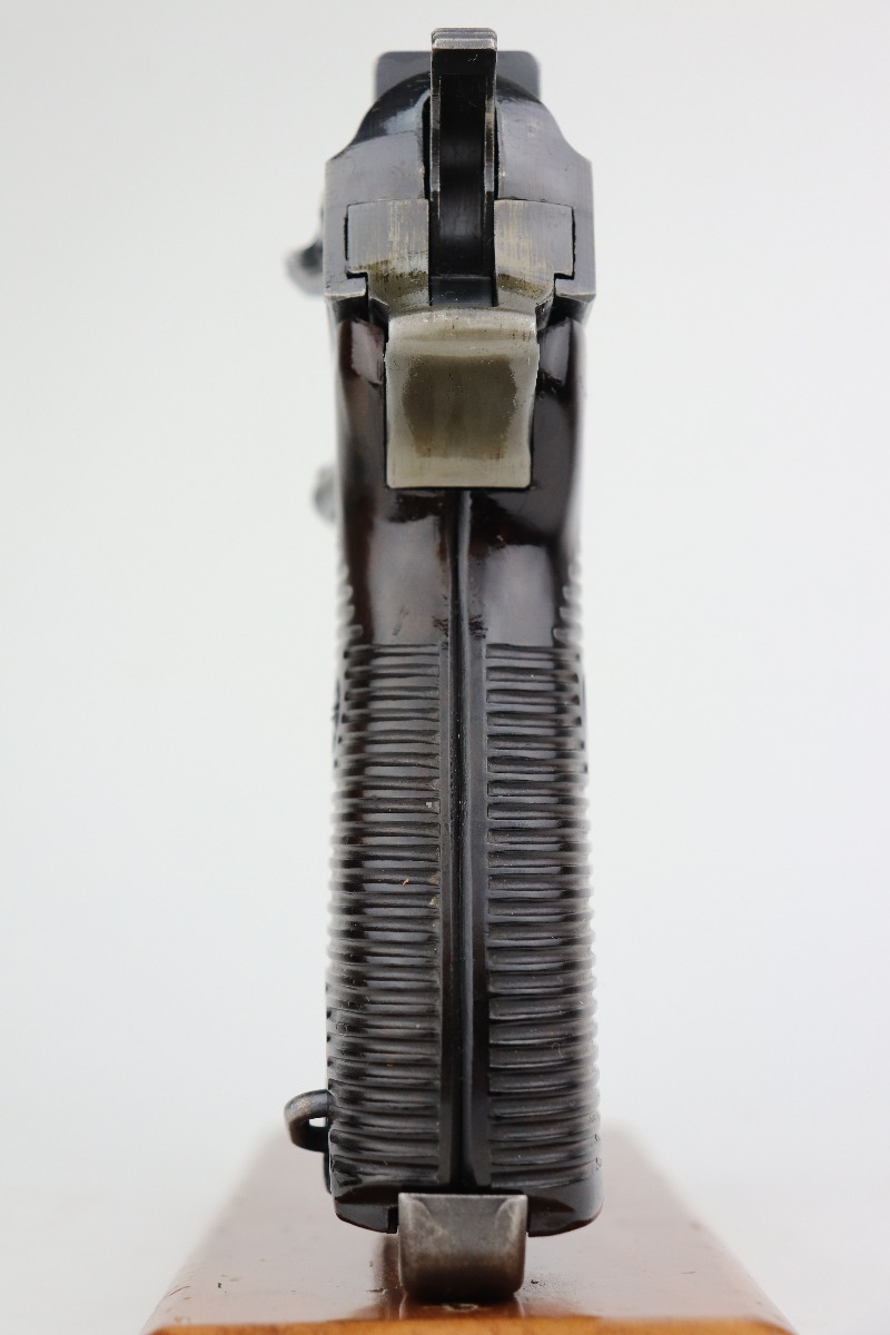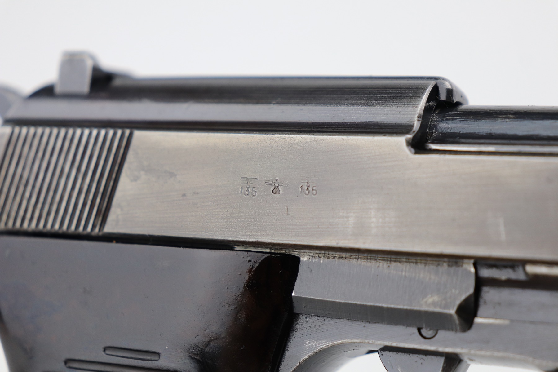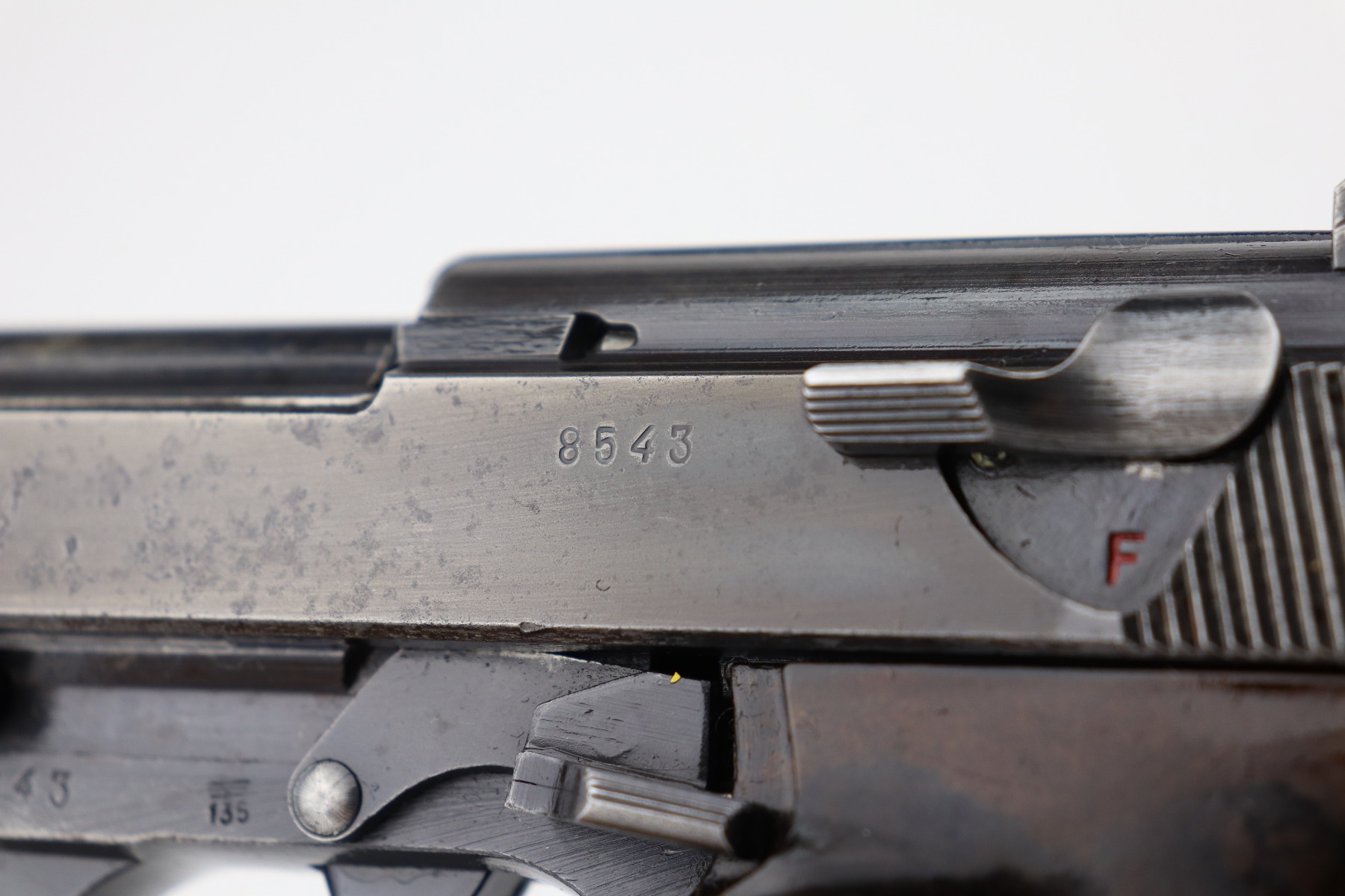 3/30/21 – This is a rare Mauser P.38 issued to the Nazi military in 1942. It is a first-year Mauser production, where only 19,000 of these wer made, making it only slightly more common than the zero series or Nazi-marked svw 45’s. It is all matching and has the proper “Eagle 135” military proofs. It has retained roughly 65% of its original finish. There is thinning in the finish throughout, most noticeable on the front strap, barrel, and left side and top of the slide. There is spotty oxidation and minor pitting on the left side of the slide. Comes with excellent grips and a correct magazine. The bore is shiny with strong rifling with minor freckling throughout. The de-cocker is functional but a little tough to push down.