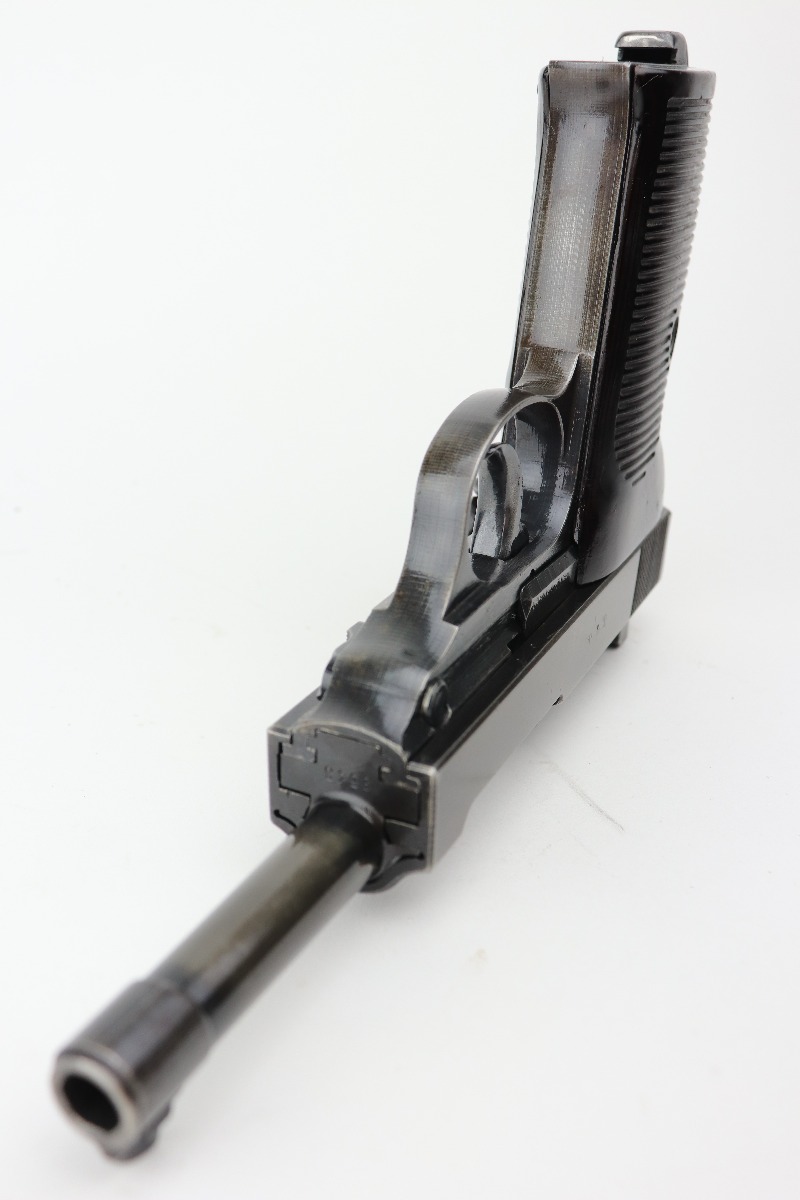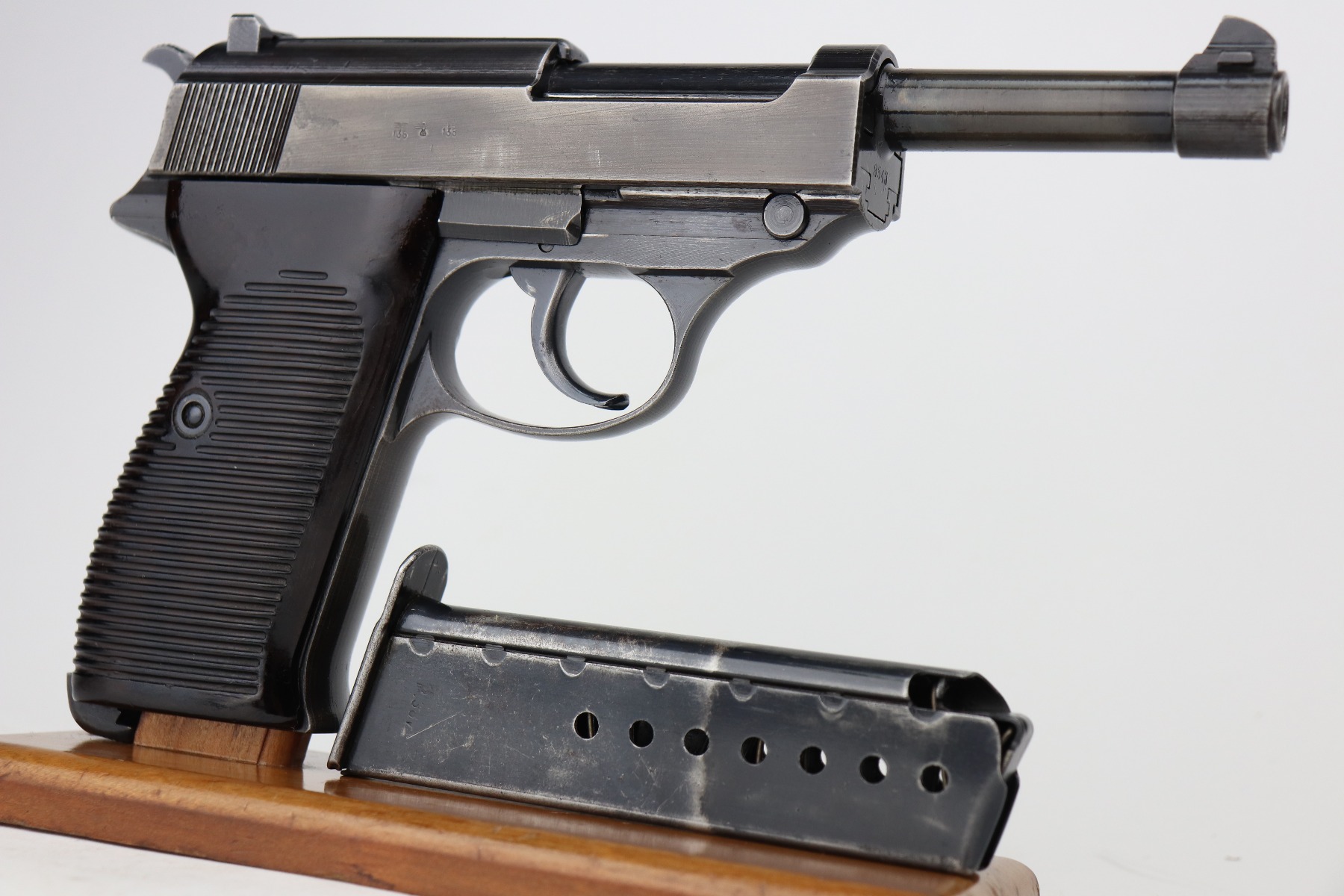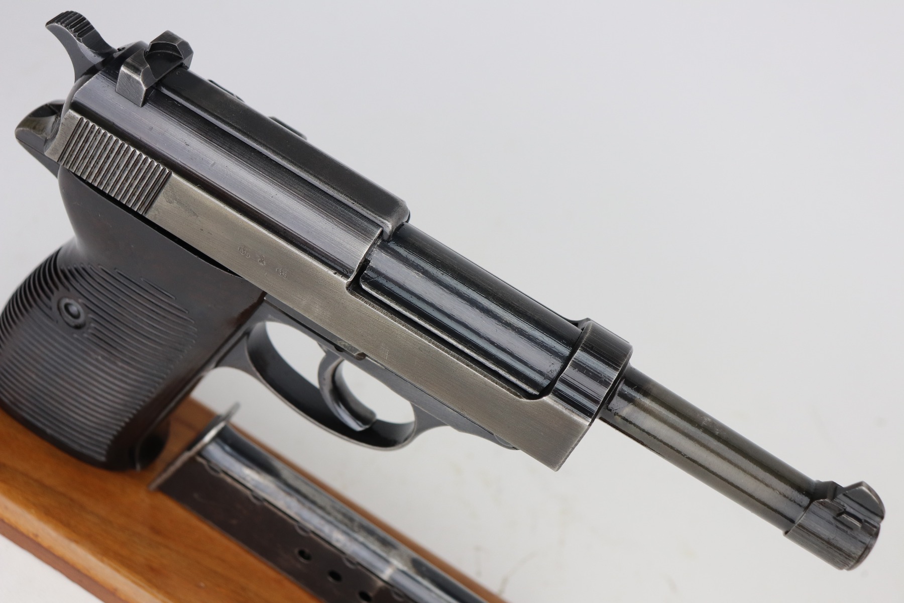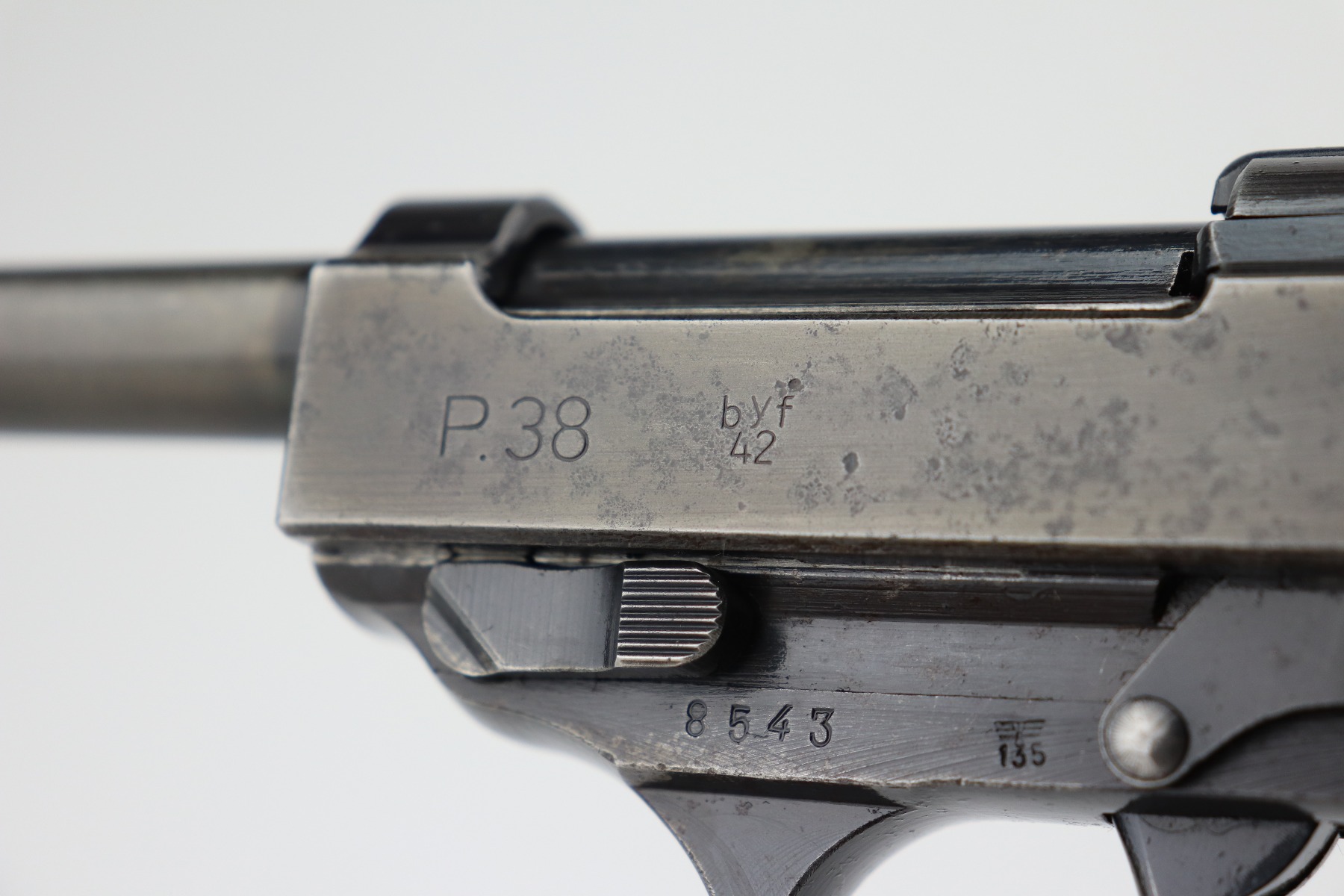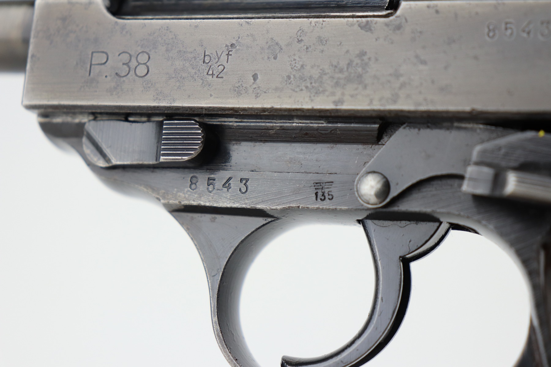 3/30/21 – This is a rare Mauser P.38 issued to the Nazi military in 1942. It is a first-year Mauser production, where only 19,000 of these wer made, making it only slightly more common than the zero series or Nazi-marked svw 45’s. It is all matching and has the proper “Eagle 135” military proofs. It has retained roughly 65% of its original finish. There is thinning in the finish throughout, most noticeable on the front strap, barrel, and left side and top of the slide. There is spotty oxidation and minor pitting on the left side of the slide. Comes with excellent grips and a correct magazine. The bore is shiny with strong rifling with minor freckling throughout. The de-cocker is functional but a little tough to push down.