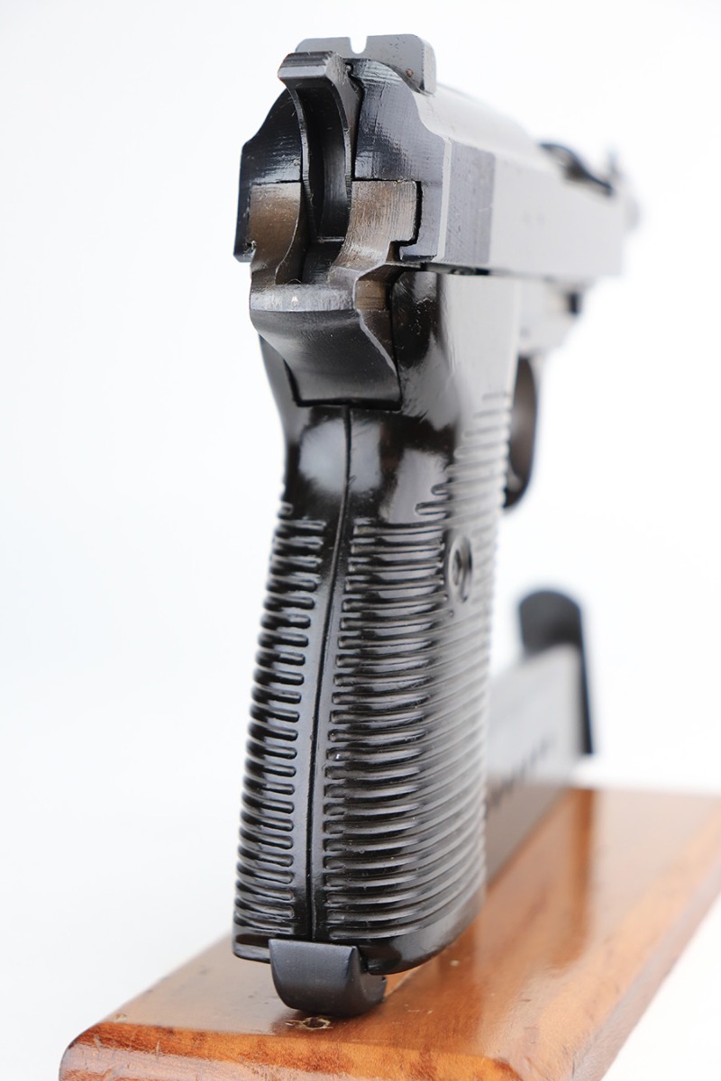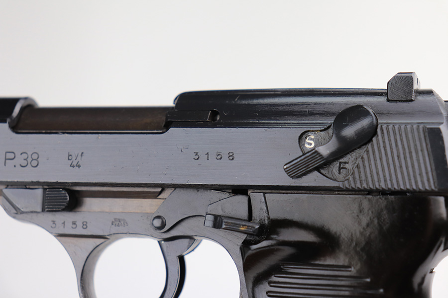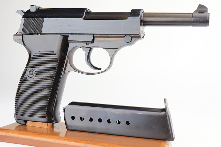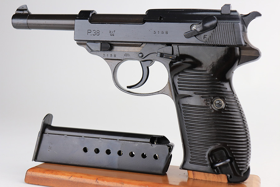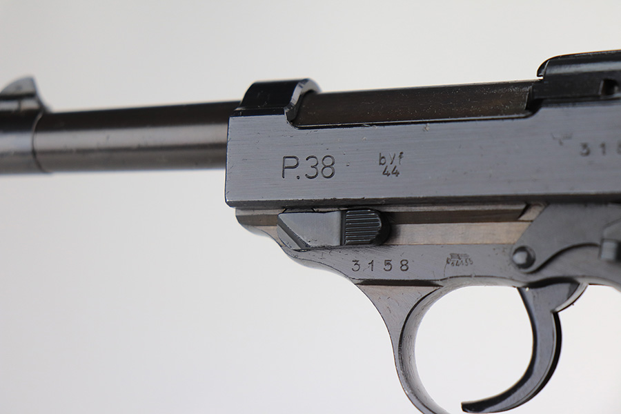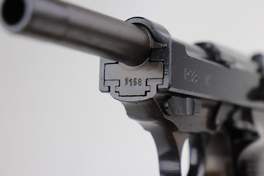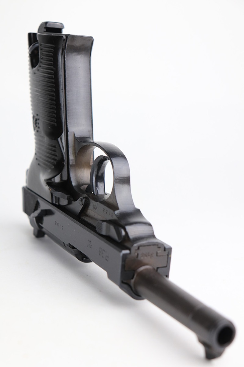 2/21/22 – This is a beautiful, rare Mauser P.38 that was sent to the German Police in 1944. There were only 4,600 of this variation produced, and 3,200 of that in 1944. This particular example appears mint with a mint bore but is likely an arsenal refinish as the trigger spring is blued. It’s not a Russian capture gun though, and has a mint bore. Excellent grips and a Mauser mag. Good mechanics, including de-cocker.