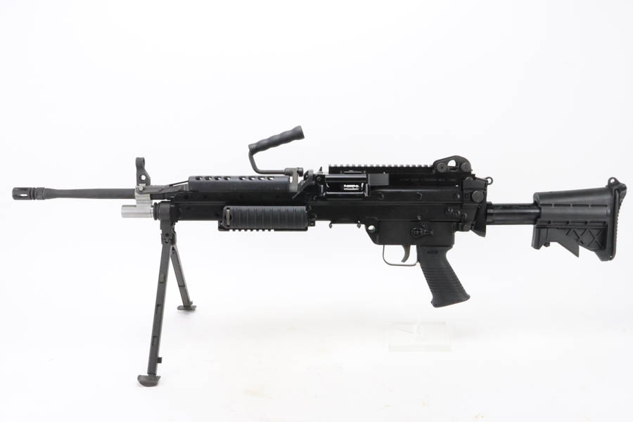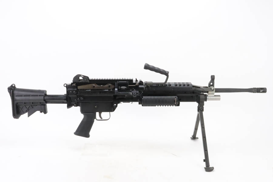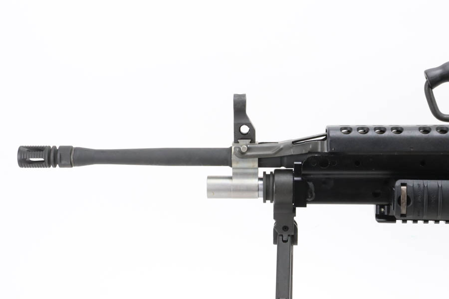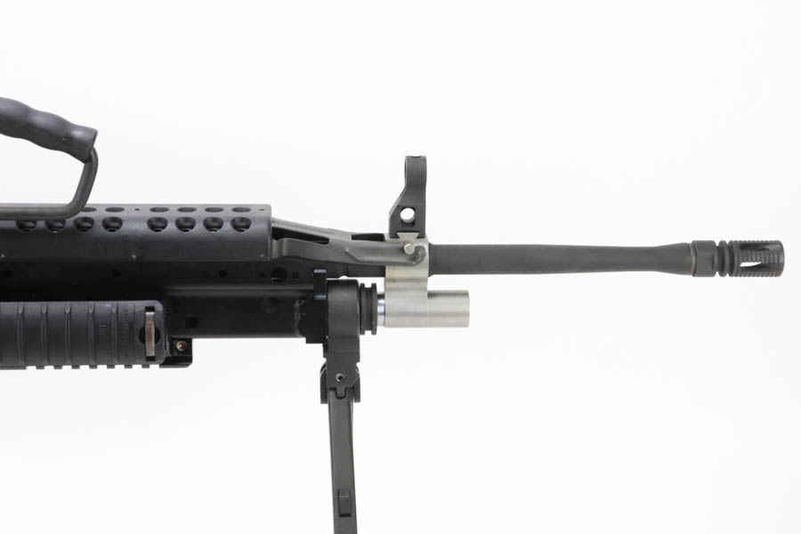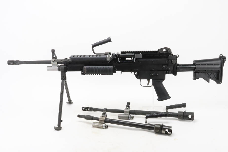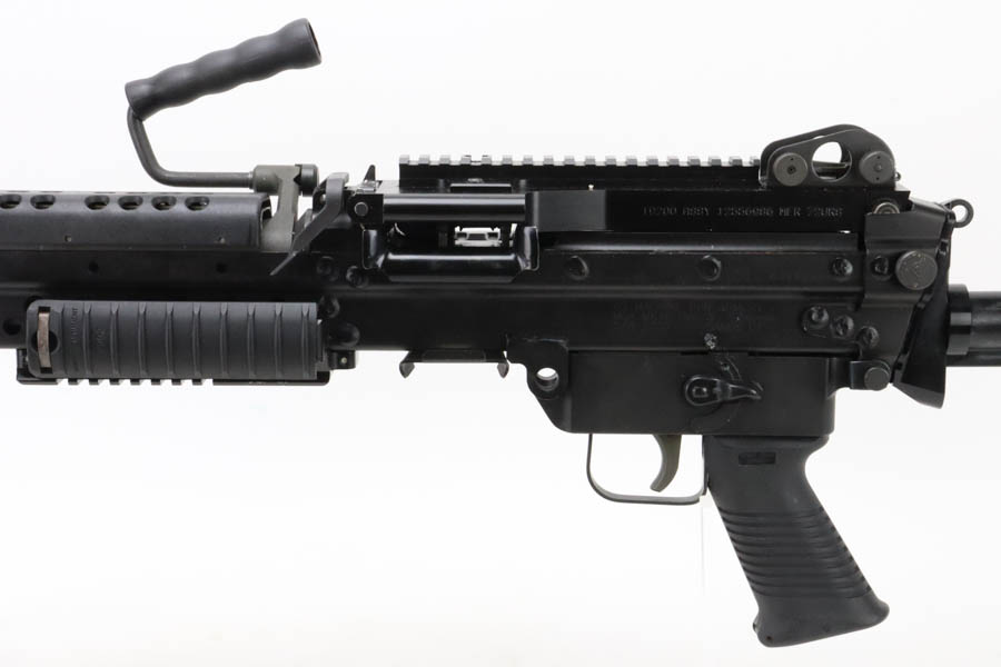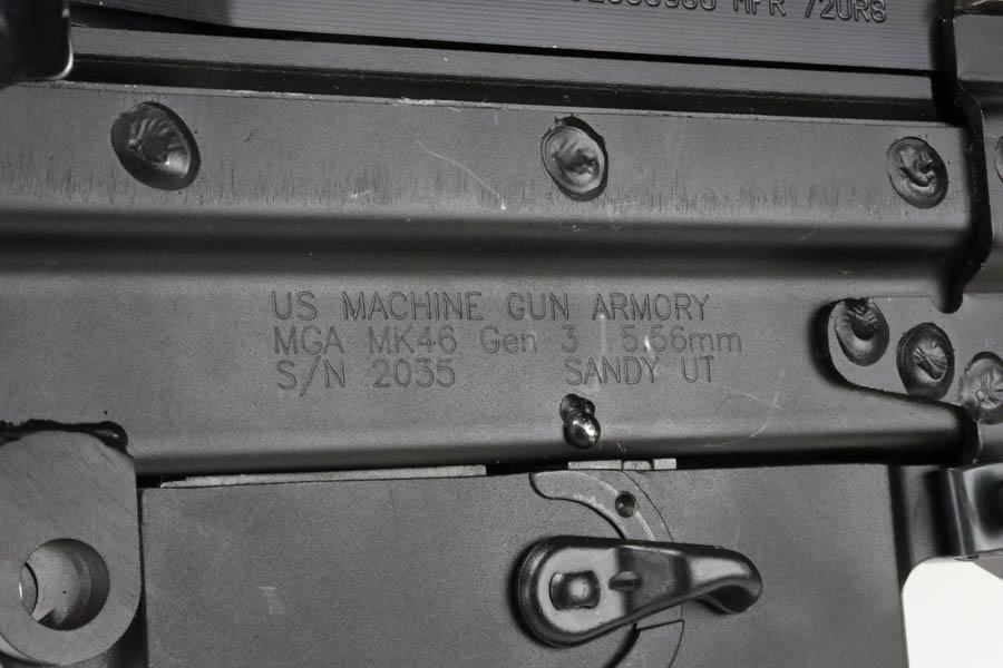 10/25/2024 – For sale is a Mk.46 Semi Auto rifle made by Machine Gun Armory. The Mk.46 is a lightweight variant used by USSOCOM of the M249 SAW. This example is in excellent condition overall with a nice deep finish throughout the metal. The receiver on the left side is stamped “US Machine Gun Armory” and the model name and serial. The top cover has “19200 ASSY 12556986 MFR 72URS” on the left side. The rifle has been converted to semi auto and the bolt does not hold open and has a very stiff spring. The bore is very bright with great rifling. The spare barrels are also in great condition with great bores and sharp rifling. The one barrel comes with an aftermarket brake. Comes with the armorer’s kit, which has some spares for small parts that may break or deteriorate over time. Also includes the disintegrating links for use with this rifle.
