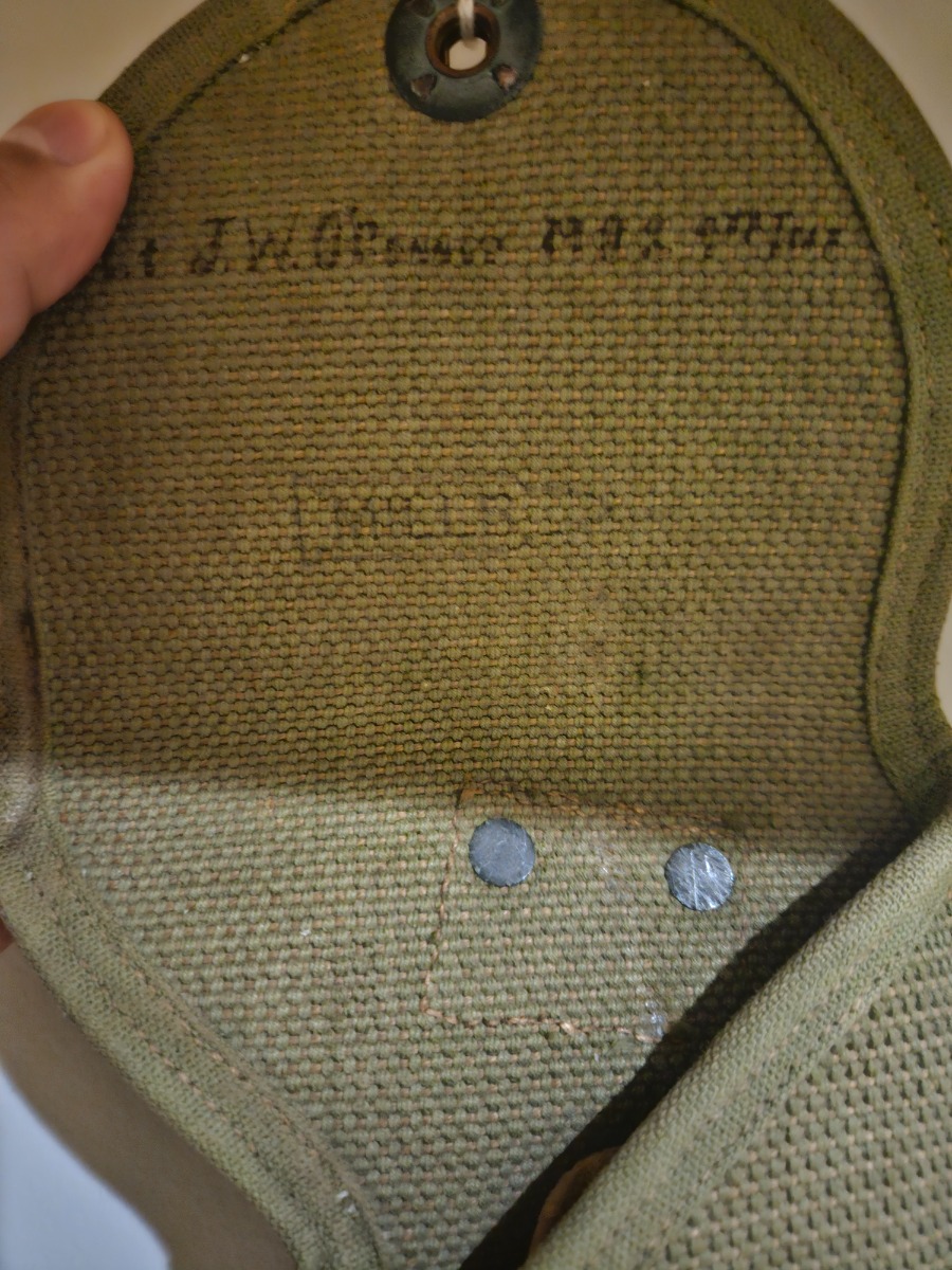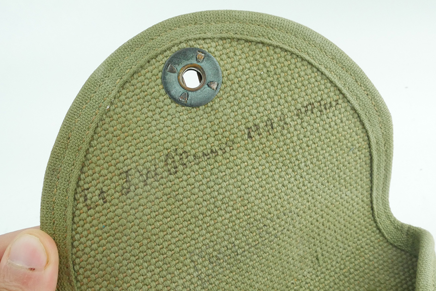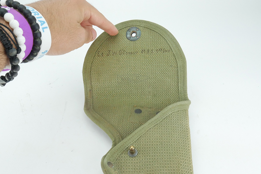 7/24/24 – This is a rare Mills canvas model 1911 Holster, patented in 1914 and manufactured by the Mills Equipment Company. These are made of durable canvas with a riveted blued brass cap on the toe which is marked with the Mills bullet logo over “PATENTED JUN. 16; 14,. / JUN. 30; 14. SEPT. 15; 14.” The holsters were never adopted by the United States, and were only available via private purchase in the U.S, though they were adopted by the Canadian military. Reportedly Mills and Audley holsters were purchased privately by USMC officers. Fitted with a brass hanger secured by two rivets and brass flap snap and the edges have a double stitched overlay with two reinforcement rivets below the snap peg. This example is in excellent overall condition, correctly marked with the Mills bullet logo over “1914” on the inside flap, though this marking is very faded. There is additional writing on the inside of the flap. which looks to be the name of a lieutenant but is difficult to fully make out. The brass hanger has visibly lightened with age, and has some surface scratching, but markings are crisp and distinctive. Stitching is excellent throughout