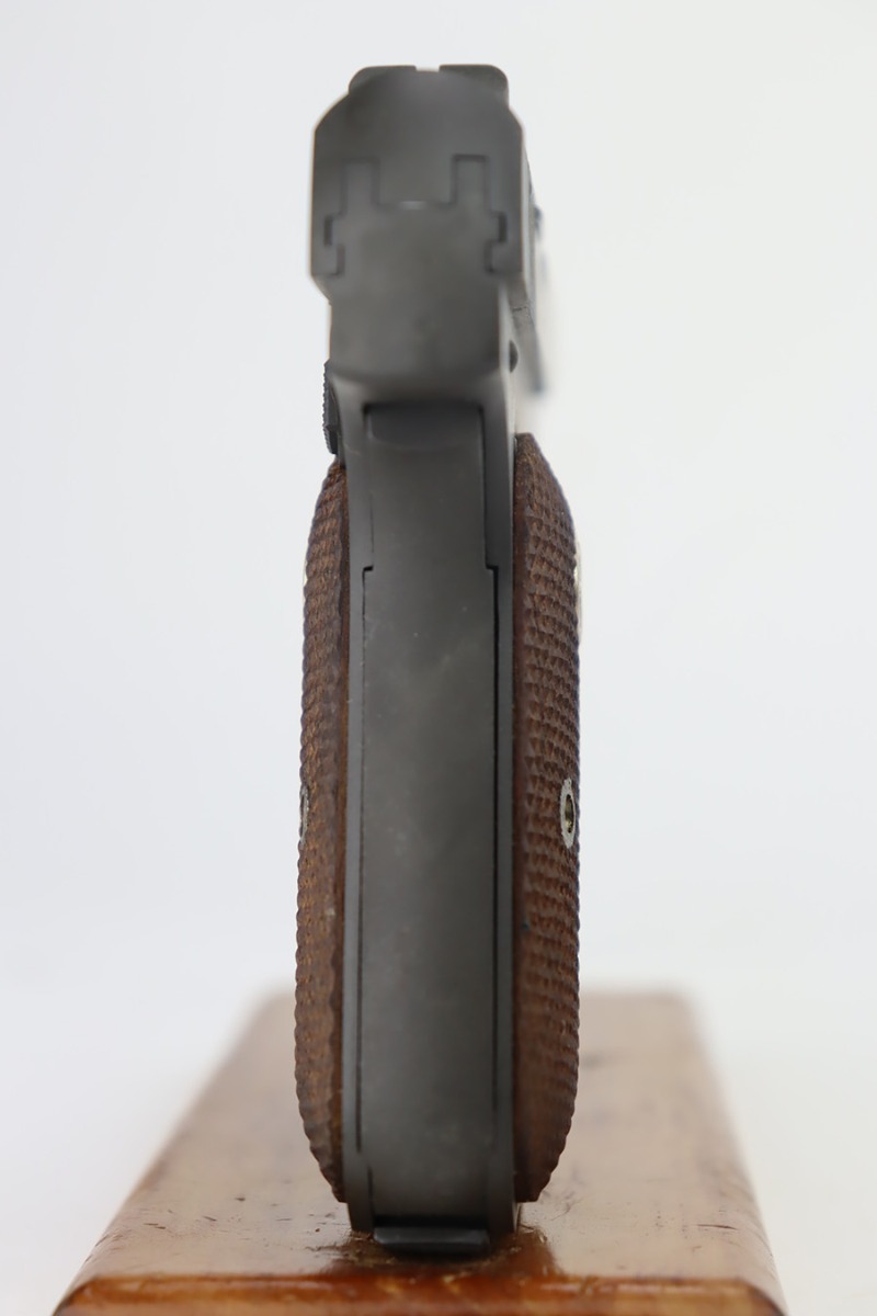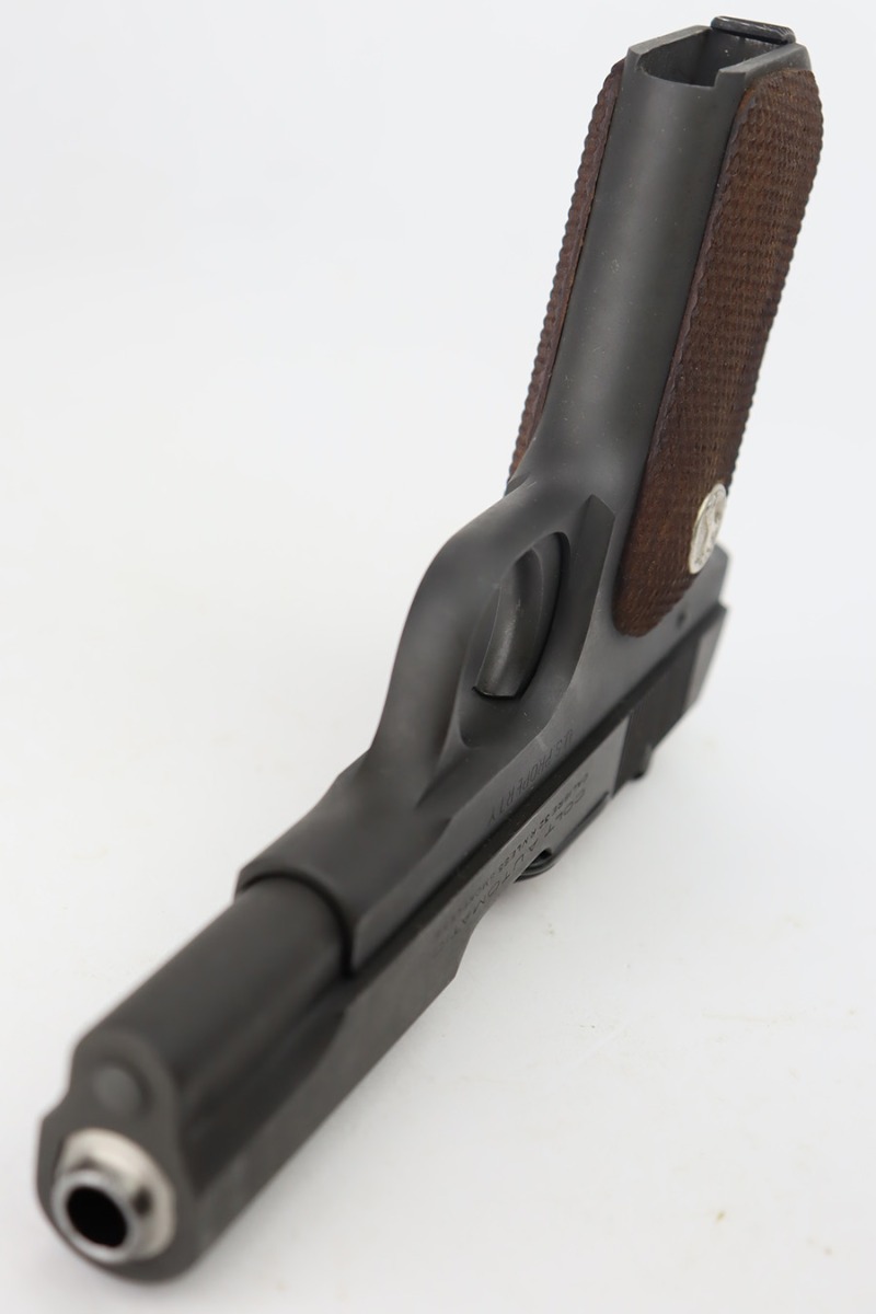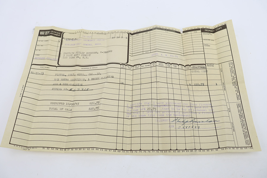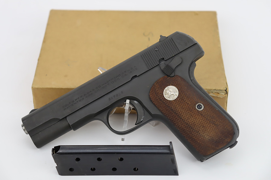 9/26/23 – This is a mint example of a rare Colt Model 1903 that was made in 1944 and issued to the U.S. military. It was shipped in1944 to Springfield Armory, one of only ~7,000 such examples. The pistol has no wear and minty bore/grips. Comes with a total of three mags, all marked ‘CAL .32 COLT’ on the base. Box is hand numbered to match the pistol on the bottom.