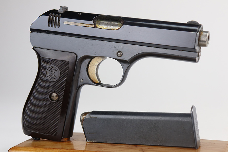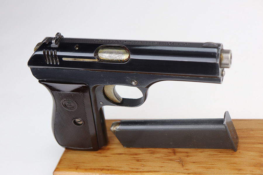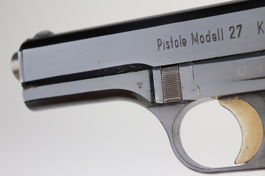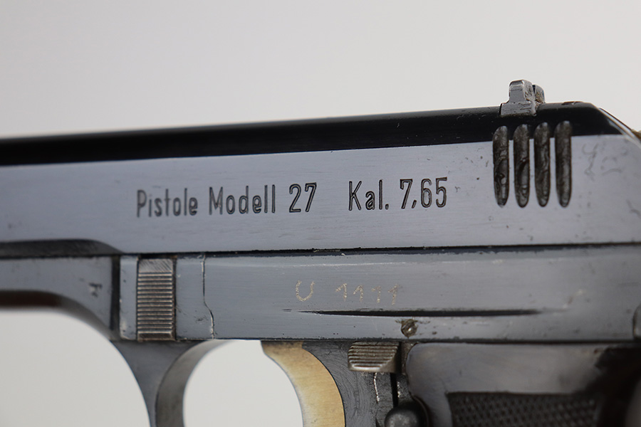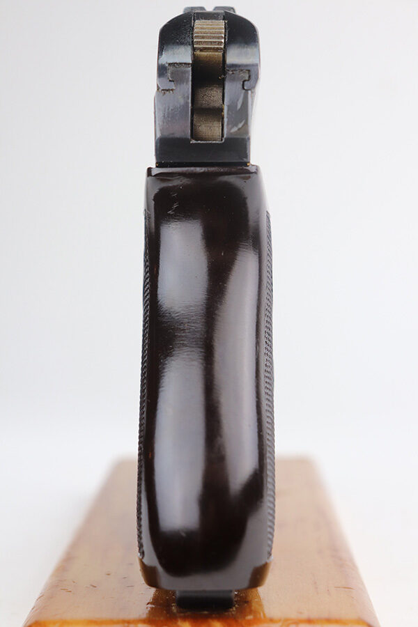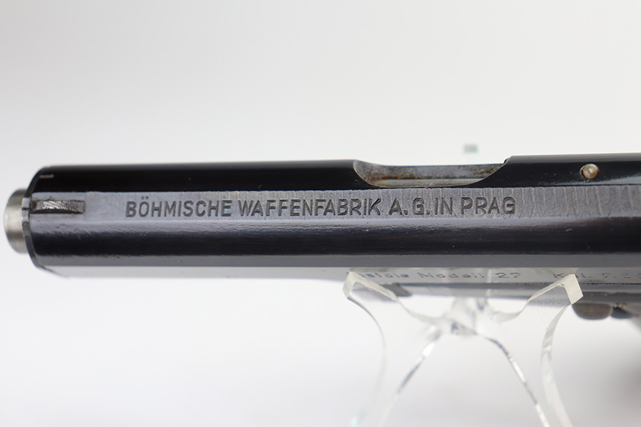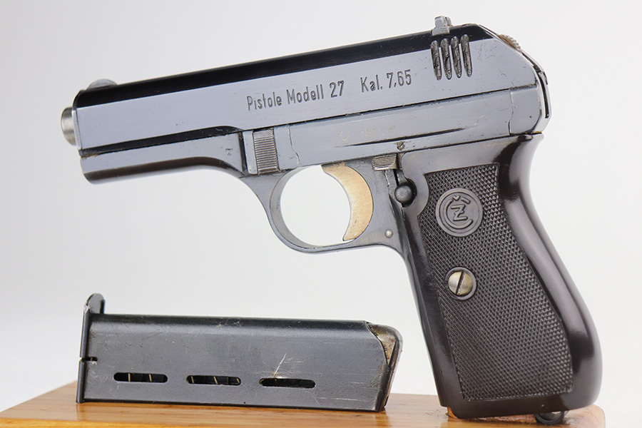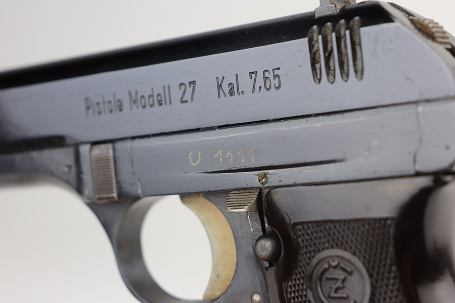 6/8/21 – This is a mint example of a rare WW2 CZ Model 27. This one has a high polish finish, a “Bohmische” slide, an “Eagle 4” test proof, and an electro-penciled serial number on the left side of the slide that starts with “U”. According to Jan Still’s Axis pistols, there were only a few of these guns made and were most likely pre-military production test pistols. This one has retained about 99% of its original high polish finish with just a hint of wear around the muzzle and a few very light scratches on the underside of the frame. Comes with an excellent grip – no chips or cracks. Also comes with a period-correct magazine. Mint bore.