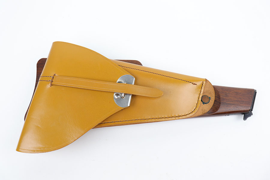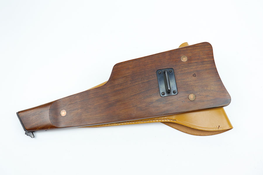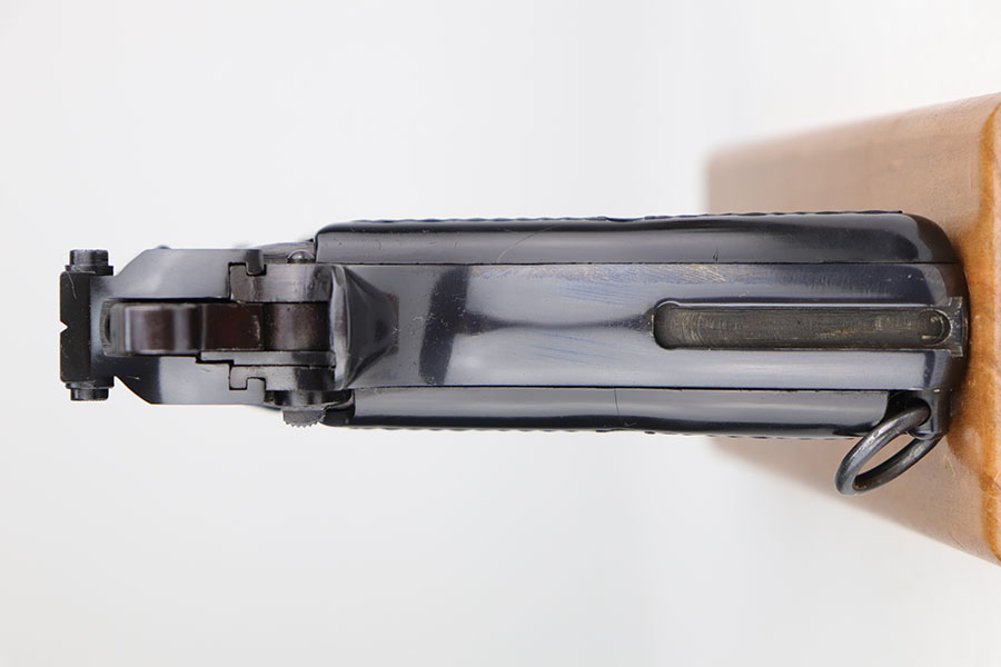 11/3/20 – This is an original and complete example of a rare FN Browning Hi Power in mint condition. The pistol features the Omani crest on the slide, with only 36 such examples produced. The first 9 were roll marked with the incorrect crest, and this represents one of the latter group of 27 with correct crest. A photo from Vanderlinden’s book on FN Pistols (page 348 of the second edition of his book) is included in the listing with full explanation of the history of these pistols. The gun itself is in mint condition with a minty bore, black plastic grips and lanyard ring installed. It features a tangent rear sight, and a stock slot in the frame. The listing also includes a holster/stock combo, though these may have been added later and not part of the original production.