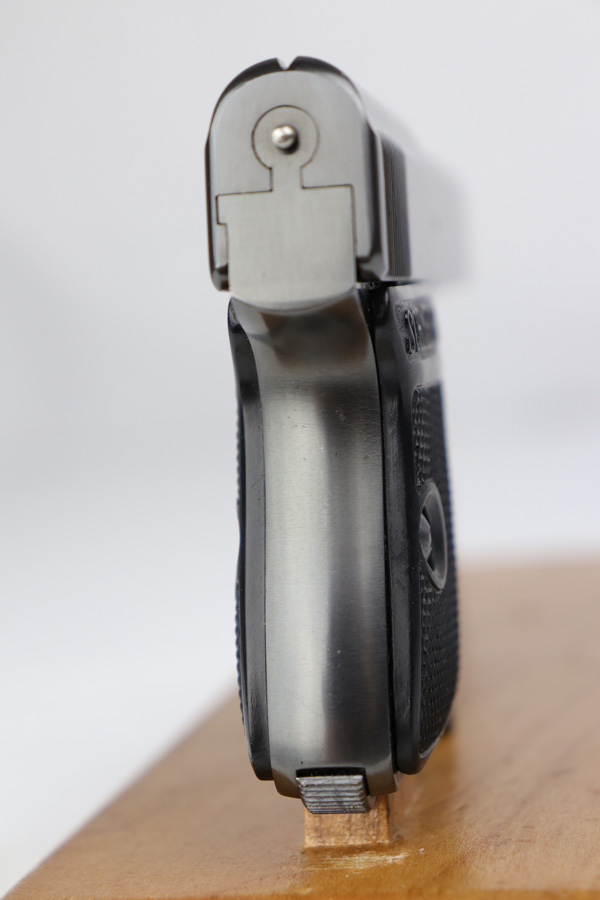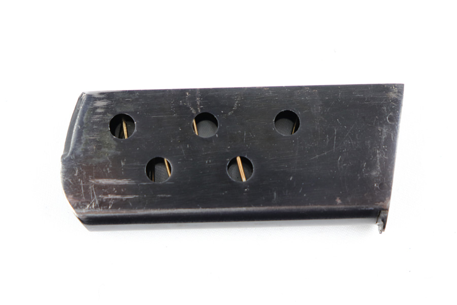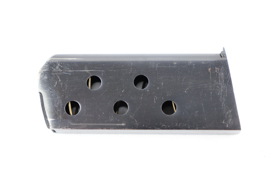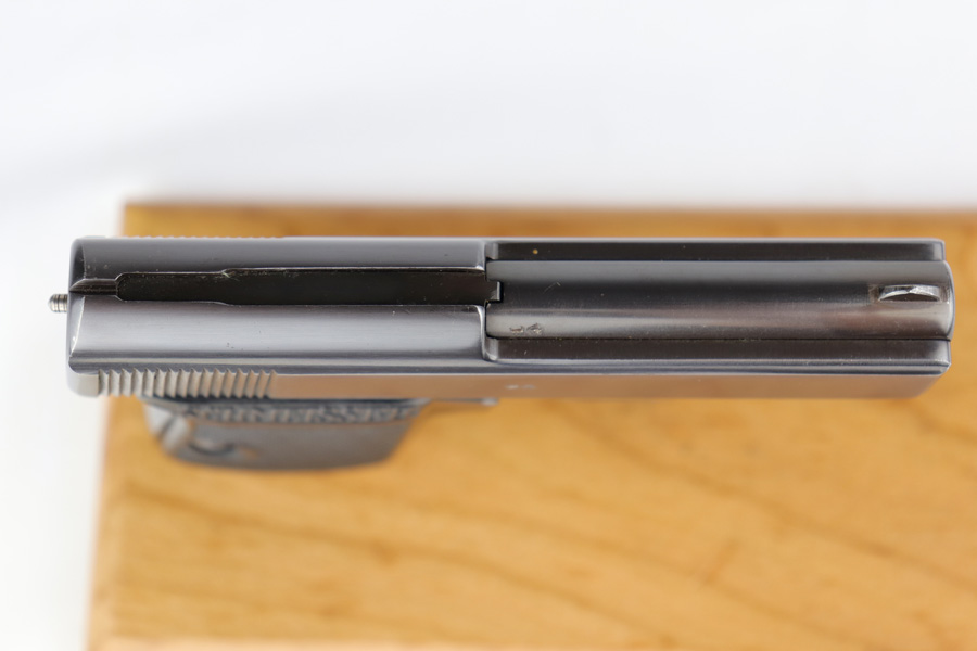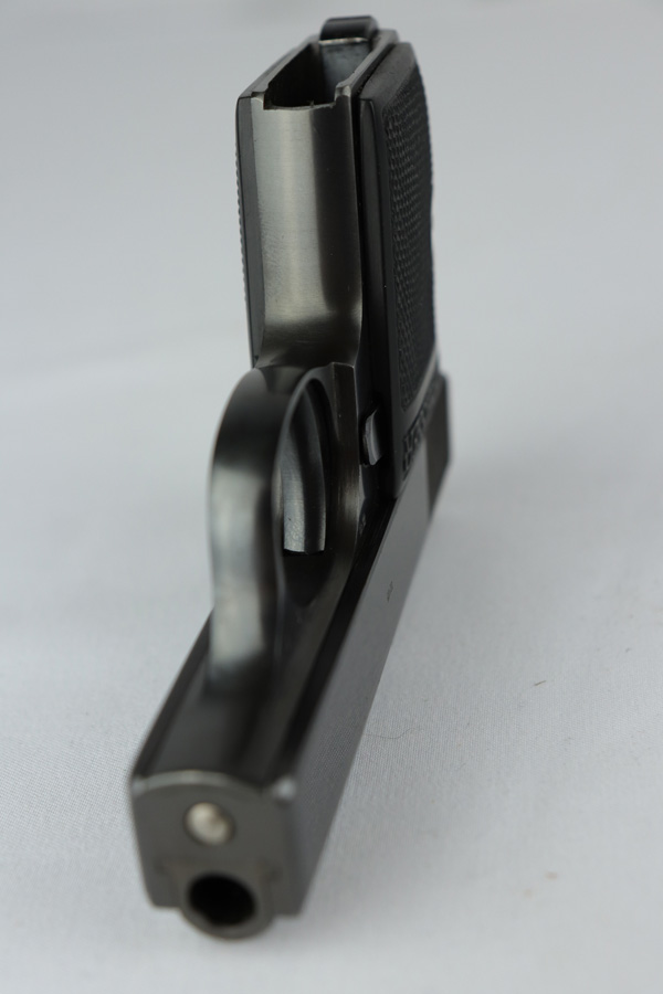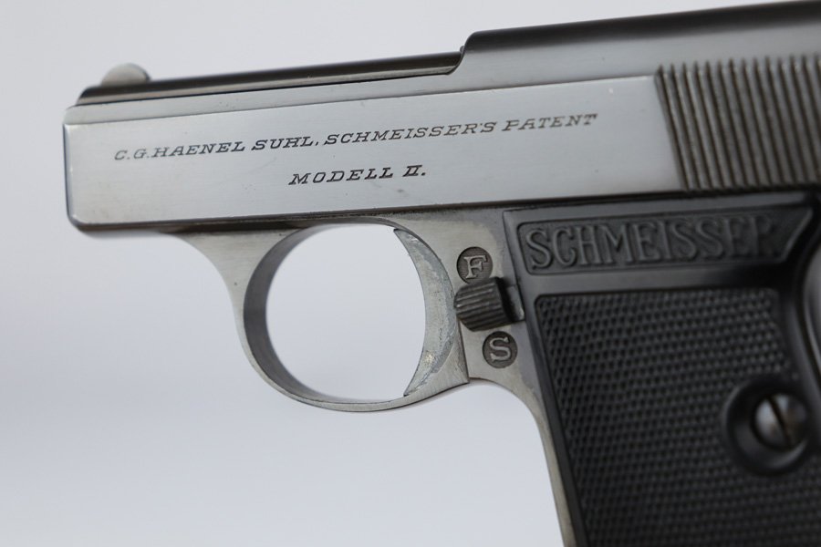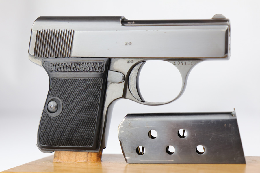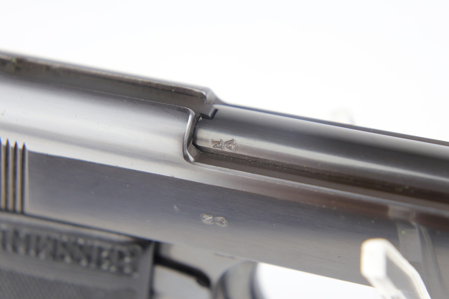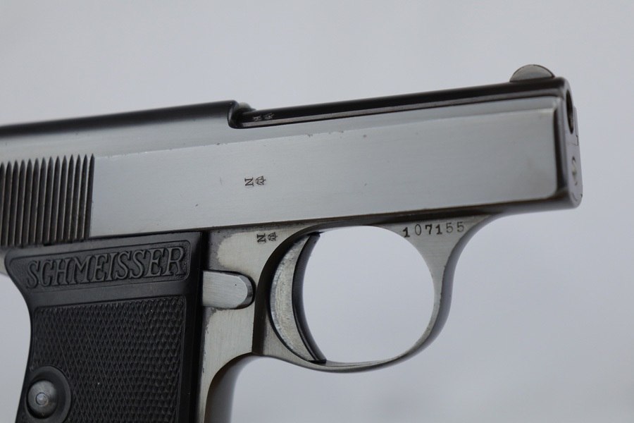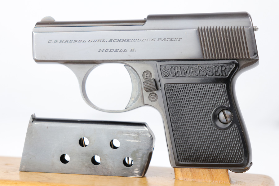 11/1/18 – One of the rarely encountered German pre-war pocket pistols, the Haenel Model 2, was made in the thirties in very limited numbers. Under 10,000 guns were produced, compared to over 100,000 Model 1s made. Very few of these made it out of Germany as .25 caliber pistols were more likely to be squirreled away in basements and cellars by the Germans after WWII, as they were small (about the size of Walther Mod 9) and easily hidden. Only a few of these guns have been offered for sale in US, as evidenced by the lack of references and images of this model on the web. This particular example is absolutely stunning with over 99% of the original blue remaining, with just a hint of wear on the front edge of the slide. All the markings are sharp and the bore is excellent. Crown/N proofs indicate production before 1940. “SCHMEISSER” marked grips are minty as well.