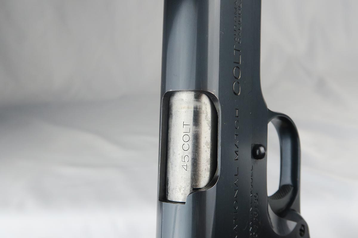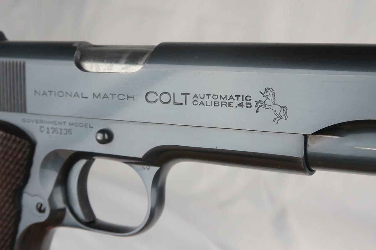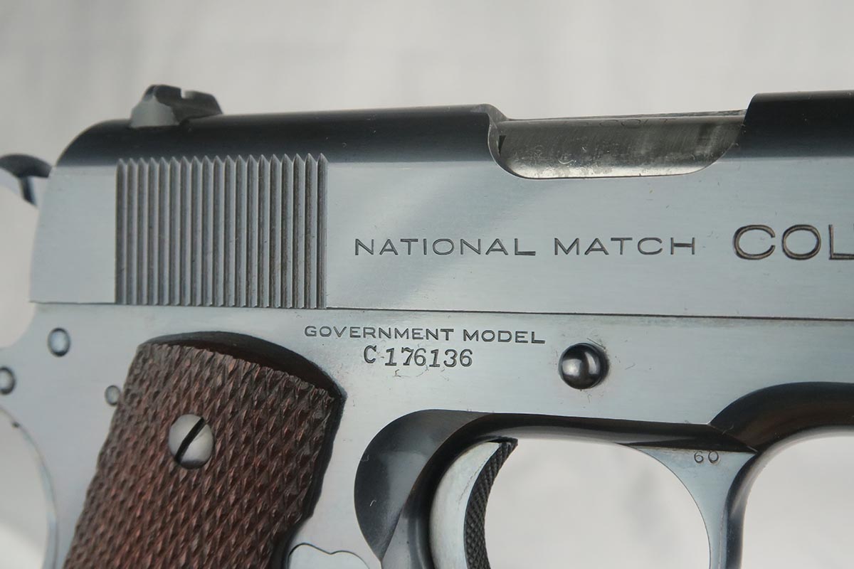 10/24/17 – This is a rare and mint example of a Commercial National Match 1911 Colt.  Made in 1934,   the gun is guaranteed to be all original parts and original finish.  There are not spots of rust or pitting.   Comes with original and correct two-tone magazine and wooded grips with strong checkering.   he bore is strong with a few spots of oxidation scattered within the grooves, but no rust or pits.   Excellent grip straps.  Correct 45 Colt marked barrel, with MB in circle proof.   This is a rare find for the advanced Colt collector.