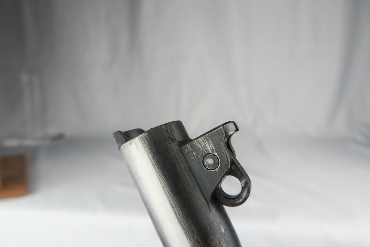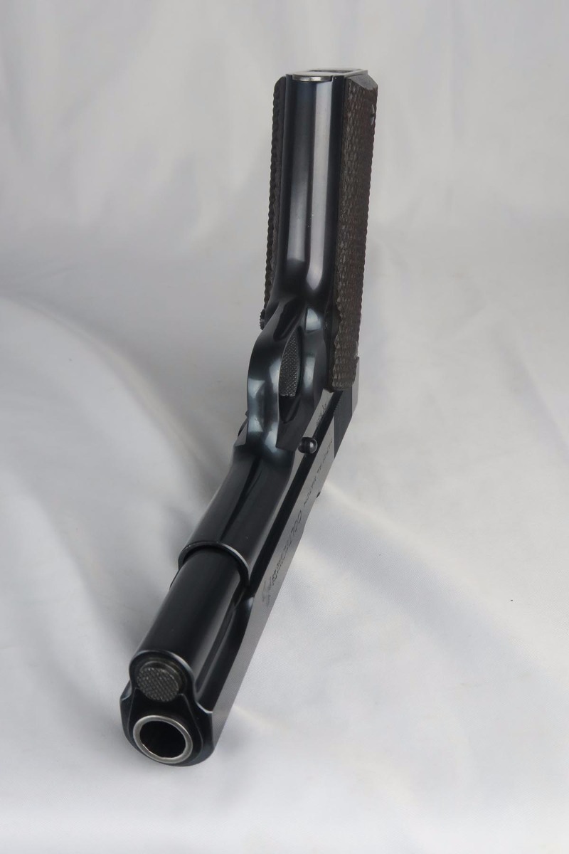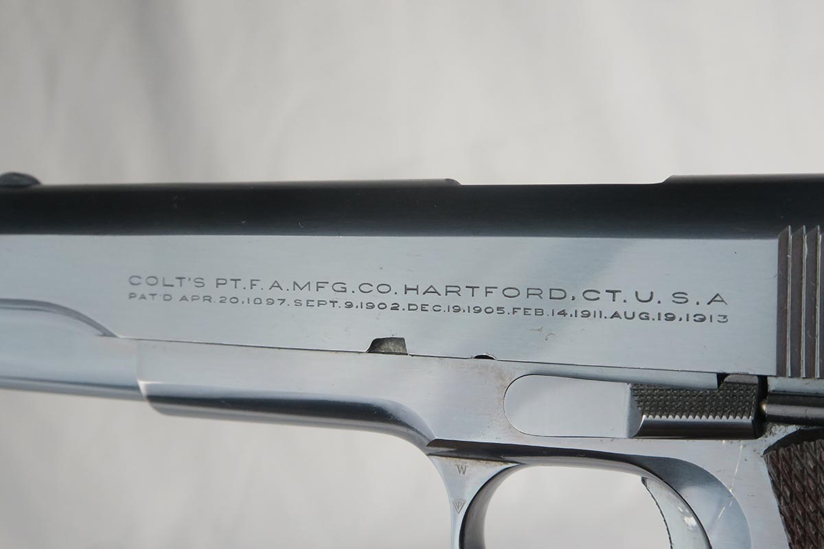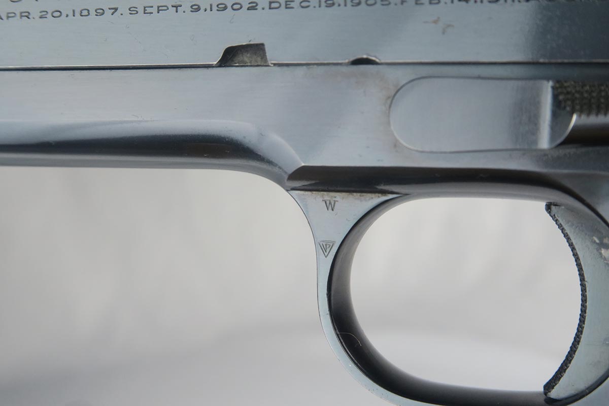 10/24/17 – This is a rare and mint example of a Commercial National Match 1911 Colt.  Made in 1934,   the gun is guaranteed to be all original parts and original finish.  There are not spots of rust or pitting.   Comes with original and correct two-tone magazine and wooded grips with strong checkering.   he bore is strong with a few spots of oxidation scattered within the grooves, but no rust or pits.   Excellent grip straps.  Correct 45 Colt marked barrel, with MB in circle proof.   This is a rare find for the advanced Colt collector.