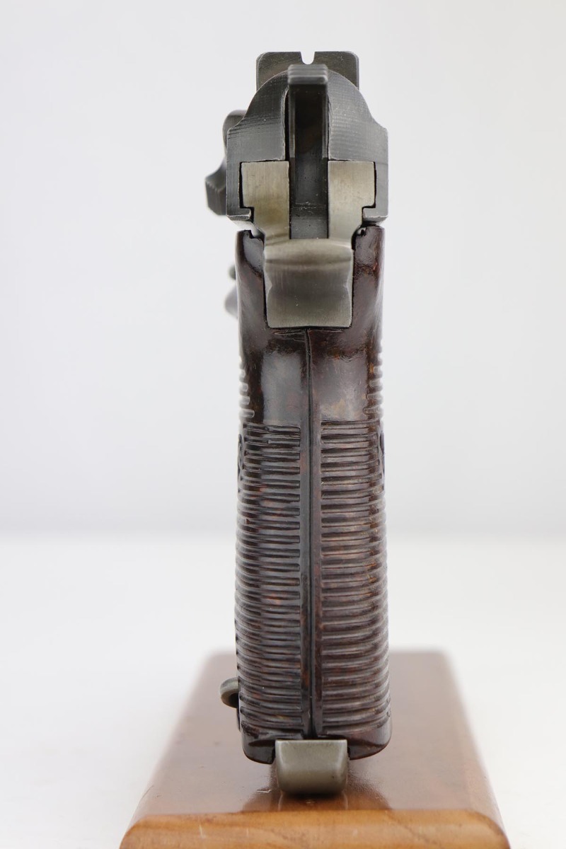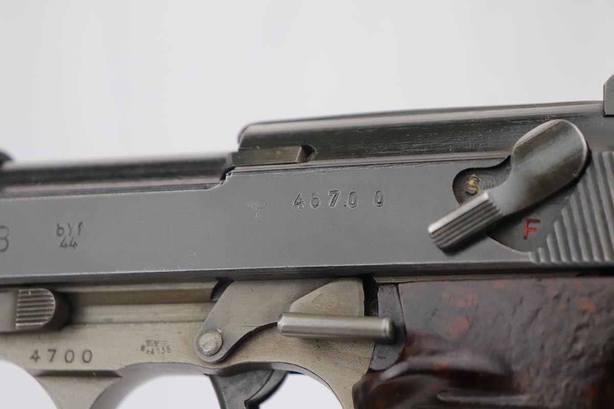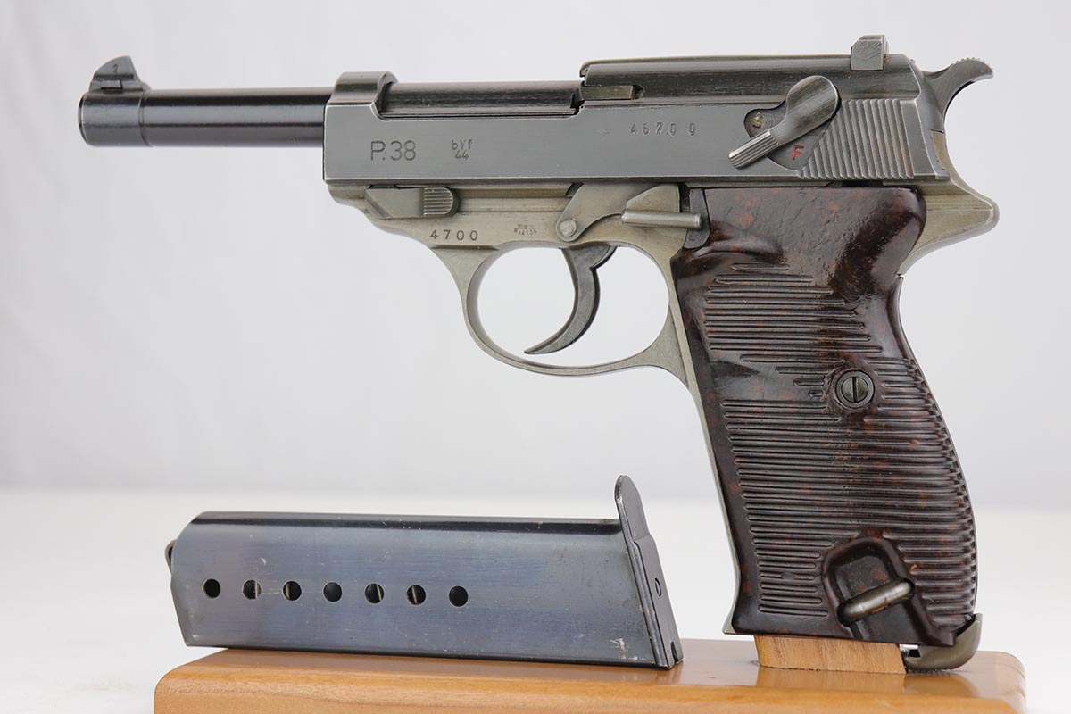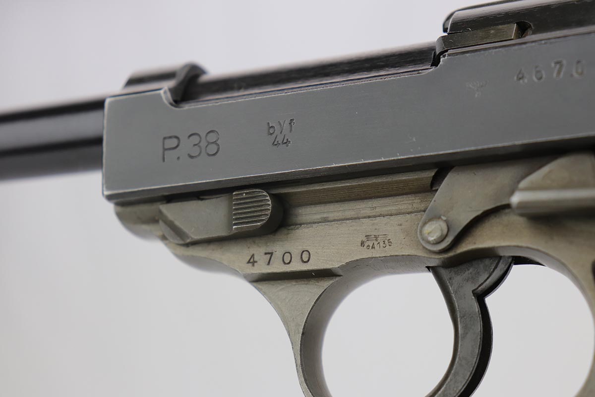 9/18/19 – This is one of the finest examples of a rare Mauser P.38 that we’ve encountered. It is Eagle over F marked, one of only 1500 produced, and is in minty, original condition. This pistol also has an interesting story to tell, as it appears the factory committed an error in the serialization process. The frame serial is 4700 with no suffix, while the barrel is 4700 in the ‘d’ block, and the slide is marked 46700, which is especially interesting as these pistols would never have had a five-digit serial. We do believe it to be 100% factory original though, and nearly impossible to upgrade as far as the condition is concerned. Mint bore and grips. Smooth mechanics.