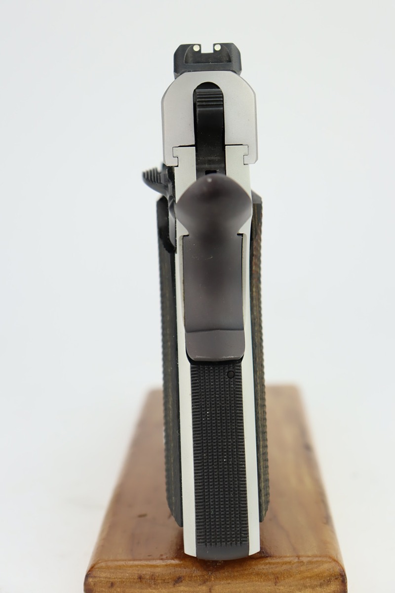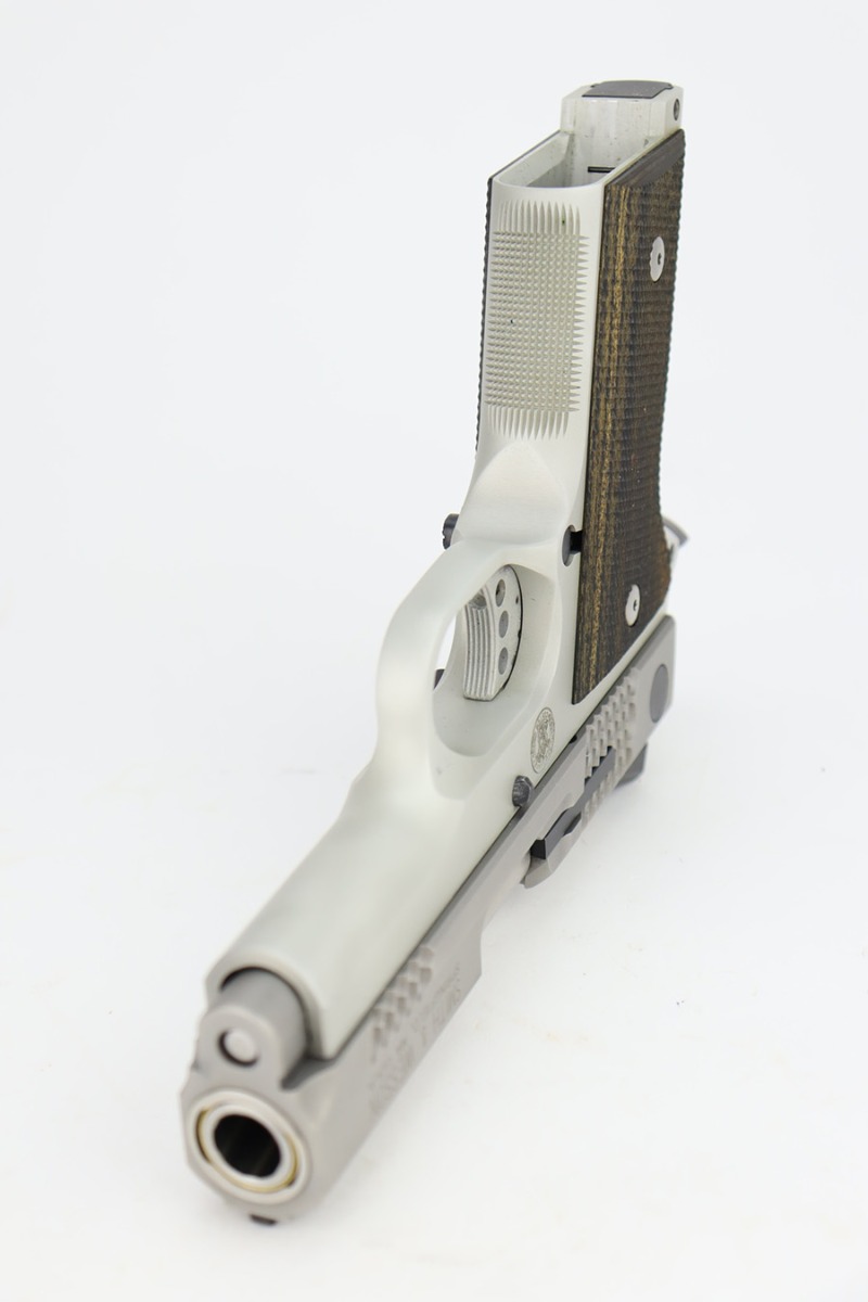 12/1/23 – This is an exceedingly rare and mint Smith & Wesson Performance Center Model 945, manufactured in 2000, and featuring an uncommon 3.75″ barrel. This example was the second made in an exclusive production run for RSR, and only 172 of this variation were ever produced. The gun is in flawless condition, retaining all of its stunning bead blast matte satin anodized finish. Terrific bore, and minty black and silver laminated grips. Comes with a S&W Performance Center carrying case.
