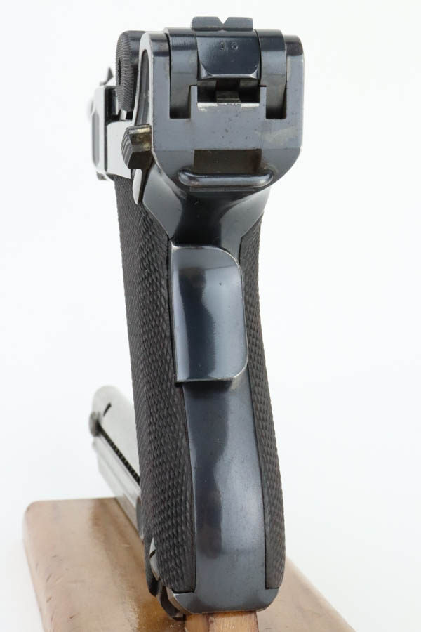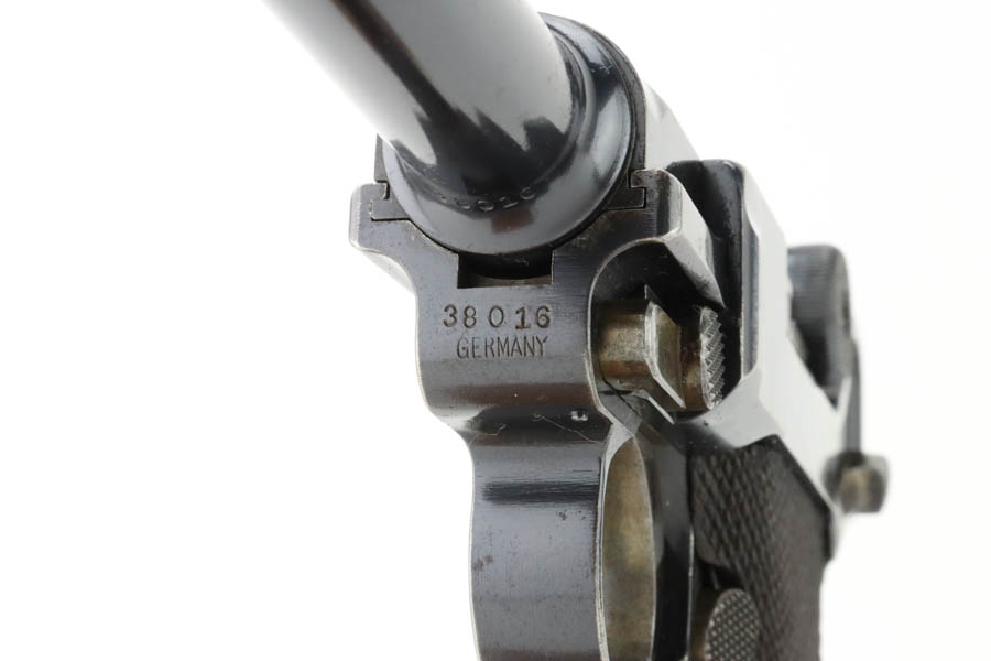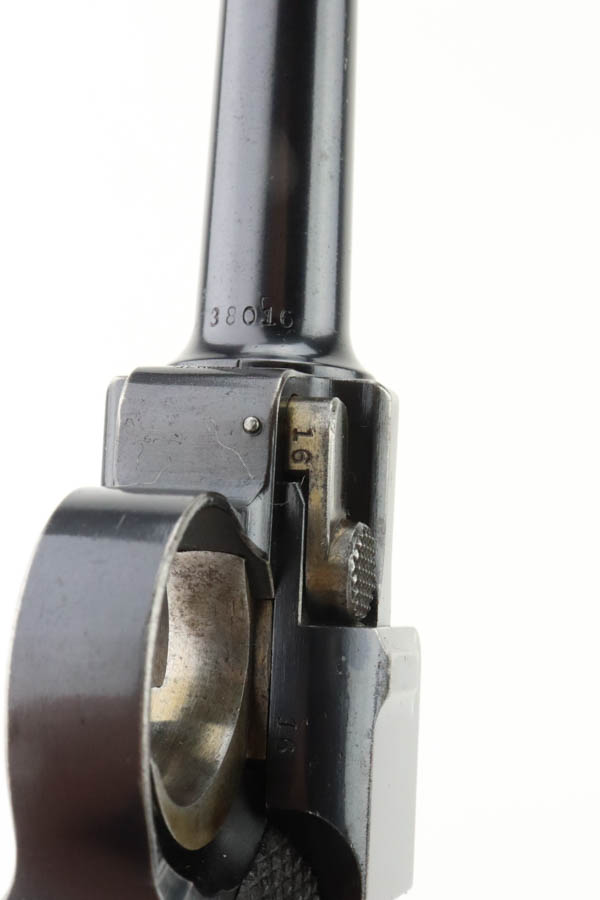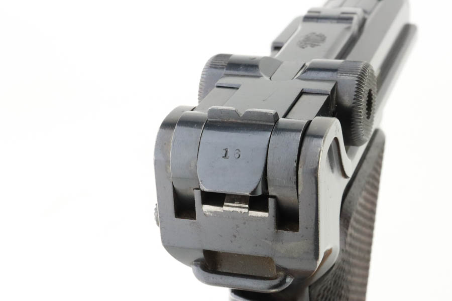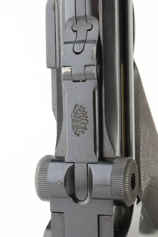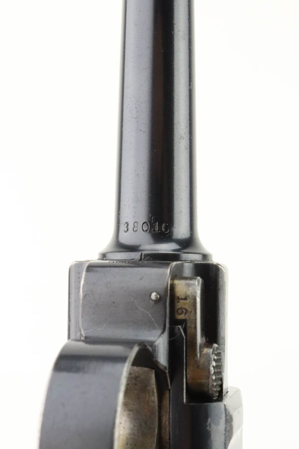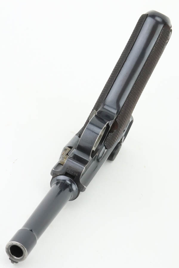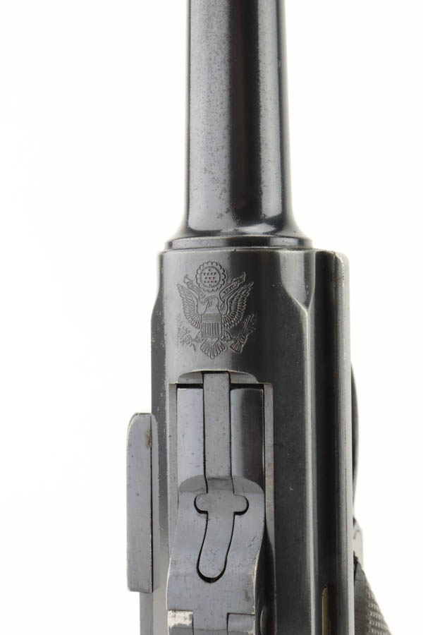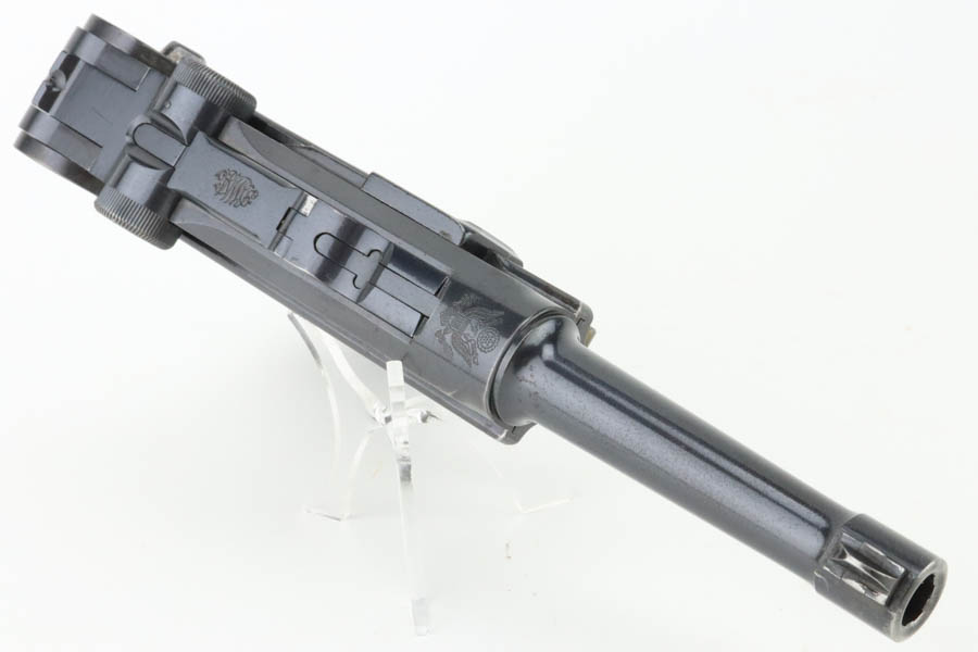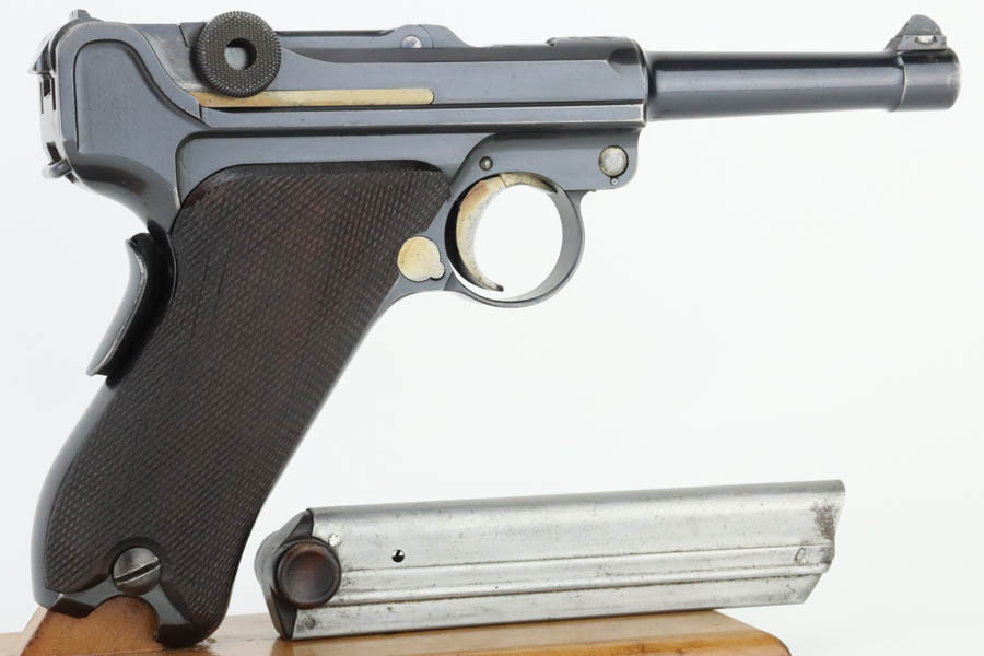 7/17/24 – This is a minty DWM Model 1906 Luger with American Eagle crest over chamber. It’s a scarce and desirable example as it’s chambered for 9mm Luger with a 4″ barrel, one of about 3,000 produced. The gun has retained about 97% of its original finish with just very minor muzzle and high edge wear. Fitted with minty wood grips and comes with a blank wood bottom magazine. The bore has good rifling with light pin-pricking throughout.
