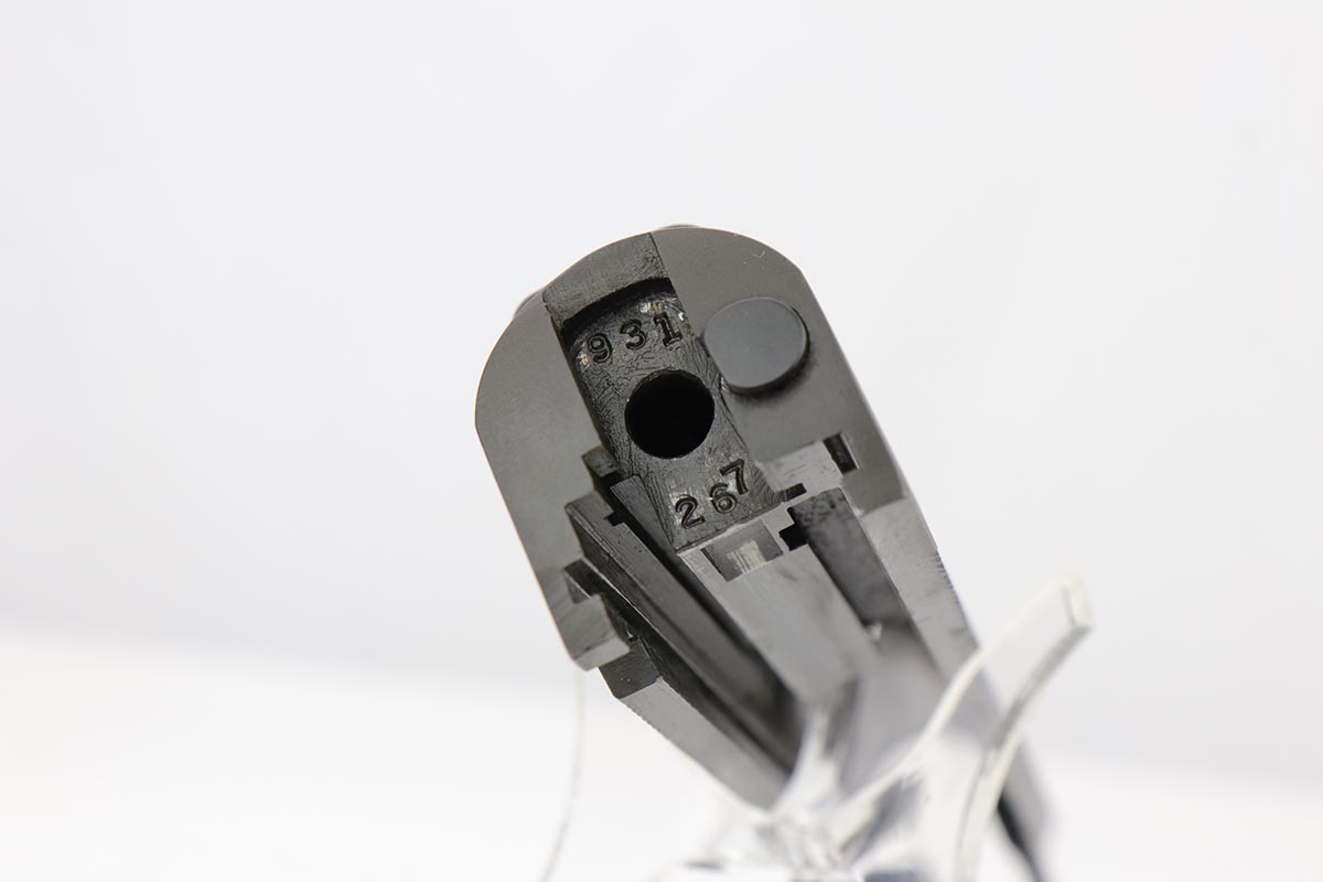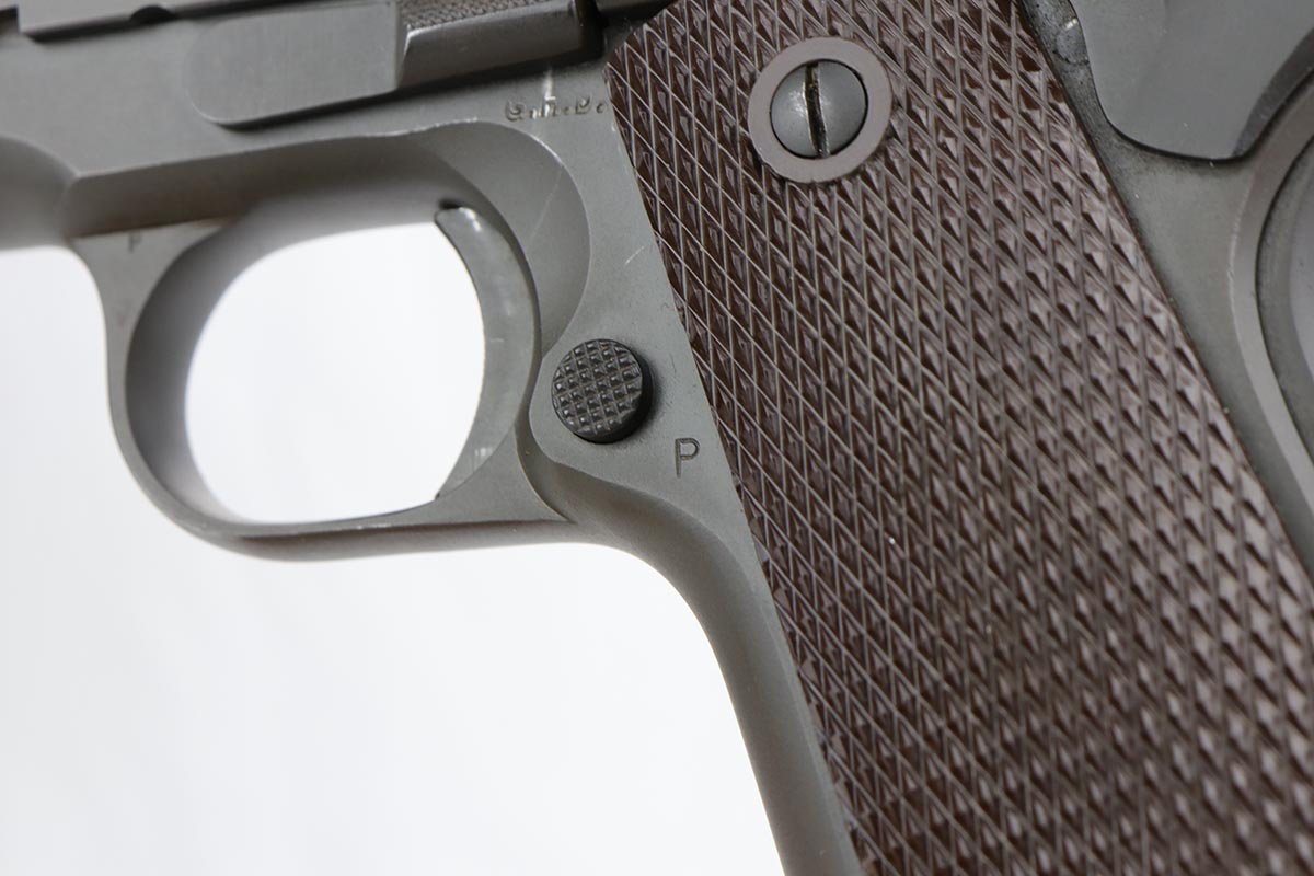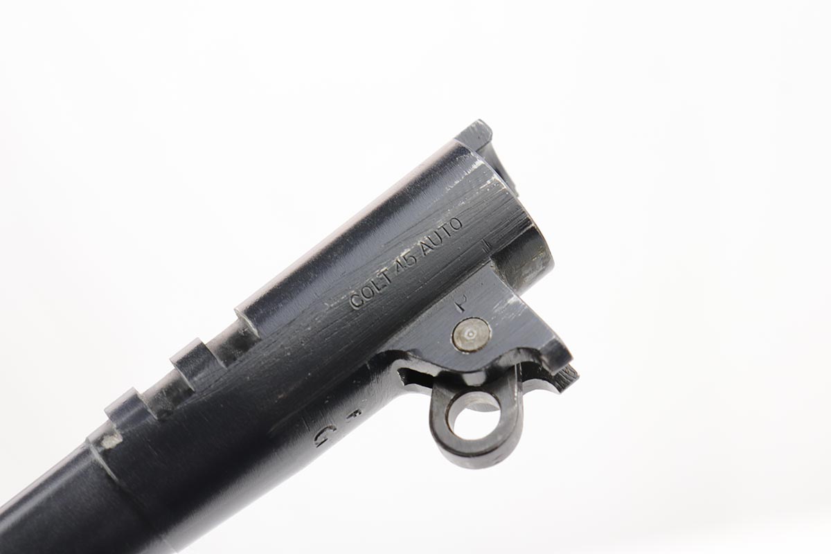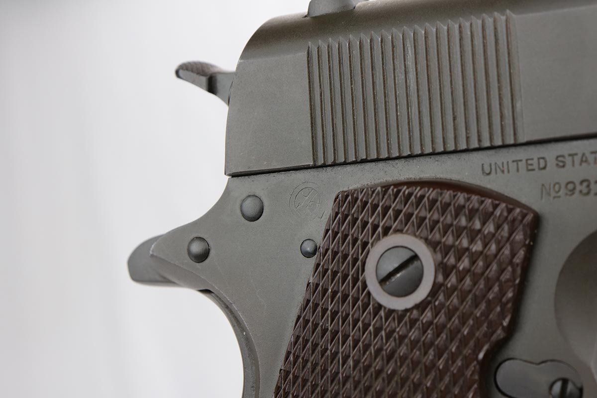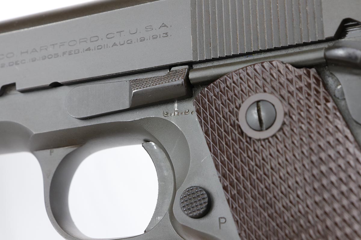 11/20/19 – This is probably the finest example we’ve encountered of a rare military/commercial variation of the Colt 1911A1 from 1943. The more commonly cited examples feature commercial serial numbers that are peened or bunged and replaced with a military serial. There were about 6,500 or so of those produced, but the example listed above is a less commonly seen variant with military serial, military inspection proofs, but commercial slide with the matching serial to the frame. This example is very close in serial to documented examples from Meadows’ book on Colt military automatic pistols. This pistol has about 98-99% of the original parkerized finish remaining, and finding a finer example would be difficult. It has the GHD inspection proof on frame, as well as P proofs on slide and frame. Correct Colt barrel with large ‘G’ proof under lug. Excellent bore and grips. Commercial mag marked ‘COLT .45 AUTO’ on the bottom.