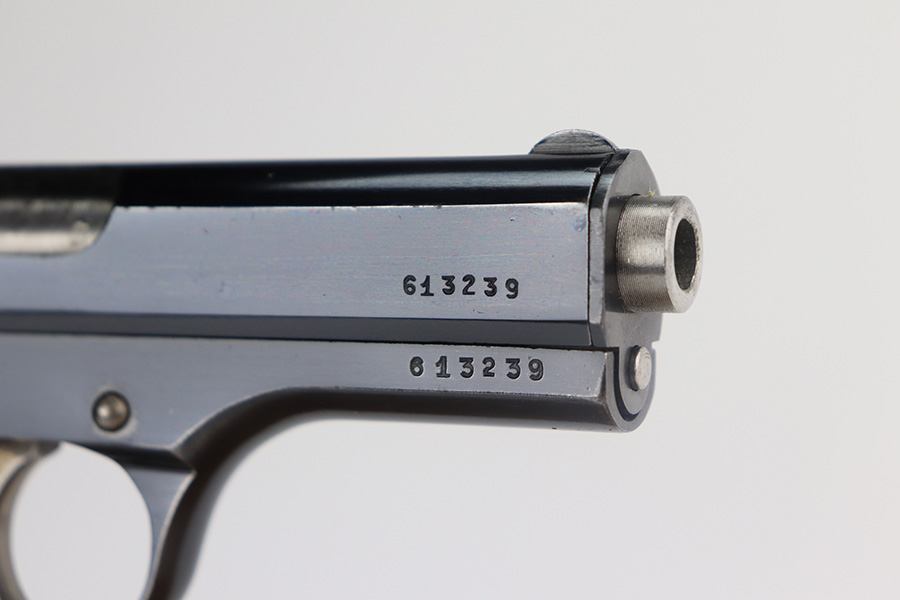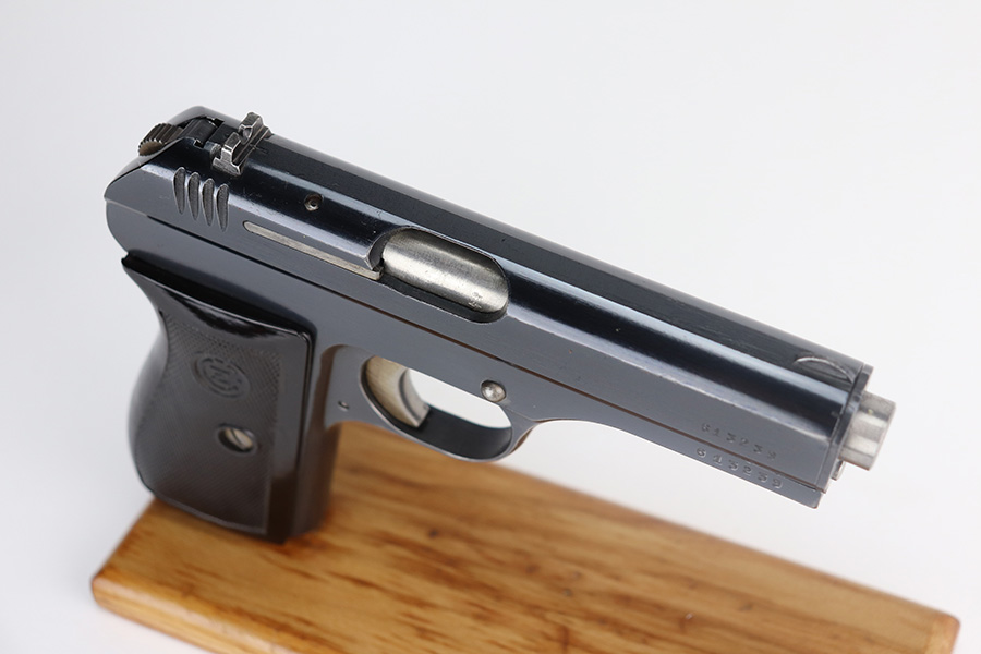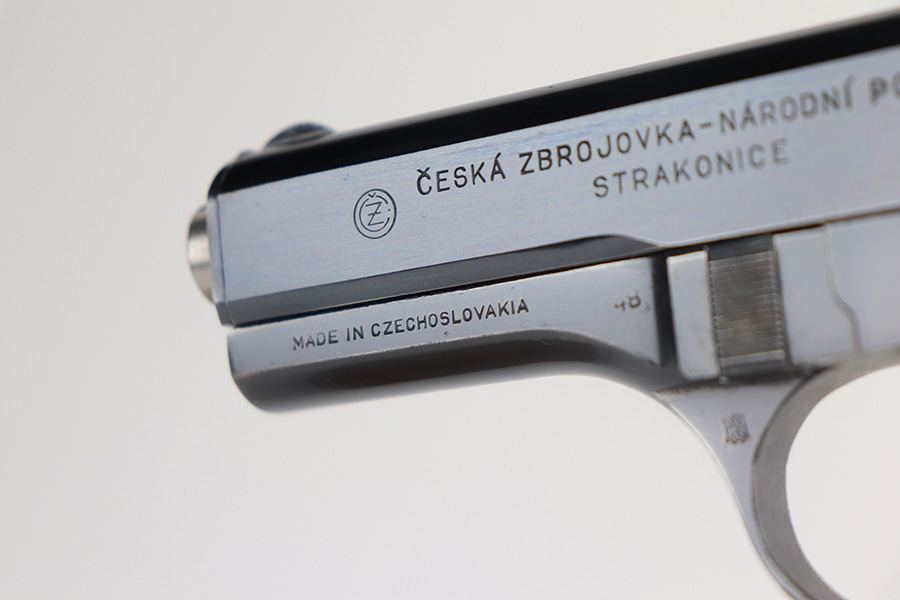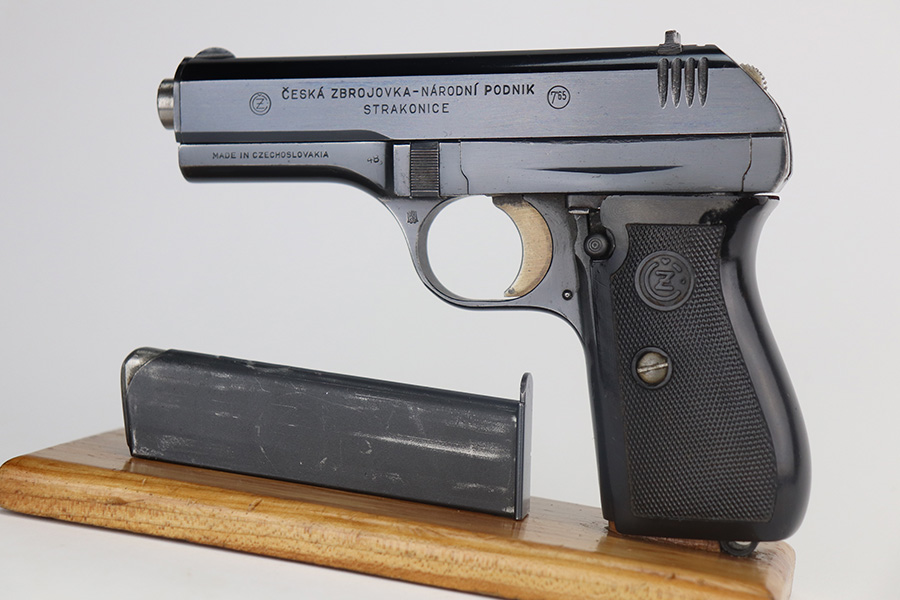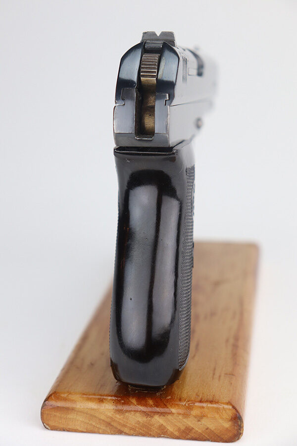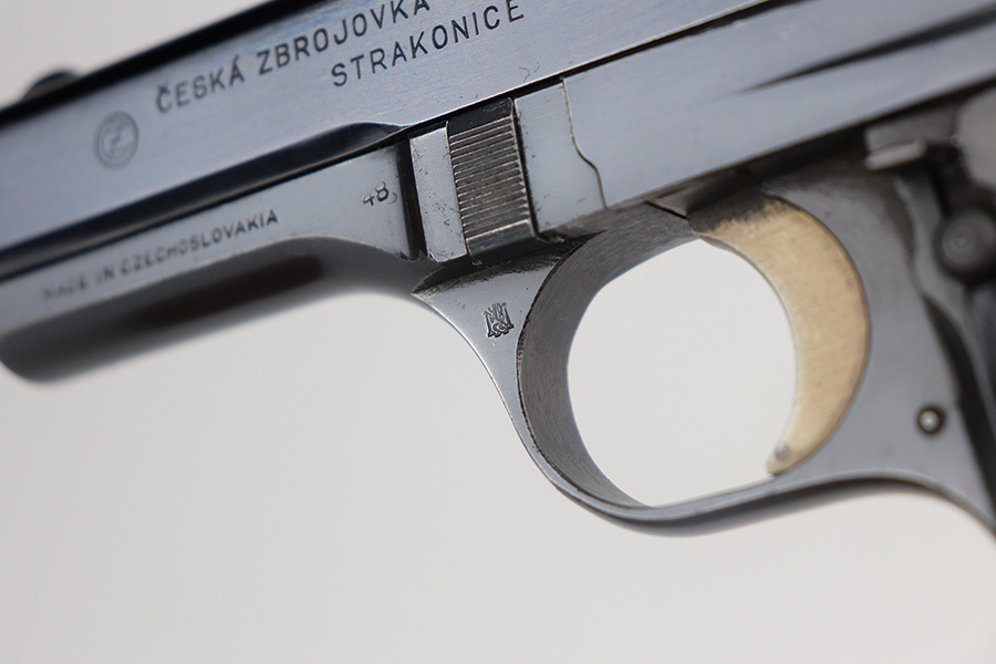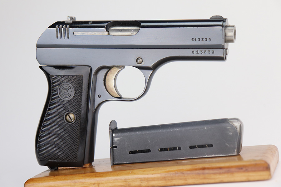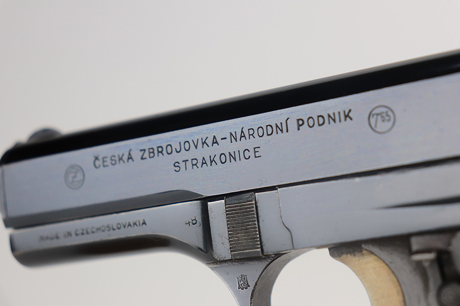 5/26/21 – This is a rare commercial CZ 27 manufactured in 1948. It is all matching and has the proper Czech proofs. It has retained more than 98% of its original bluing. There is just a hint of wear around the high edges of the slide and a few very tiny handling marks on the front strap. Comes with an excellent grip and a proper magazine. The bore is minty. The grip fits a little loose and the magazine is a little hard to get out.